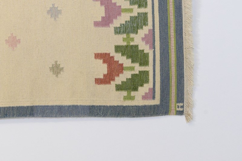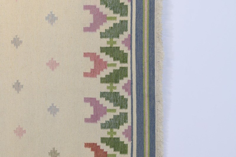 A really nice example of a floral-patterned Swedish kilim in tones of cream, blue and green with hints of pink and purple. This piece hasn't been stored correctly throughout its life and shows signs of damage to the top of the images. We have tried our best to professionally remedy this however the sings of damage remain. This has been reflected in the price. Sweden circa 1960.