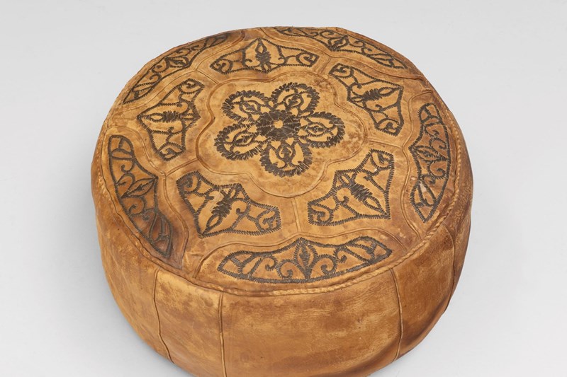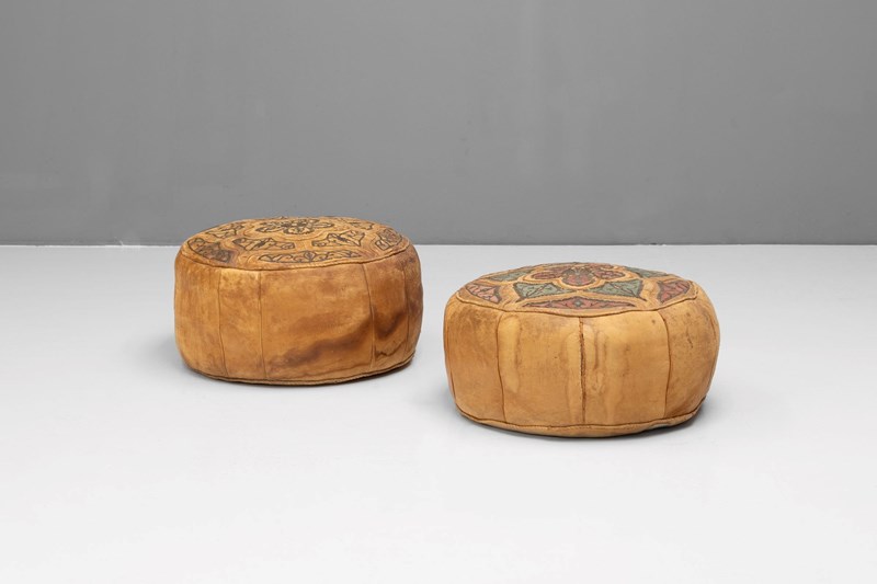 Pair of decorative leather covered pouffes with embroidered decoration. Circa 1930.