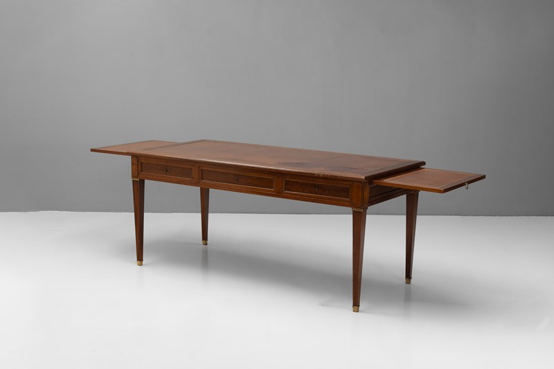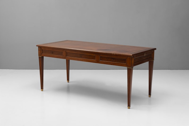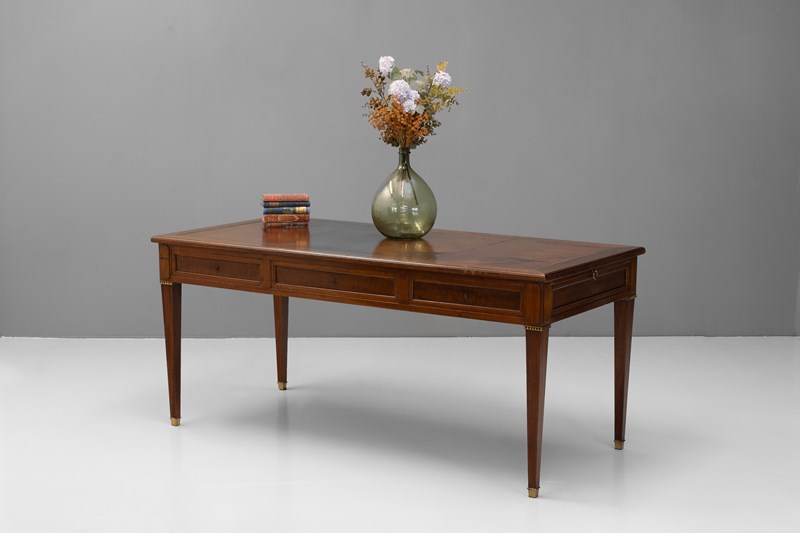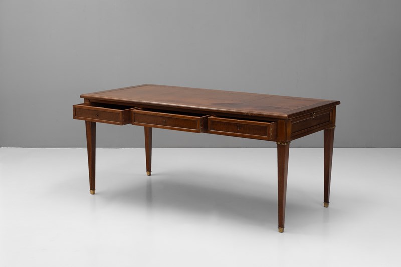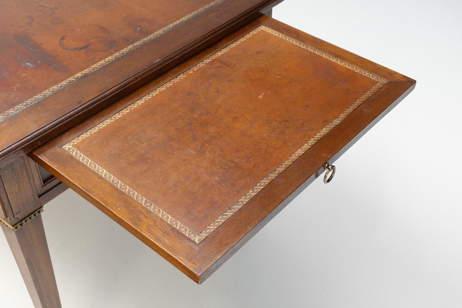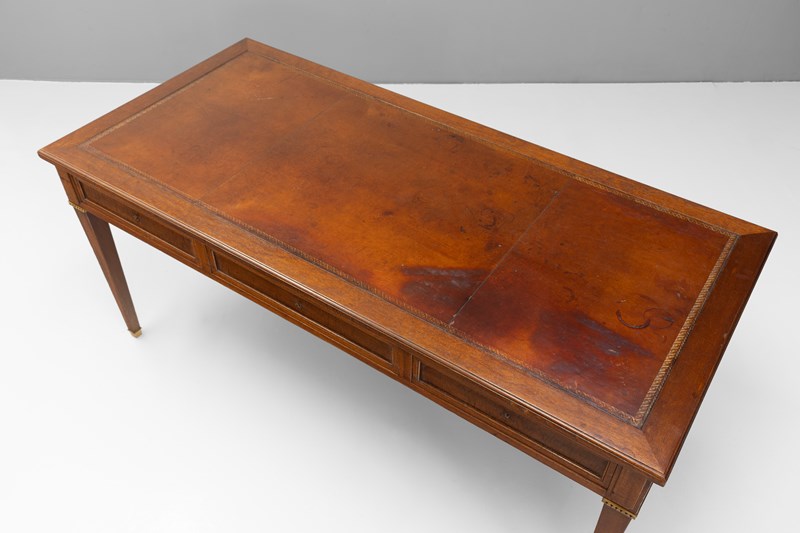 Large three drawer late 19th century mahogany writing table with original leather top. Two slides with original brass mounts on tapered legs. Re-finished in great condition. France circa 1900.