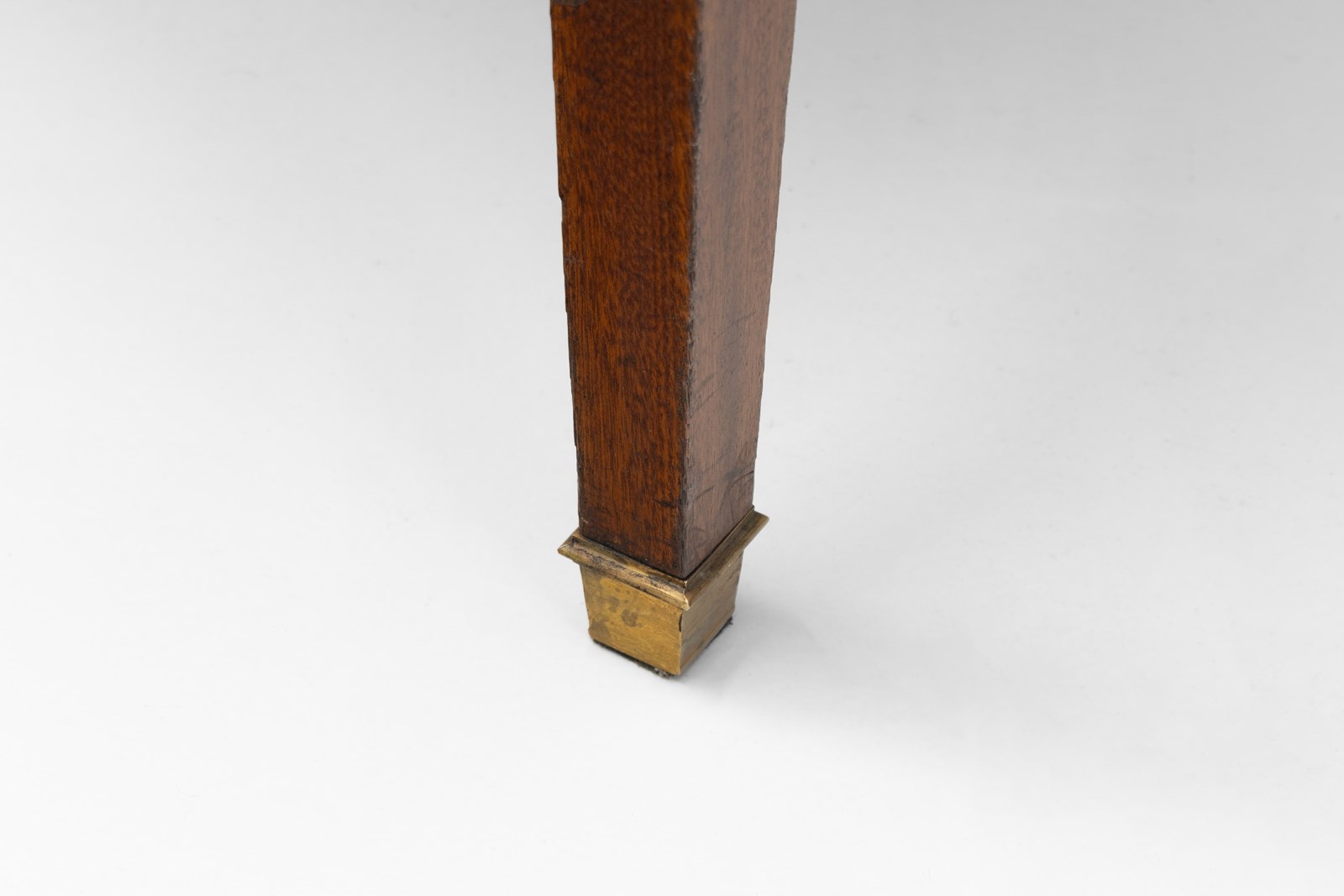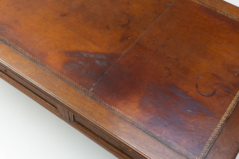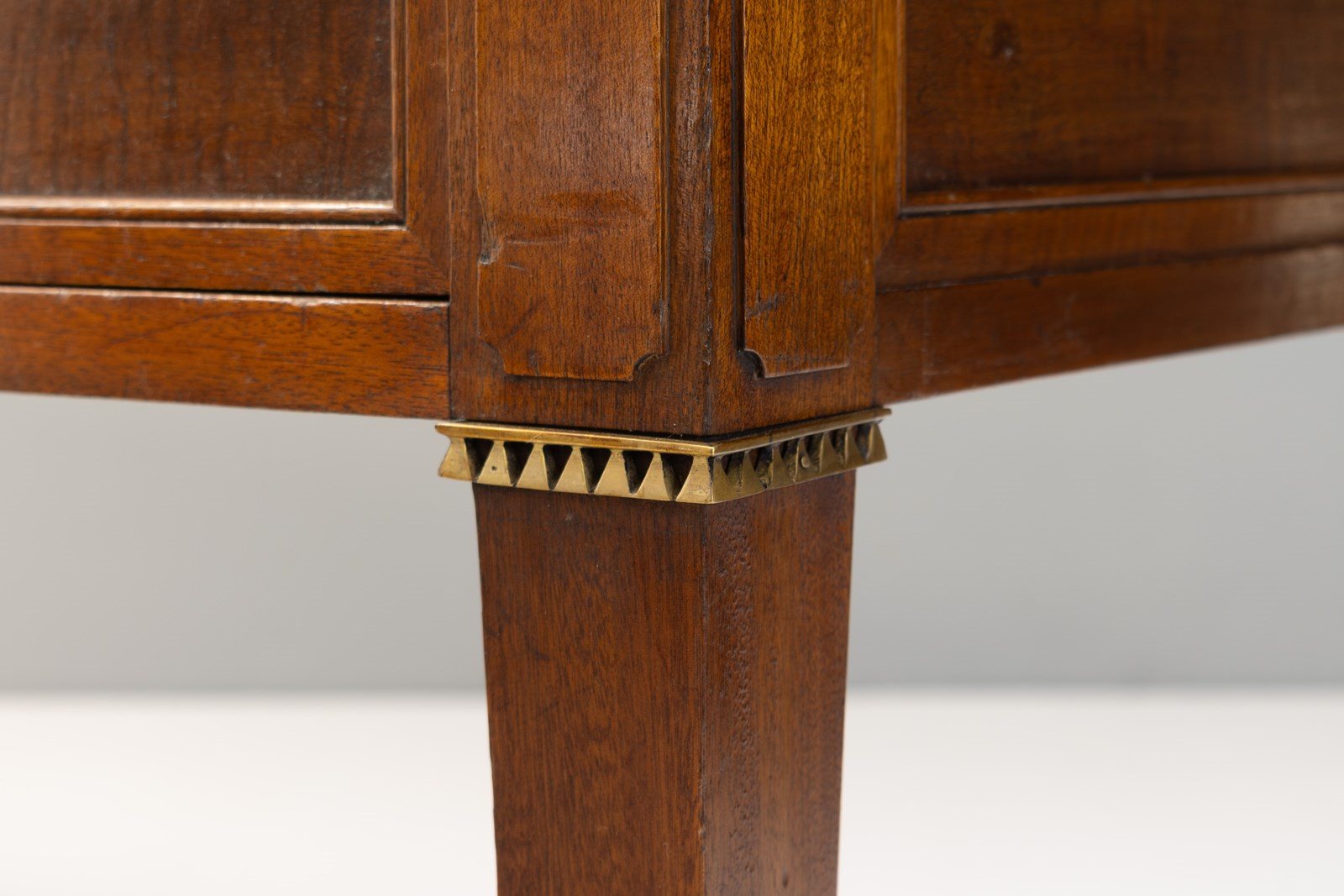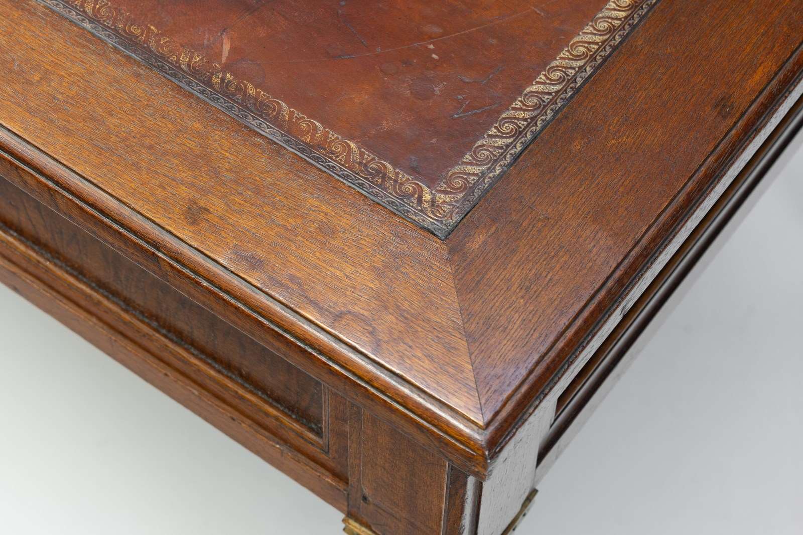 Large three drawer late 19th century mahogany writing table with original leather top. Two slides with original brass mounts on tapered legs. Re-finished in great condition. France circa 1900.