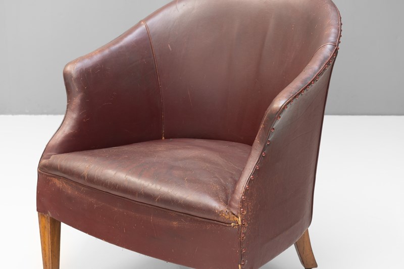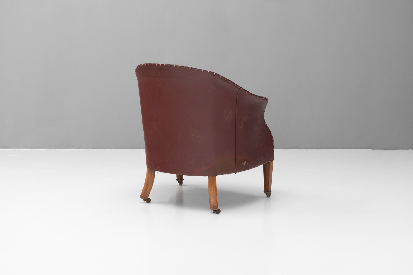 Tub chair on tapered legs in original worn burgundy leather. Circa 1920.