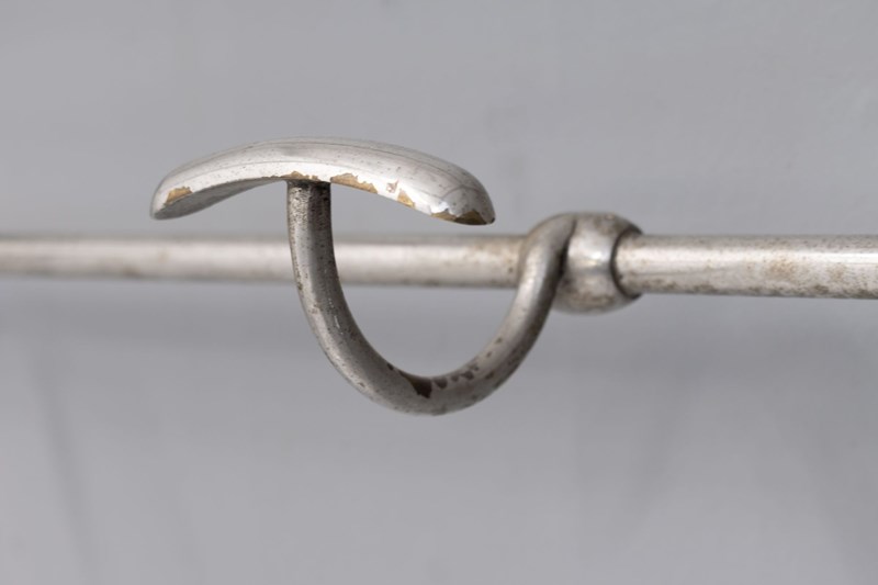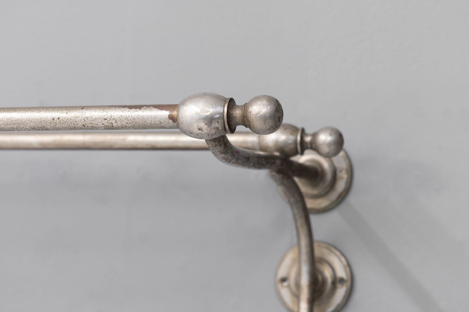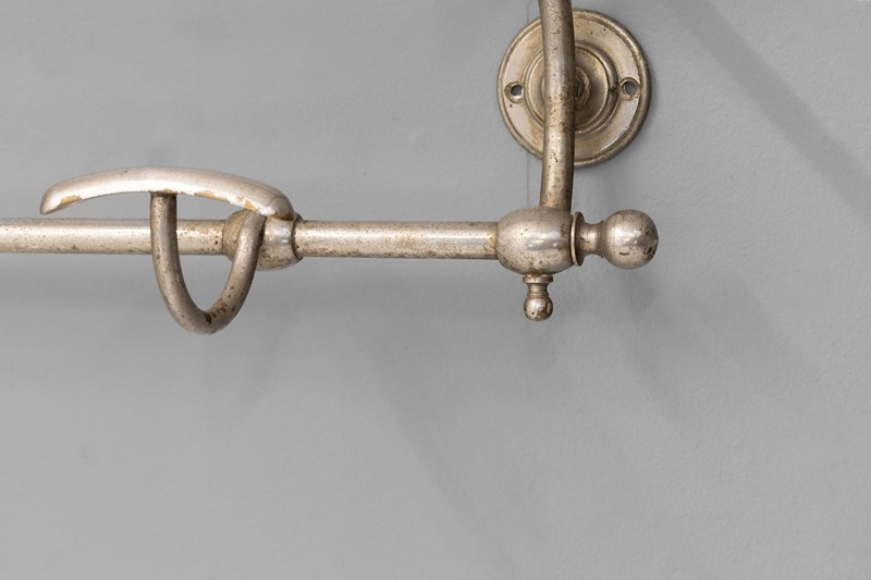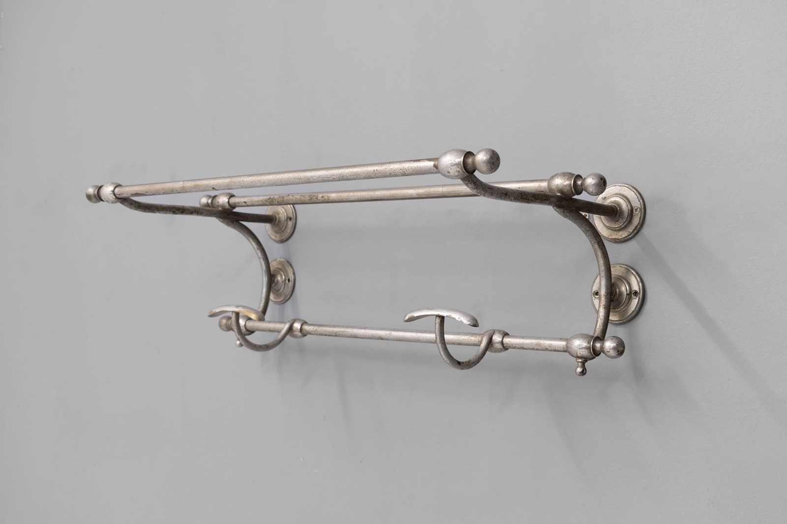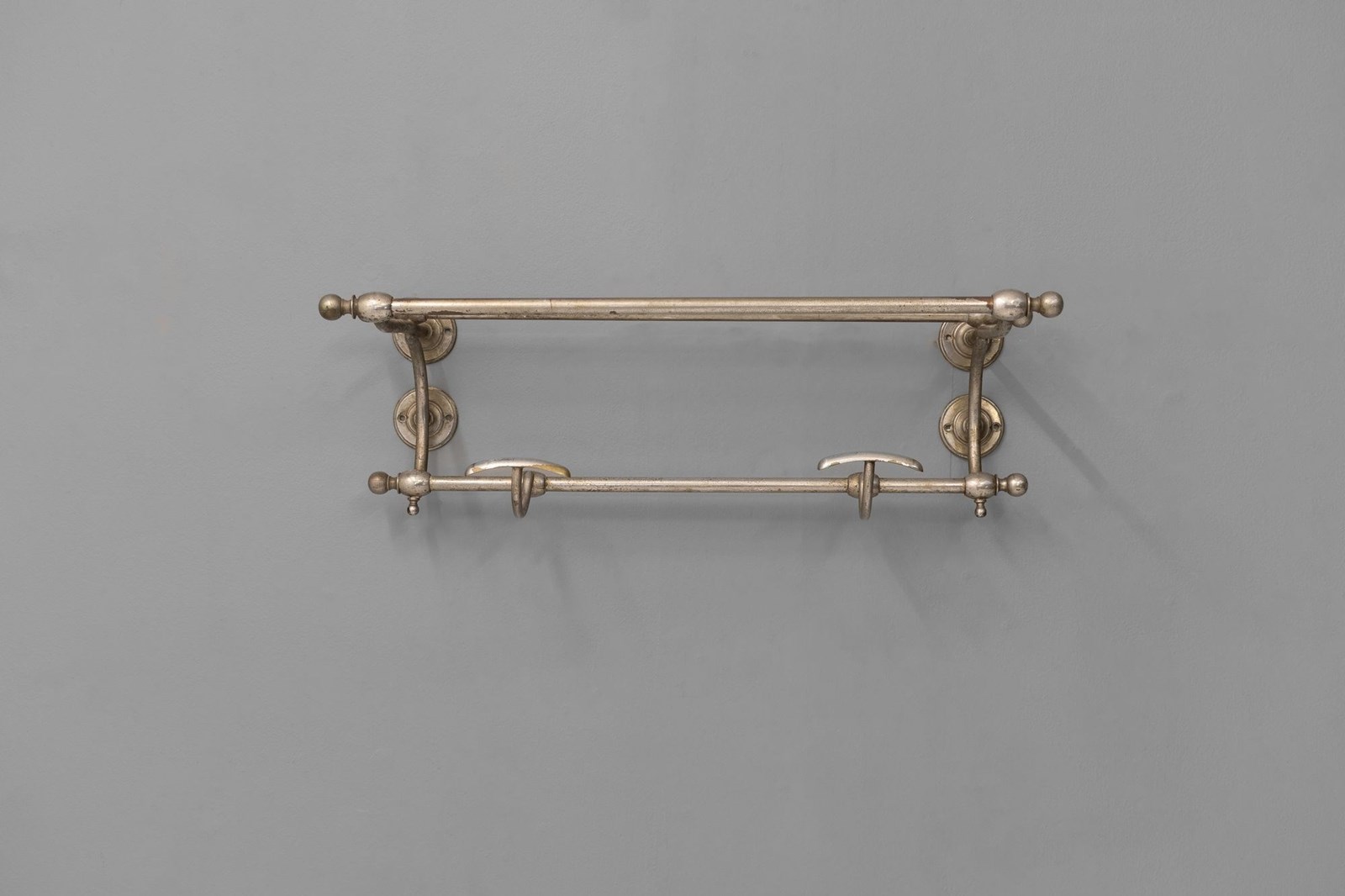 Small size chrome luggage rack with two fixed coat hooks. In aged condition. U.K circa 1900.