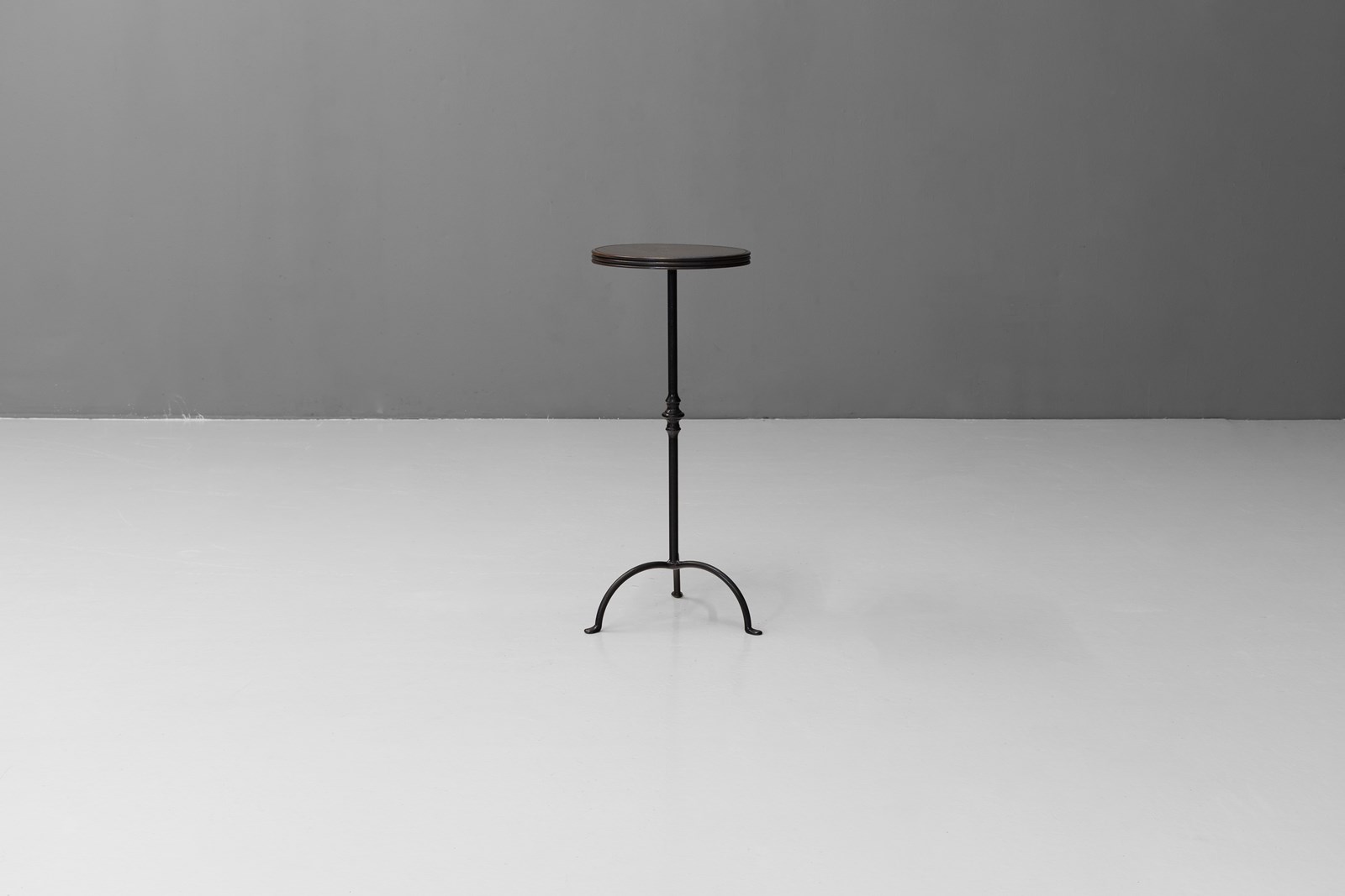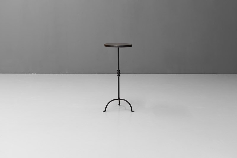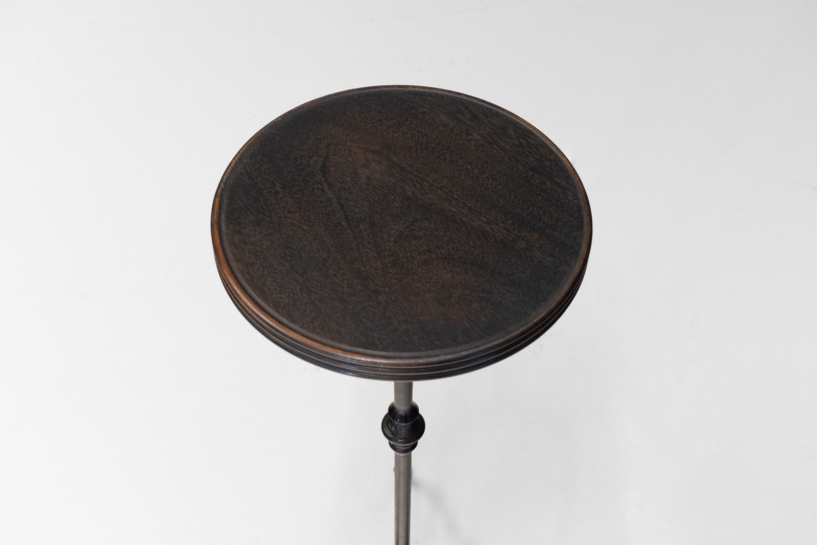 Newly manufactured martini table with reclaimed mahogany top on wrought iron tripod leg base. Circa 2025
