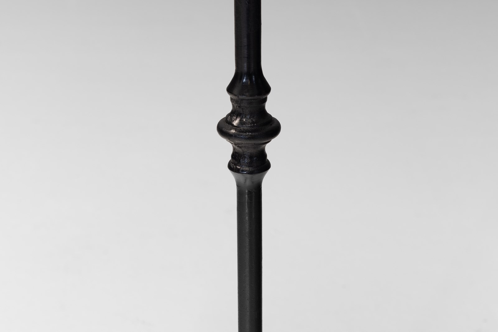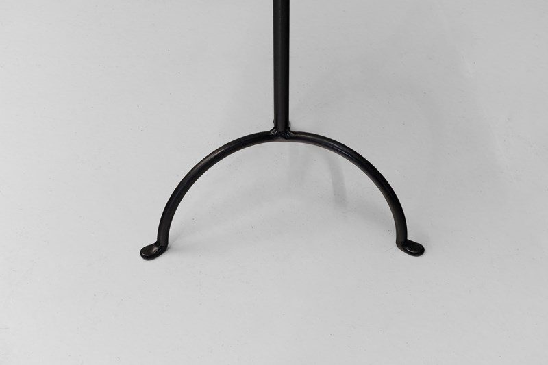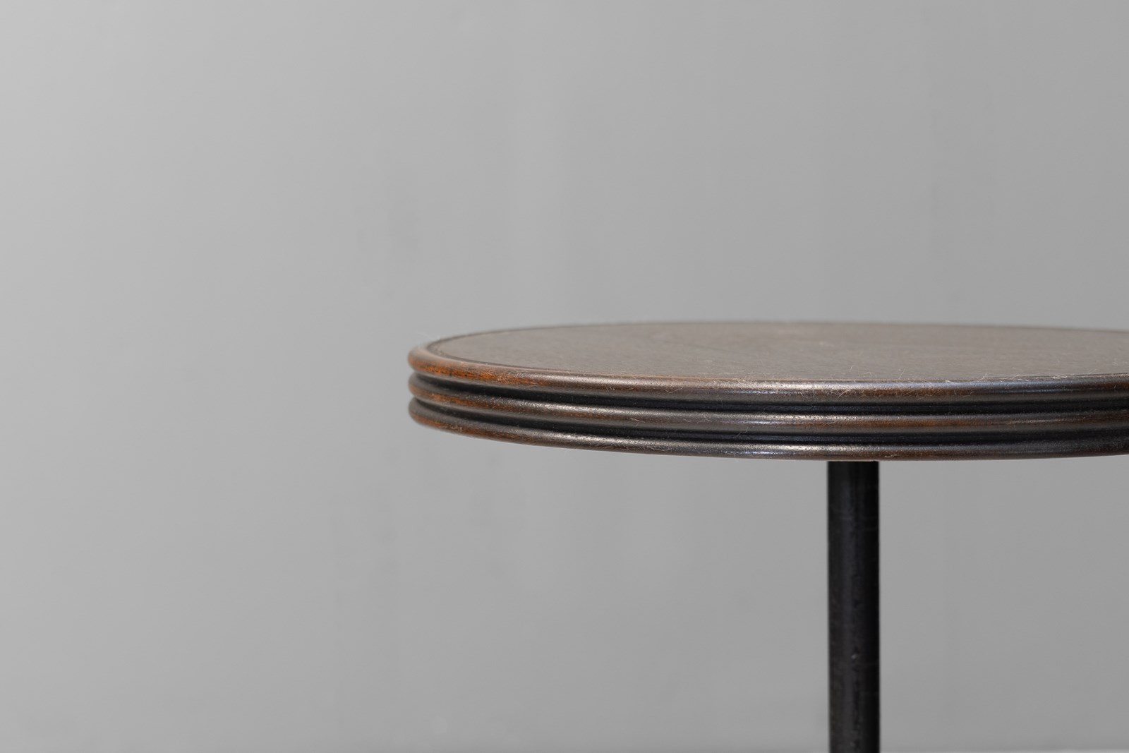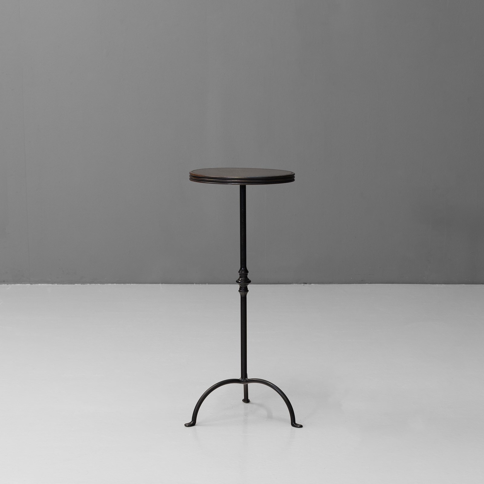 Newly manufactured martini table with reclaimed mahogany top on wrought iron tripod leg base. Circa 2025