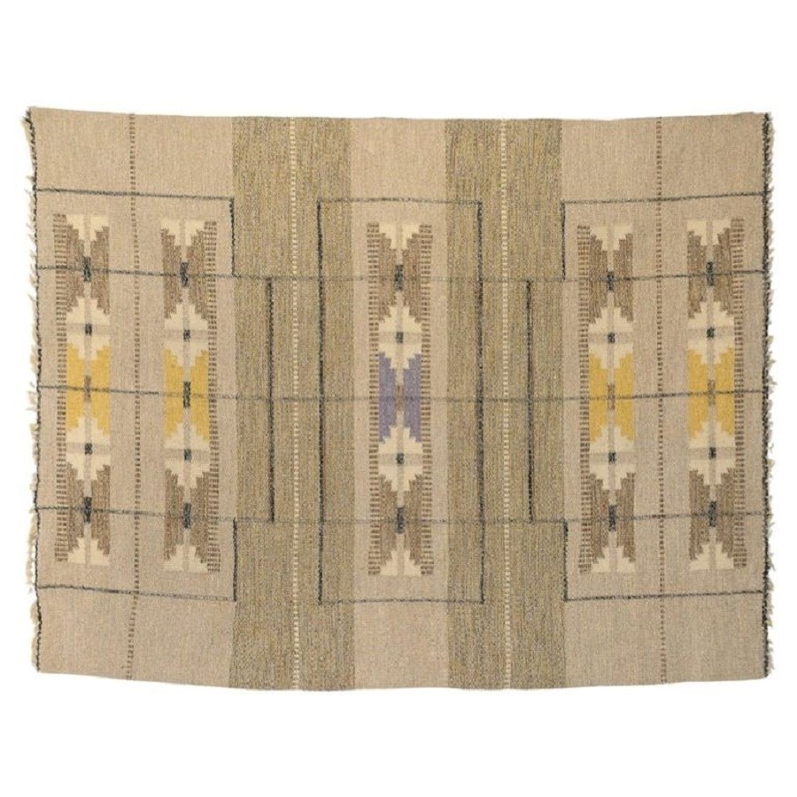 Mid-Century Swedish kilim with a neutral base tones with hints of yellow and purple in a geometric pattern typical of the period. Fine quality wool