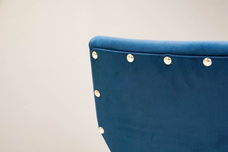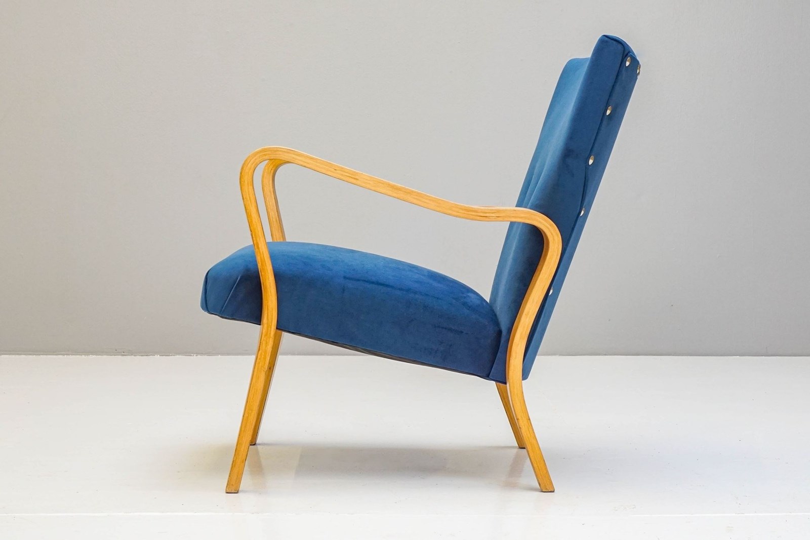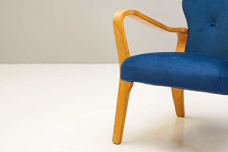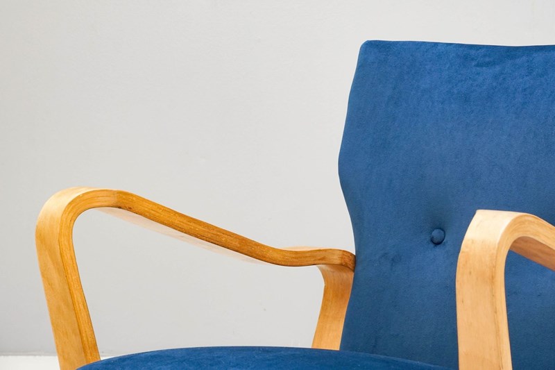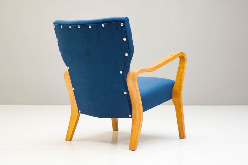 Shapely bent ply armchair by Eric Lyons. Recovered in blue velvet. Stripped and polished.