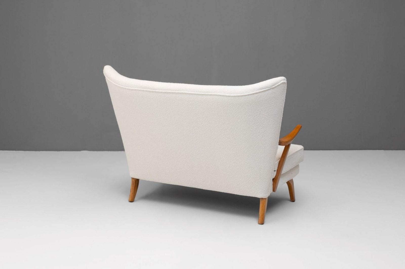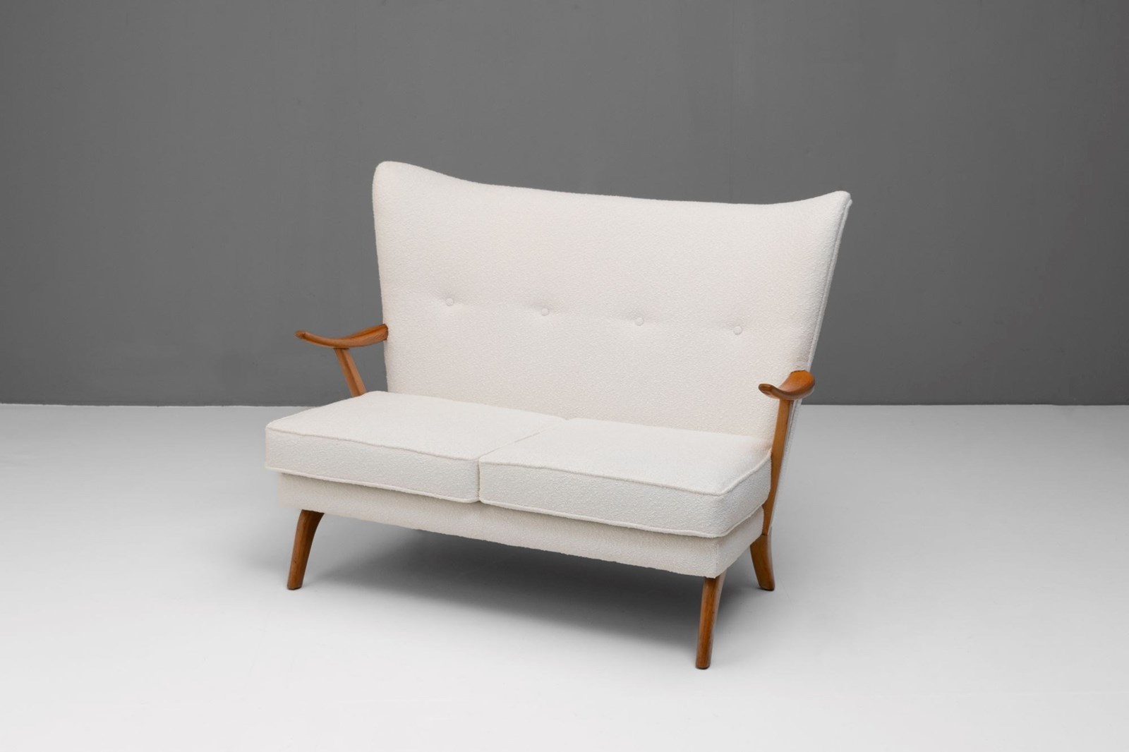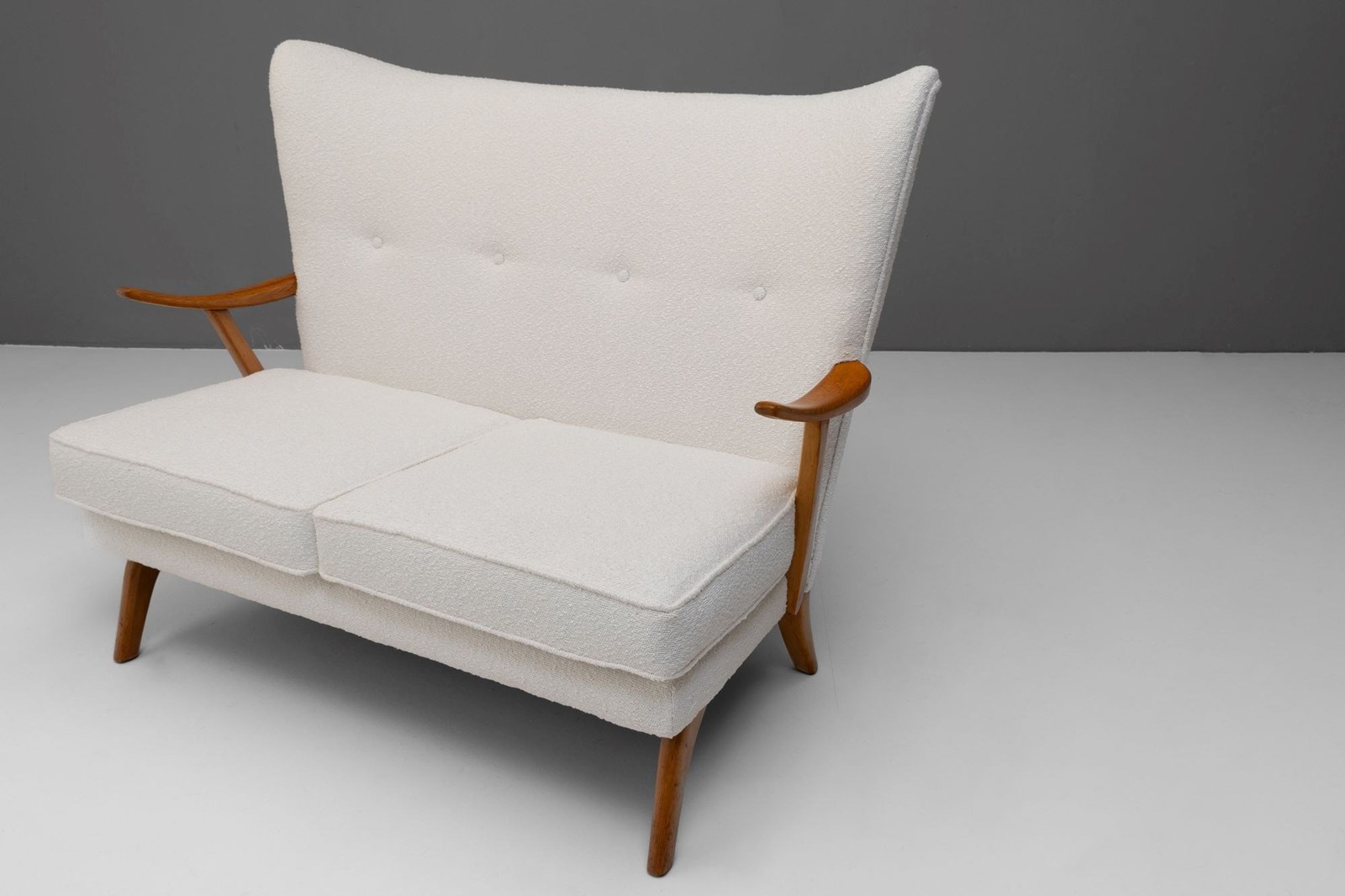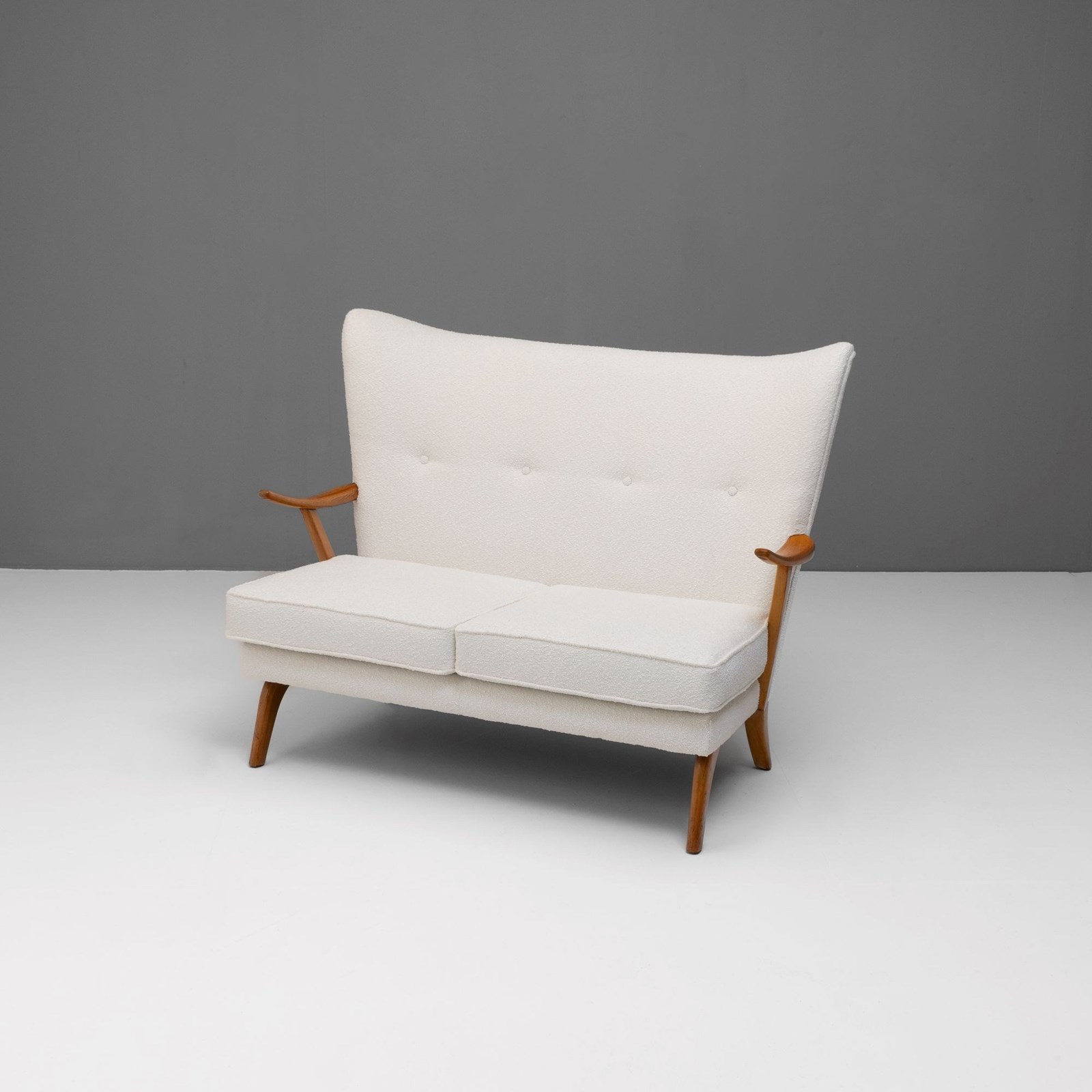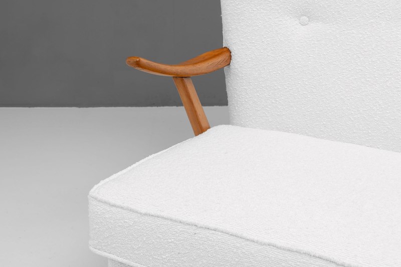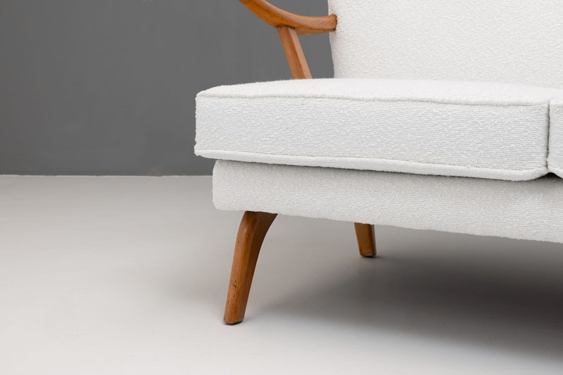 Mid-Century Bambino Sofa by Howard Keith, produced by HK Furniture. Solid beech frame, newly upholstered in boucle and re-finished show wood. Circa 1950.
