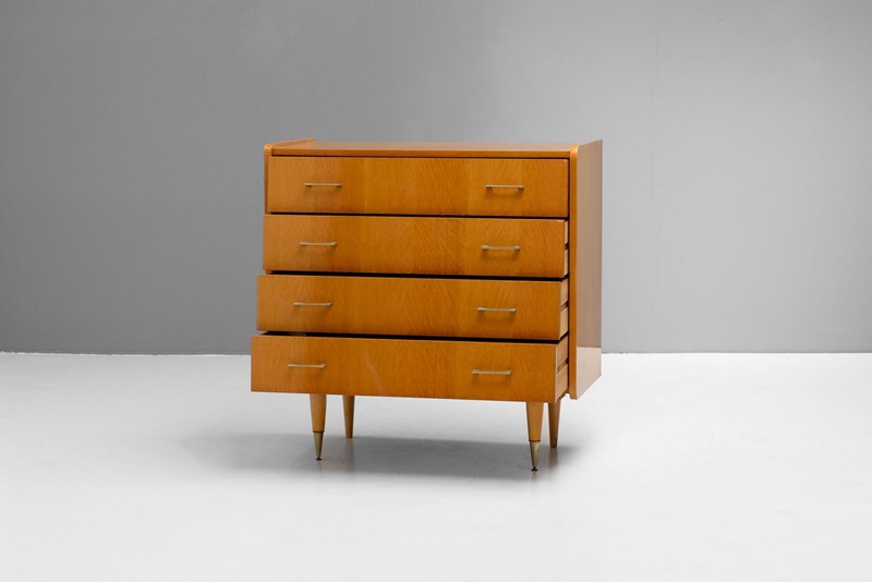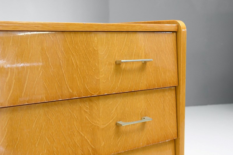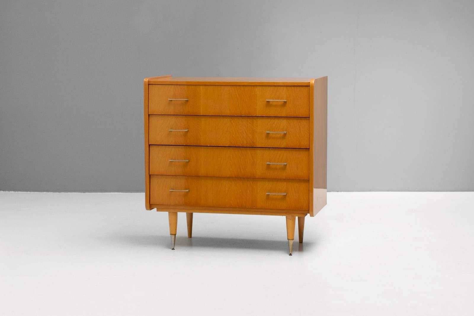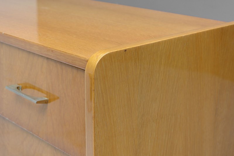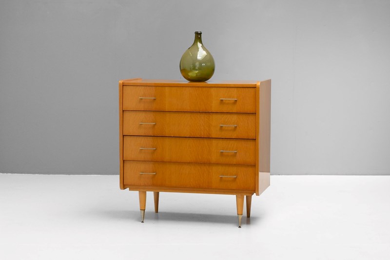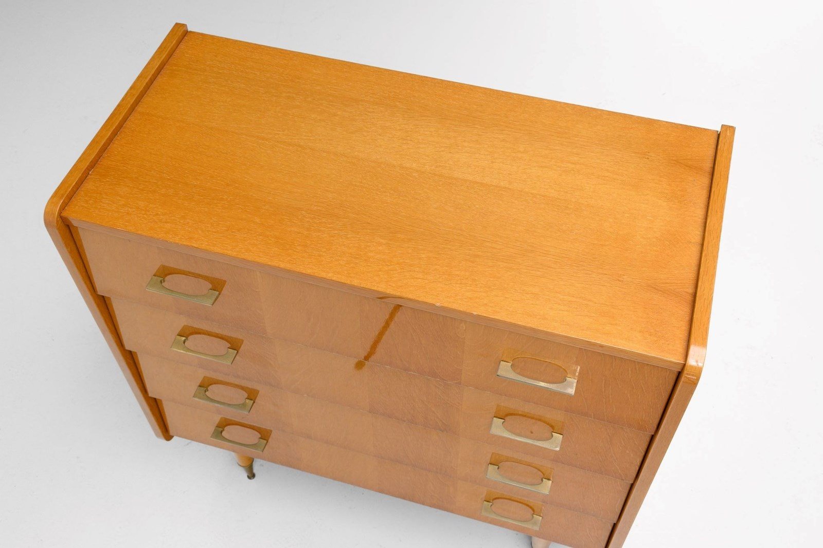 Mid-Century French chest of drawers with waterfall drawers and brass handles.