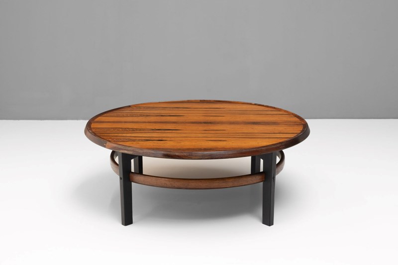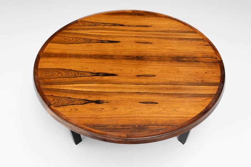 Large Rosewood topped mid-century coffee table with later painted pine legs. Some fading to the table top.
