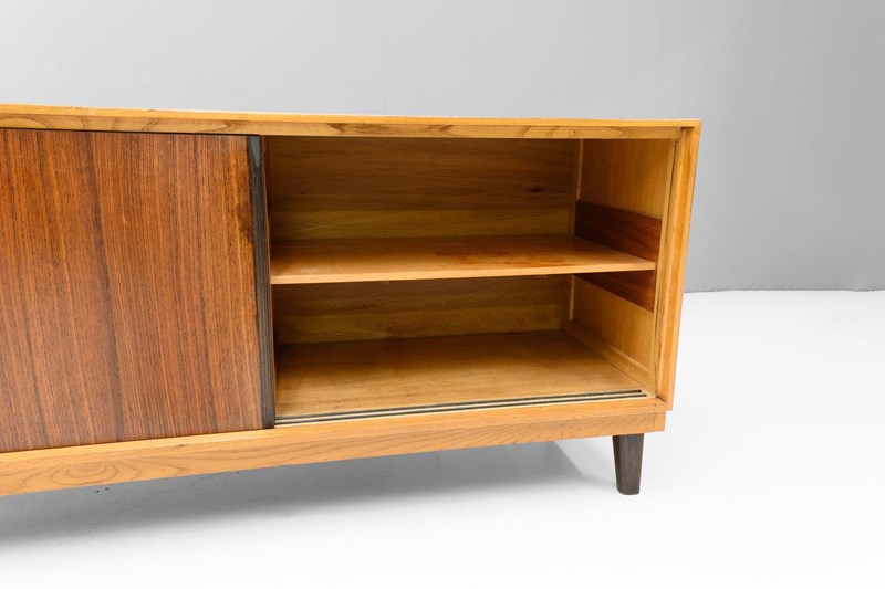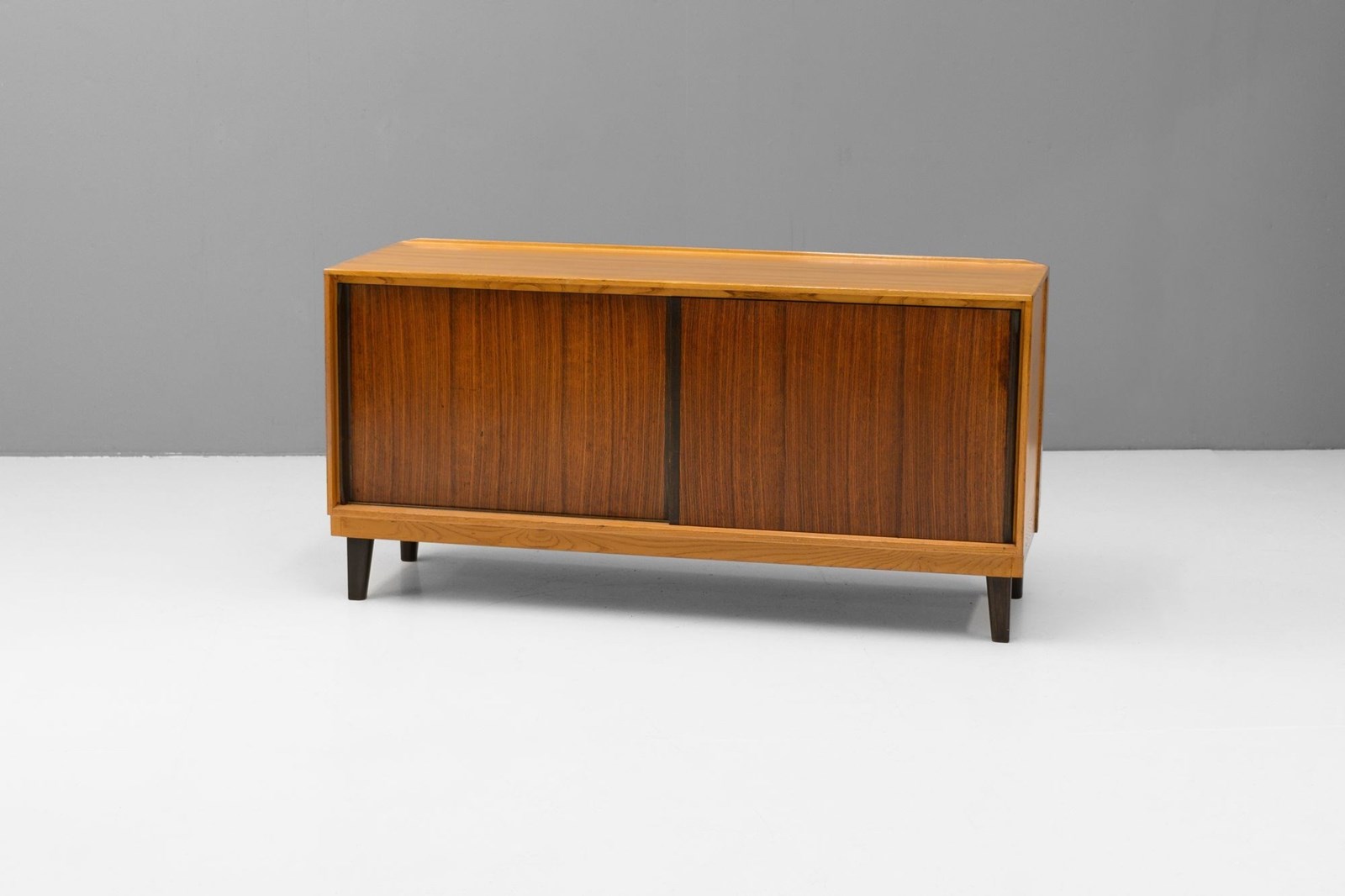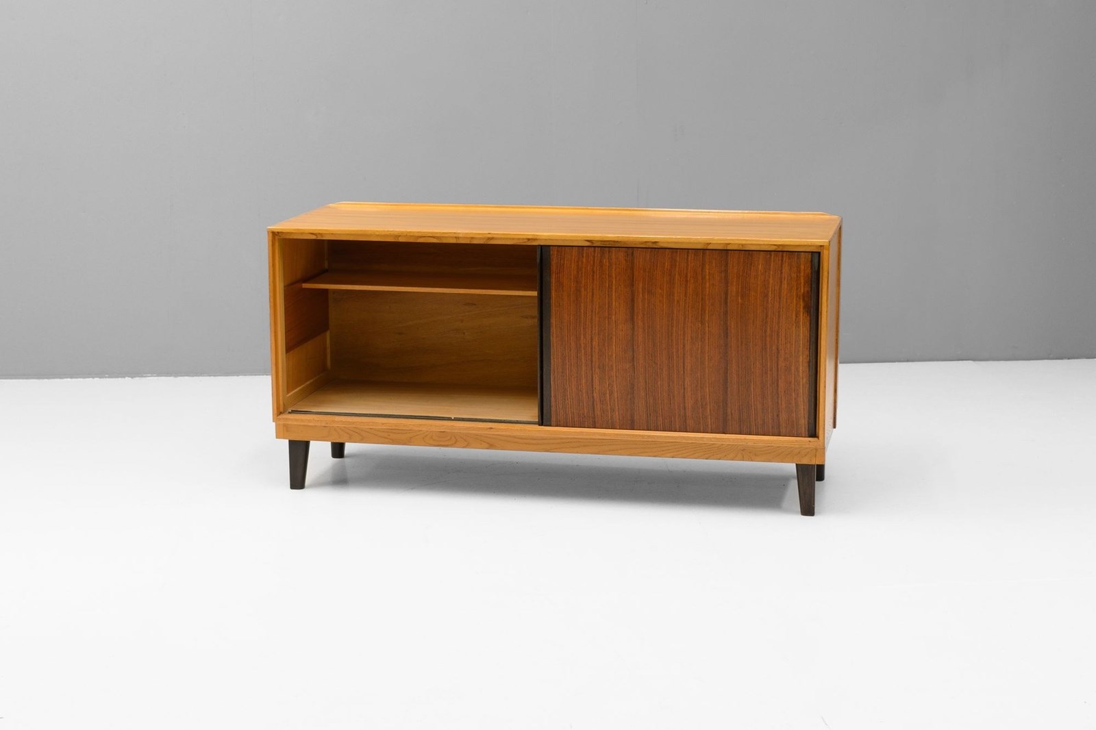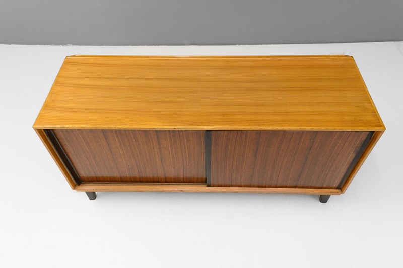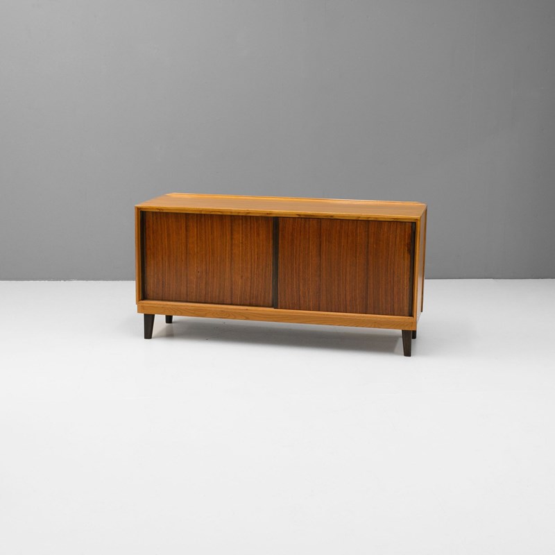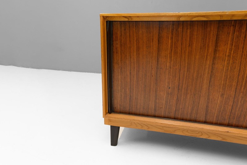 Small mid-century sideboard by Gordon Russell. Solid oak frame and legs with rosewood doors and two fixed internal shelves.