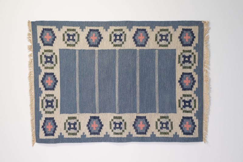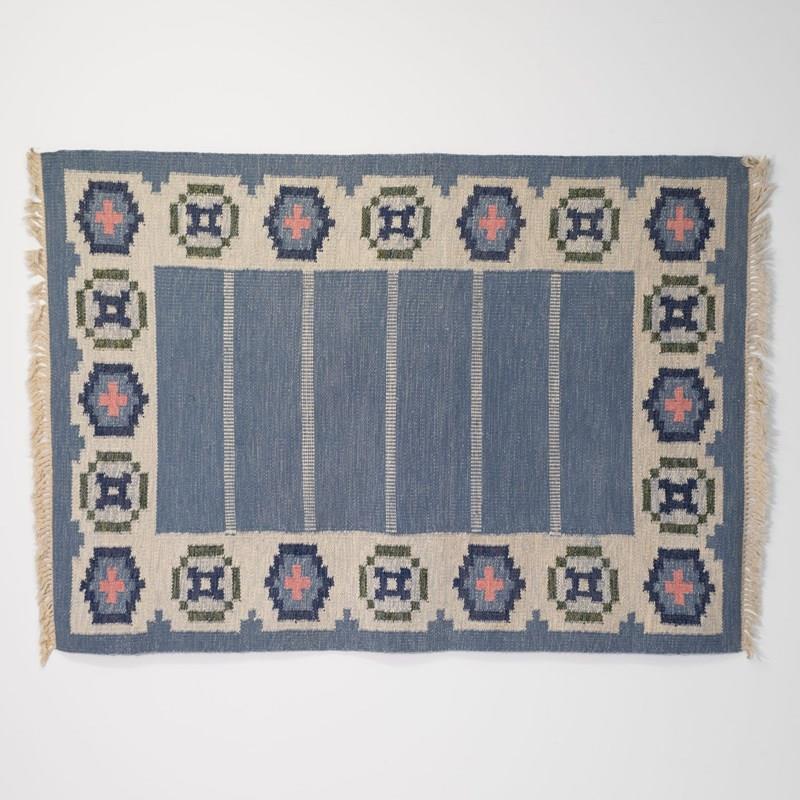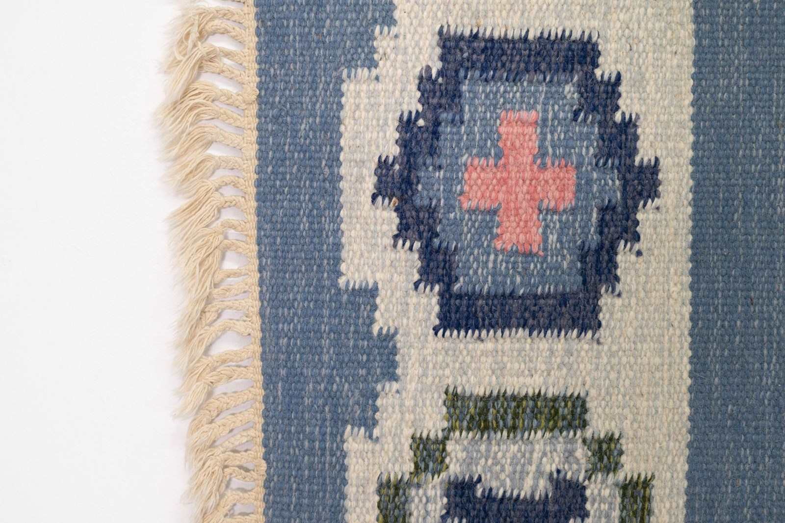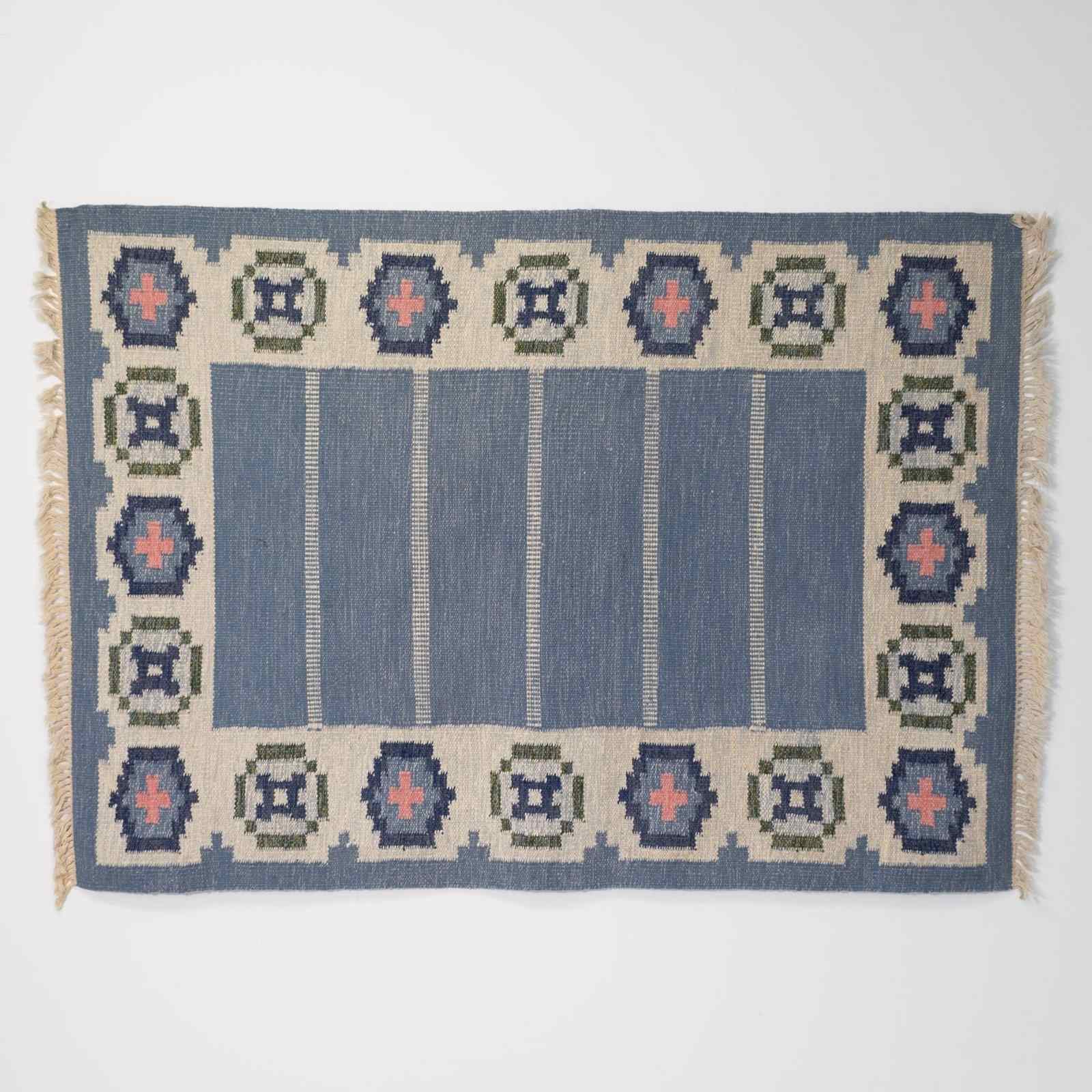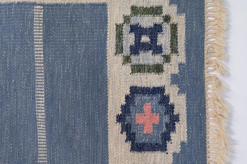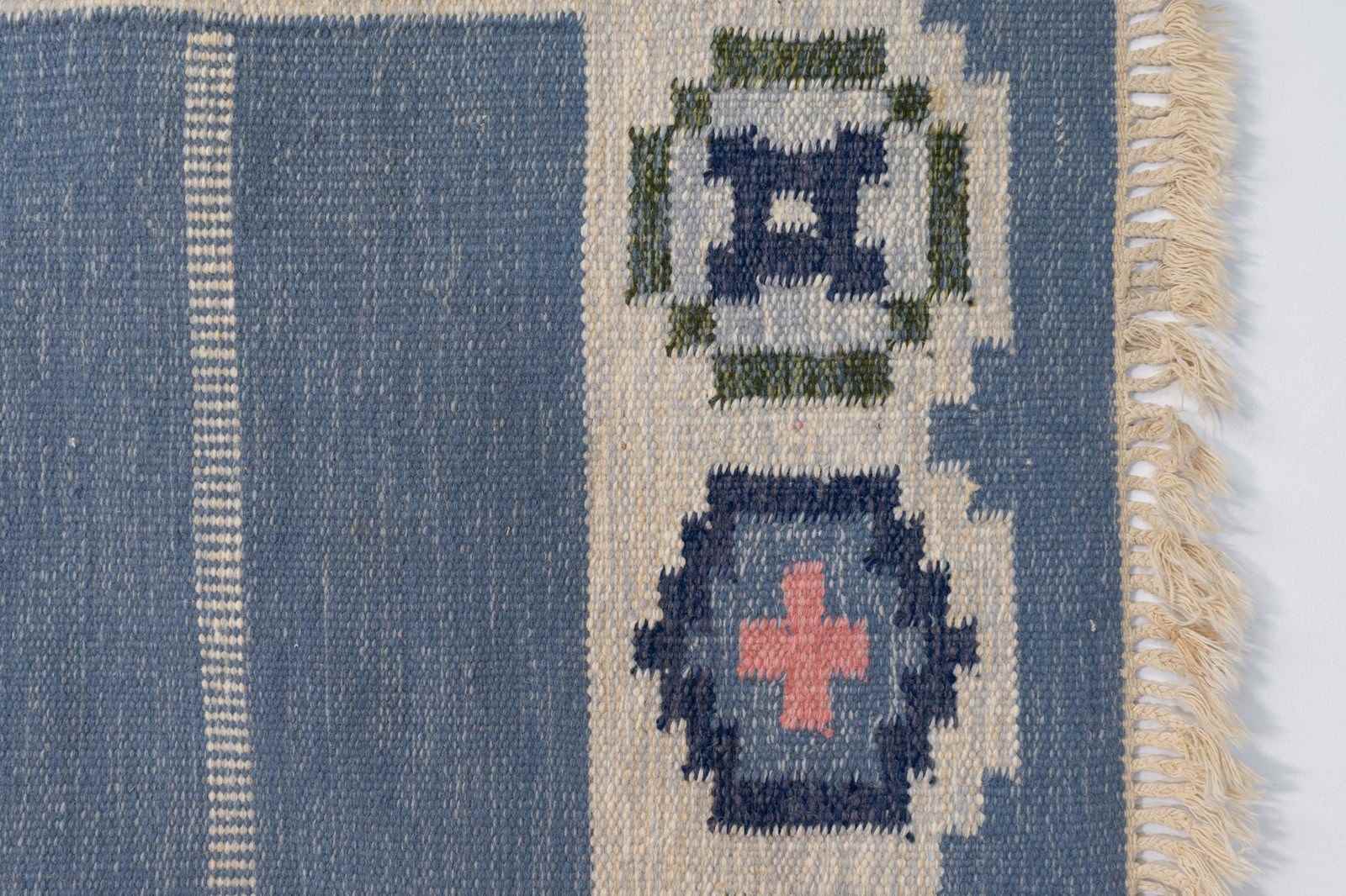 Mid-Century Swedish kilim in the manner of Ingergerd Silow. In tones of blue and cream, with a scalloped border.
