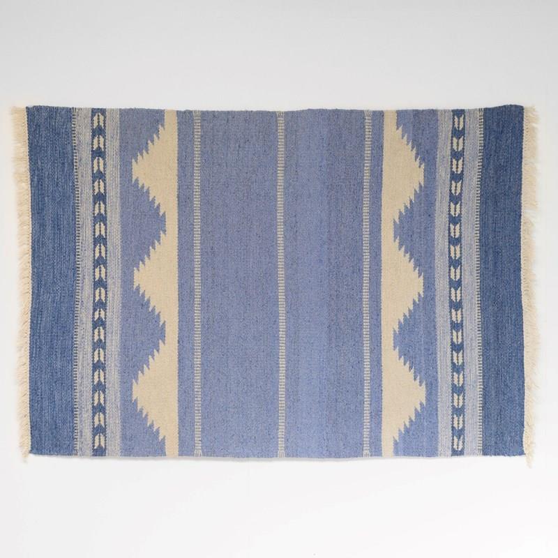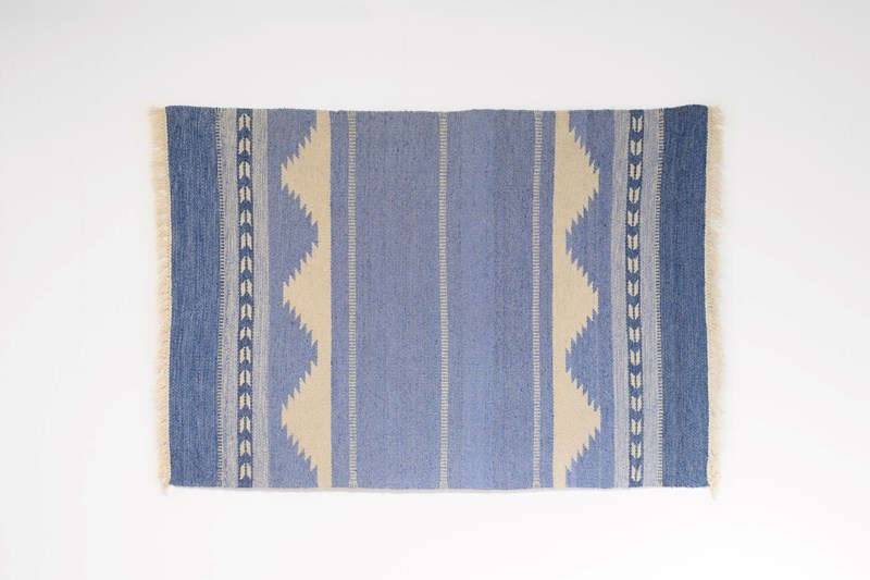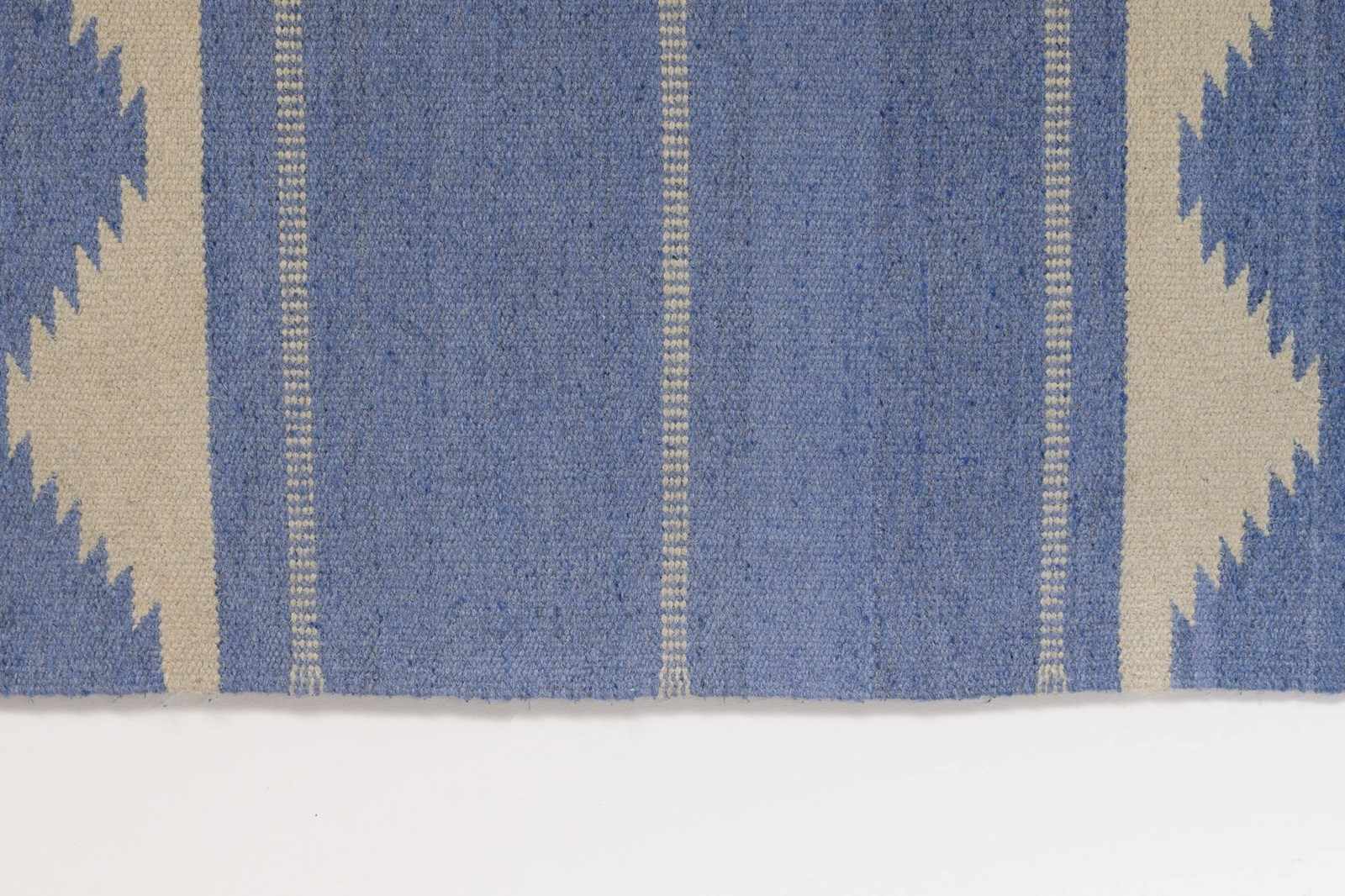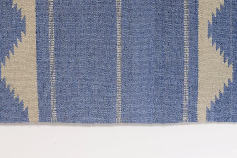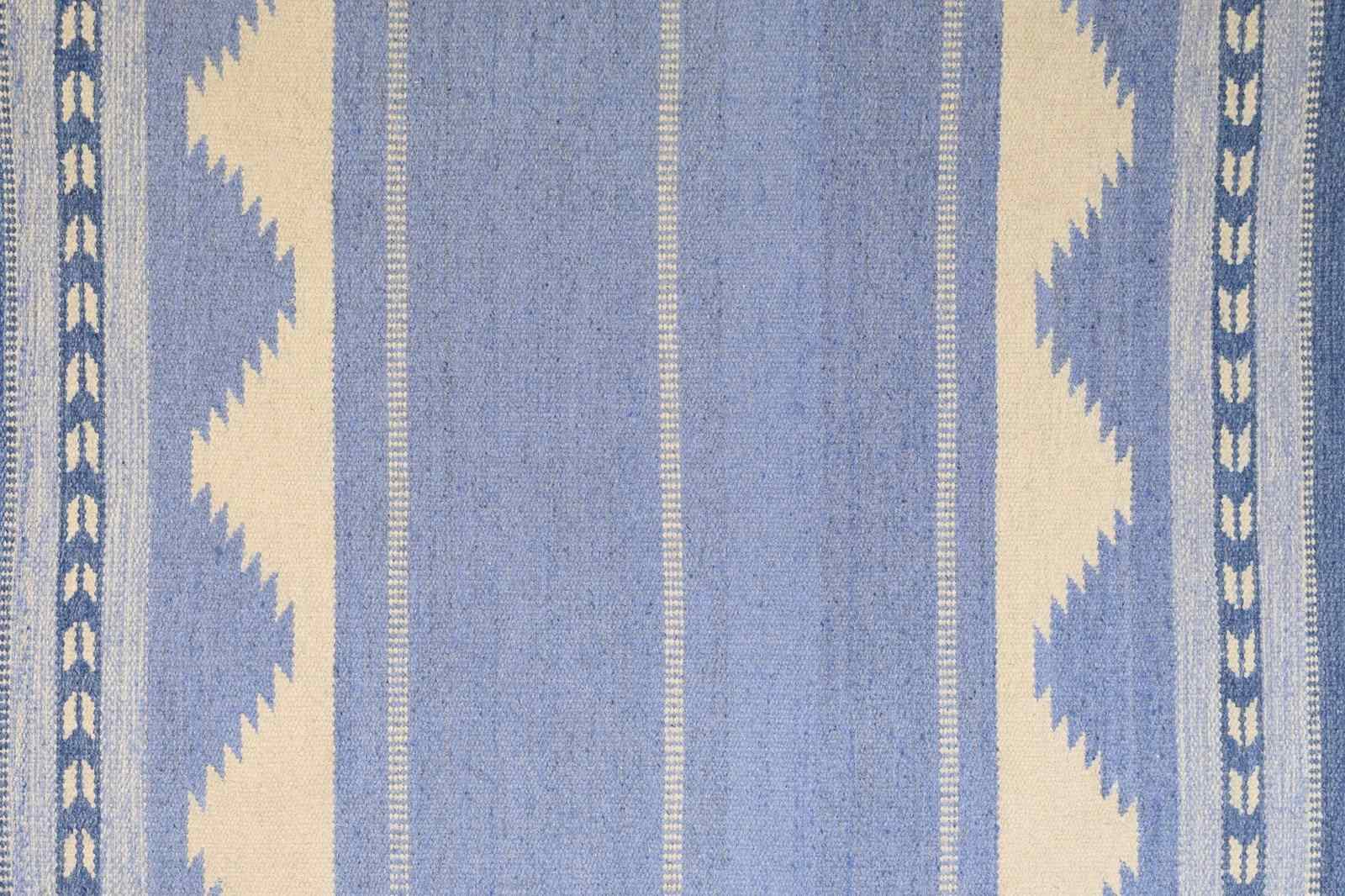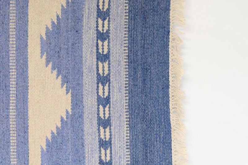 Mid-Century Swedish kilim in tones of dark blues and creams in a linear geometric pattern.