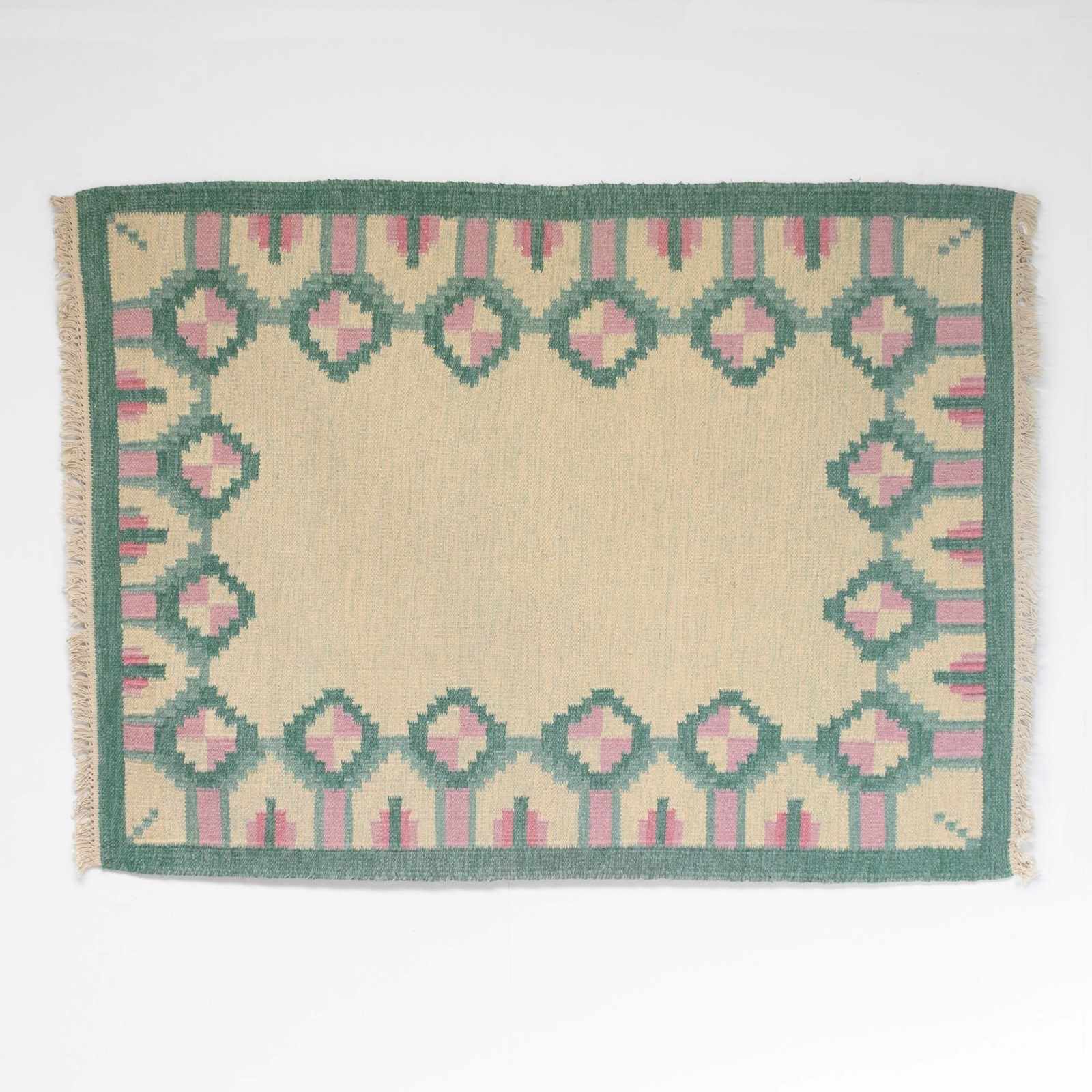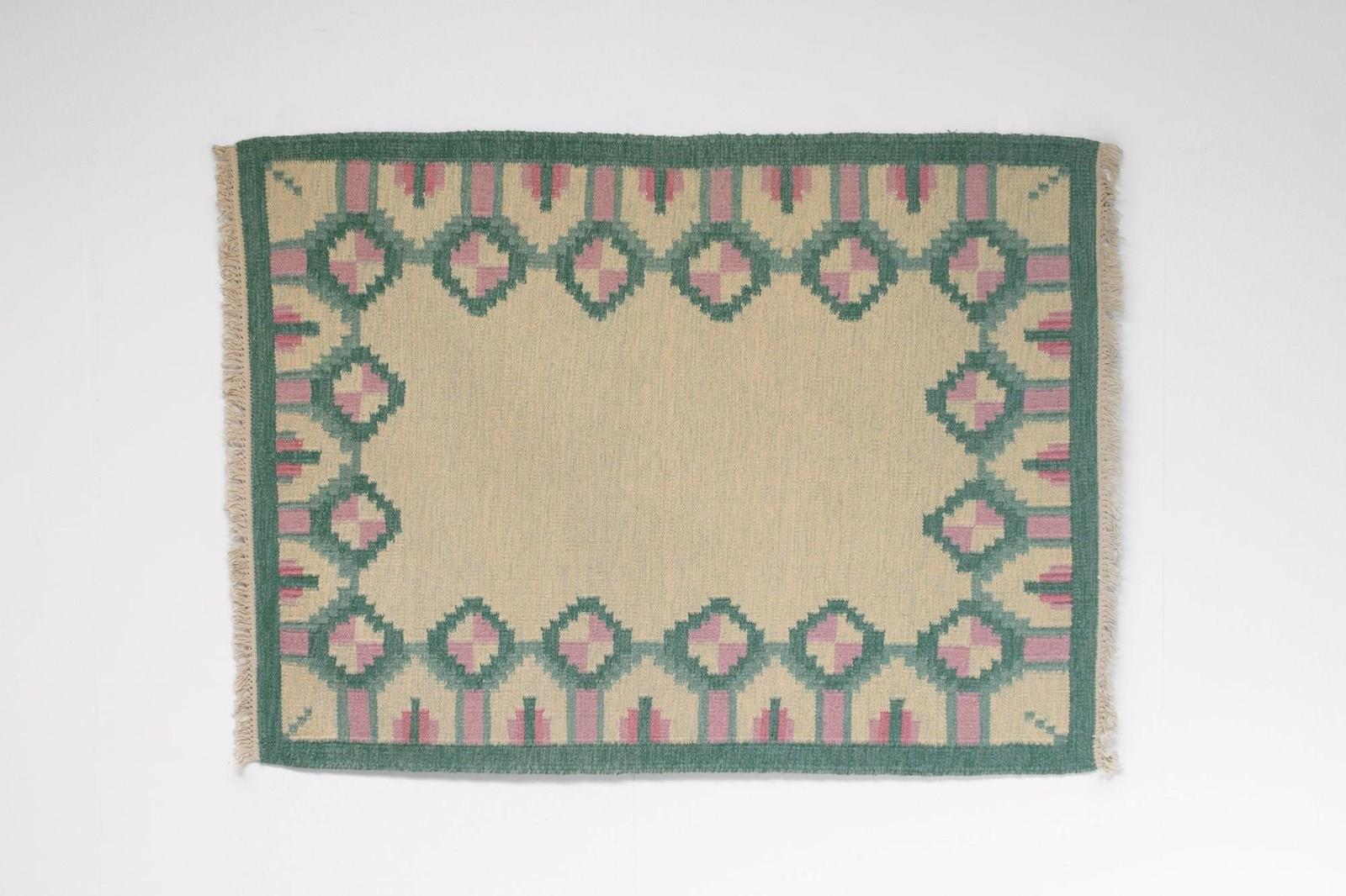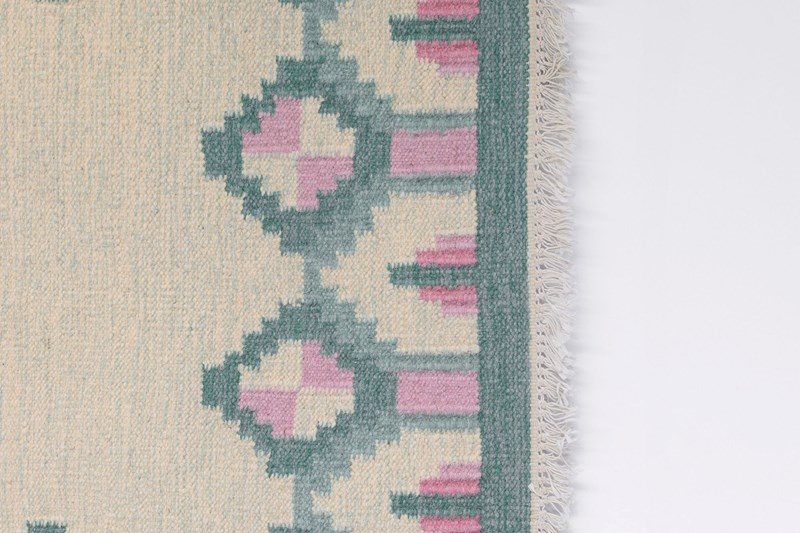 Mid-Century Swedish kilim in tones of greens and pinks with a cream base in a geometric design.