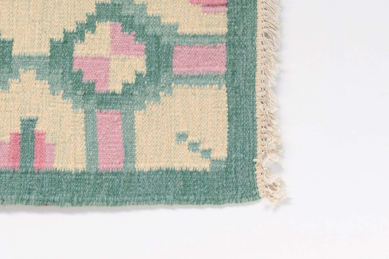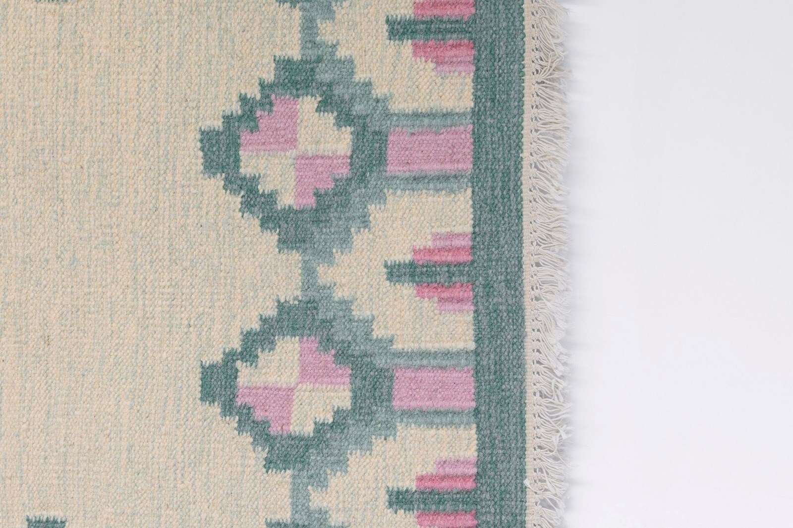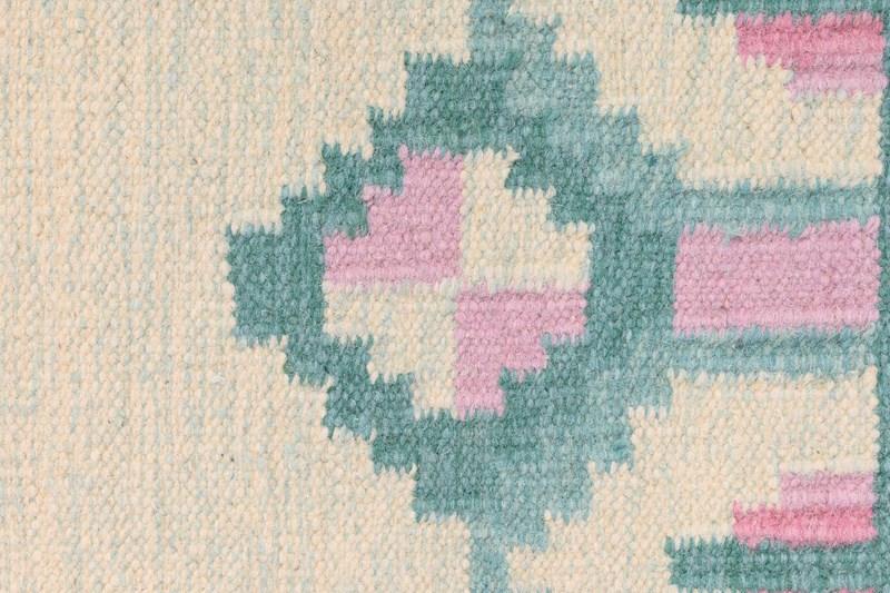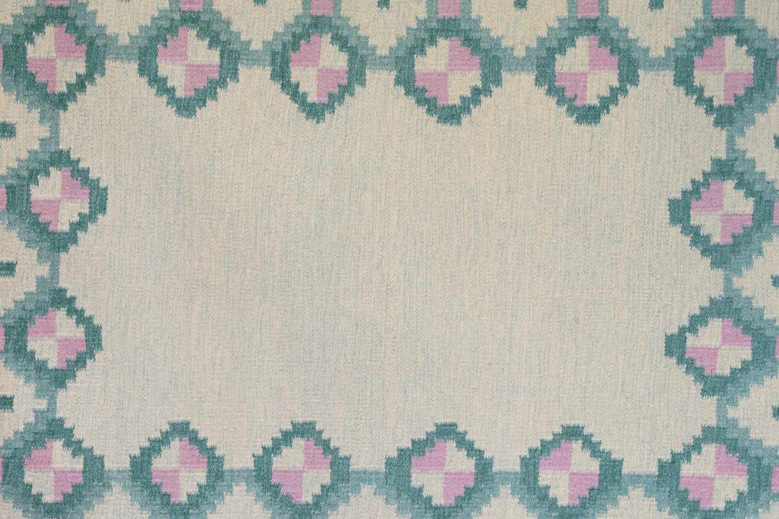 Mid-Century Swedish kilim in tones of greens and pinks with a cream base in a geometric design.