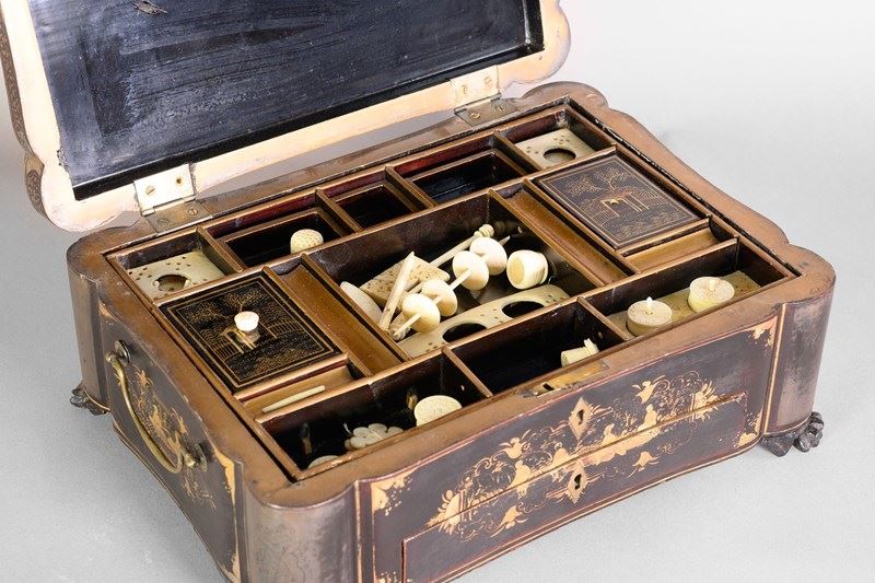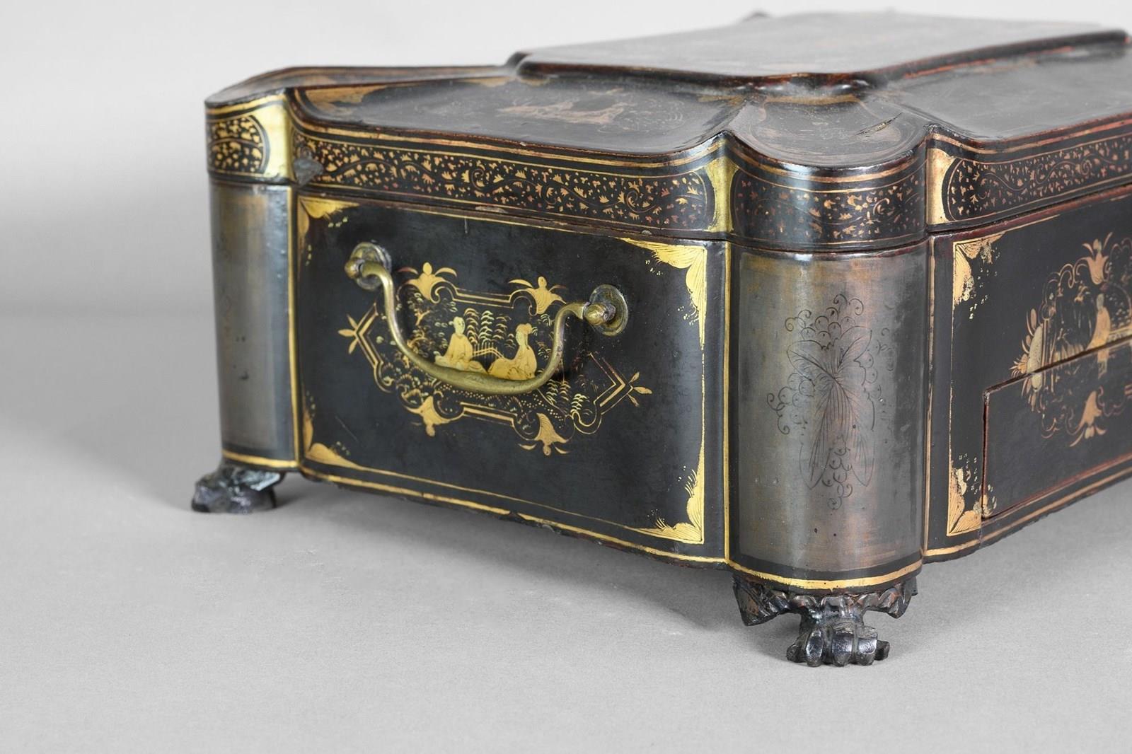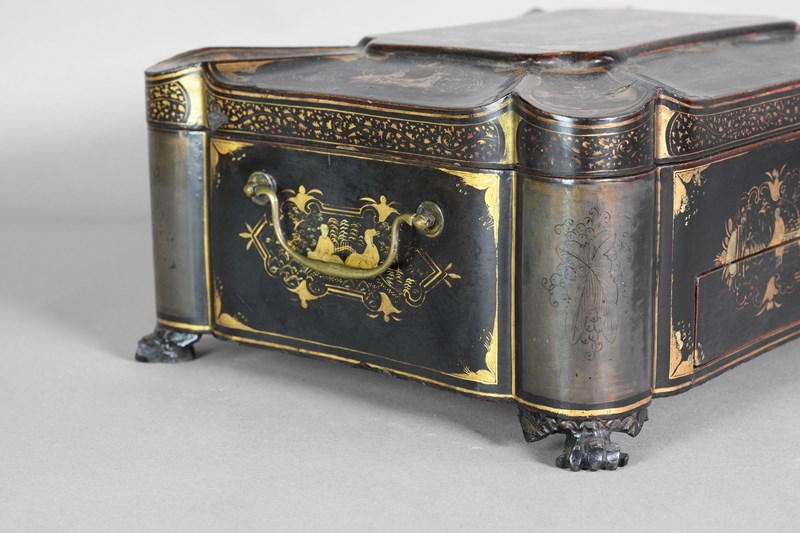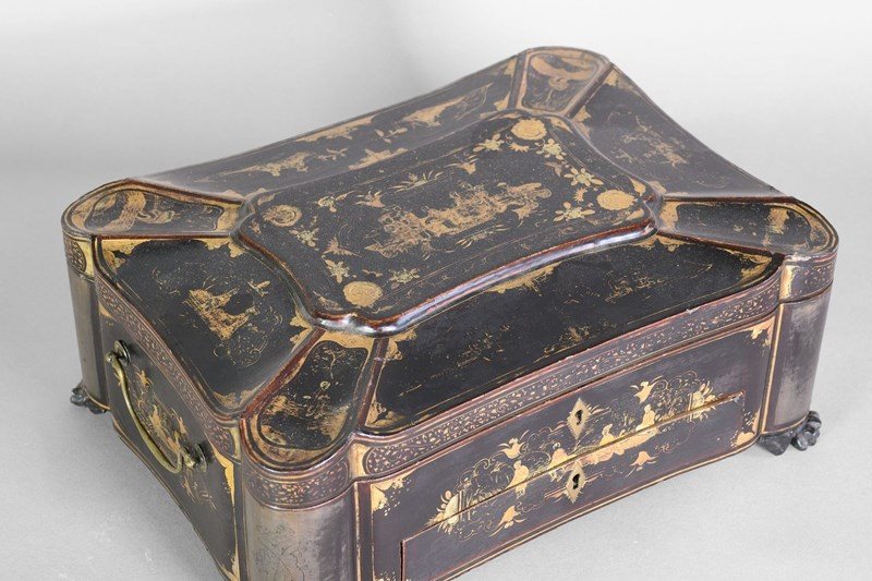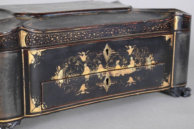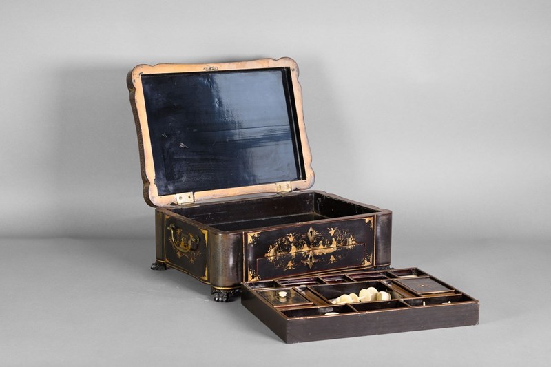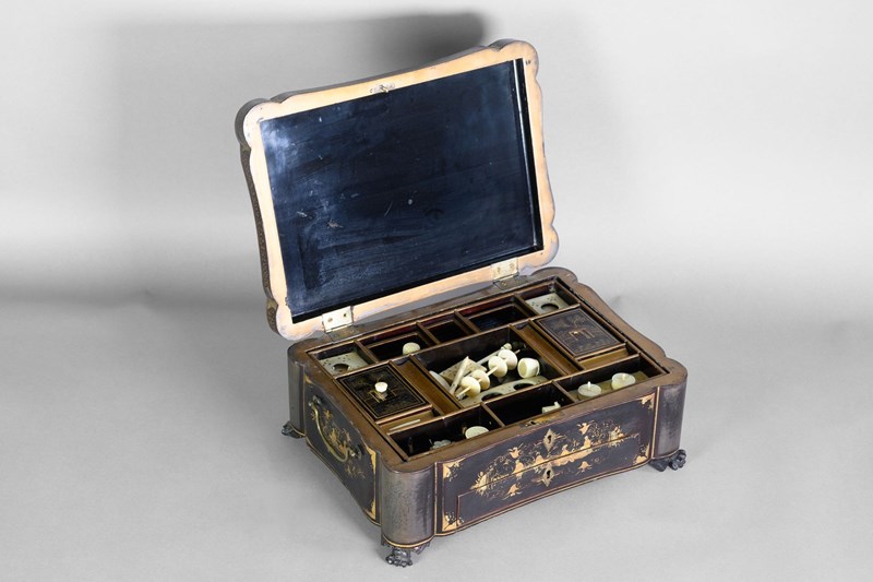 Black lacquered papier-mache workbox on paw feet. Circa 1830