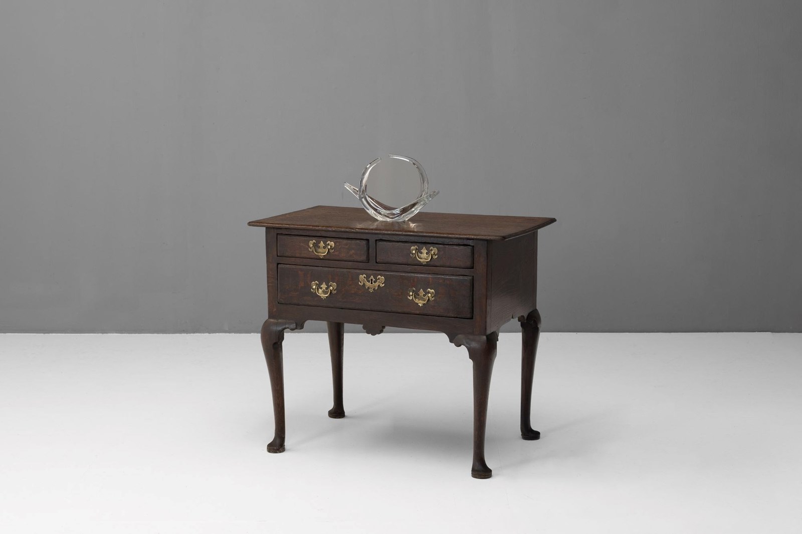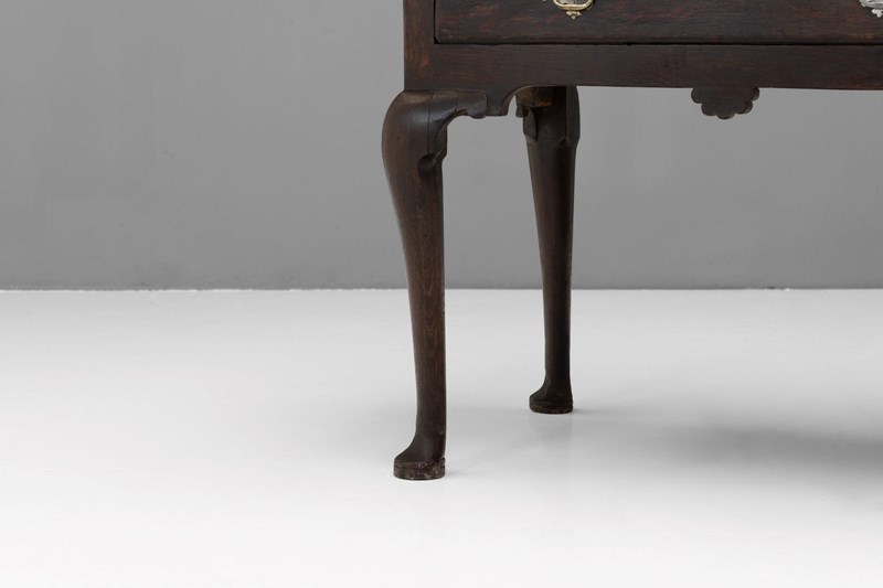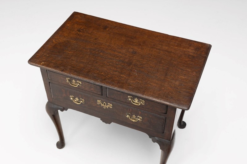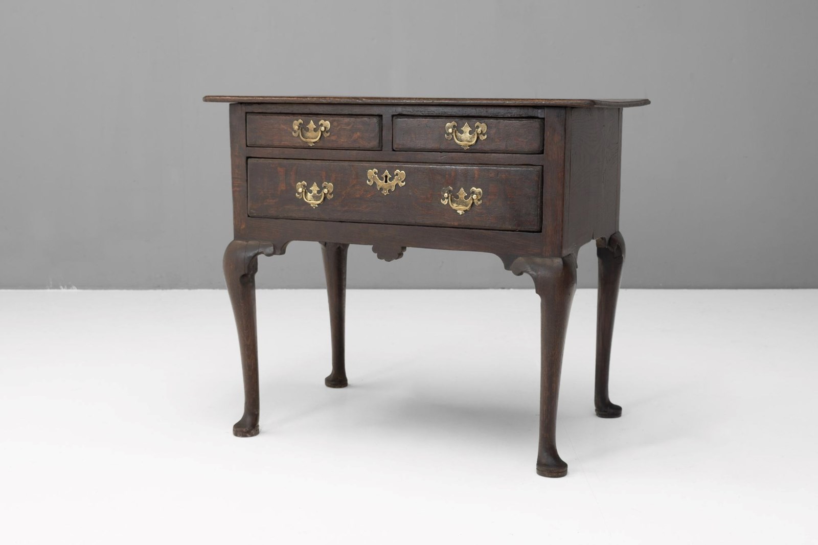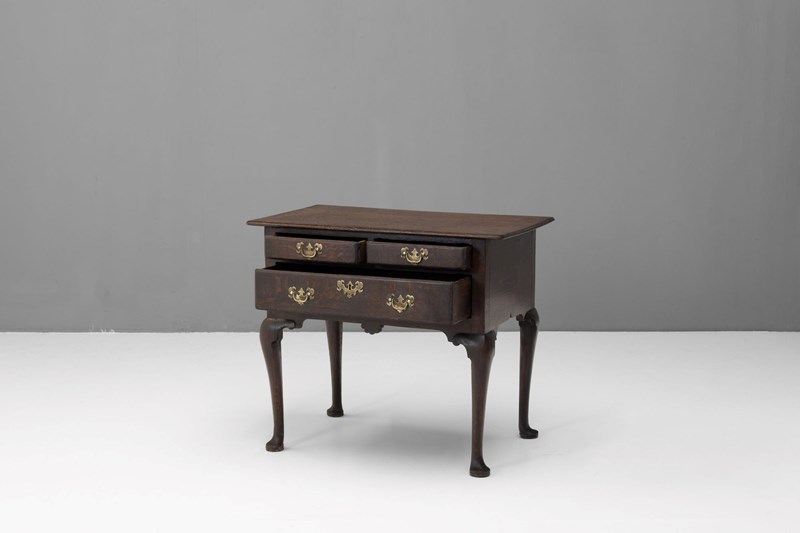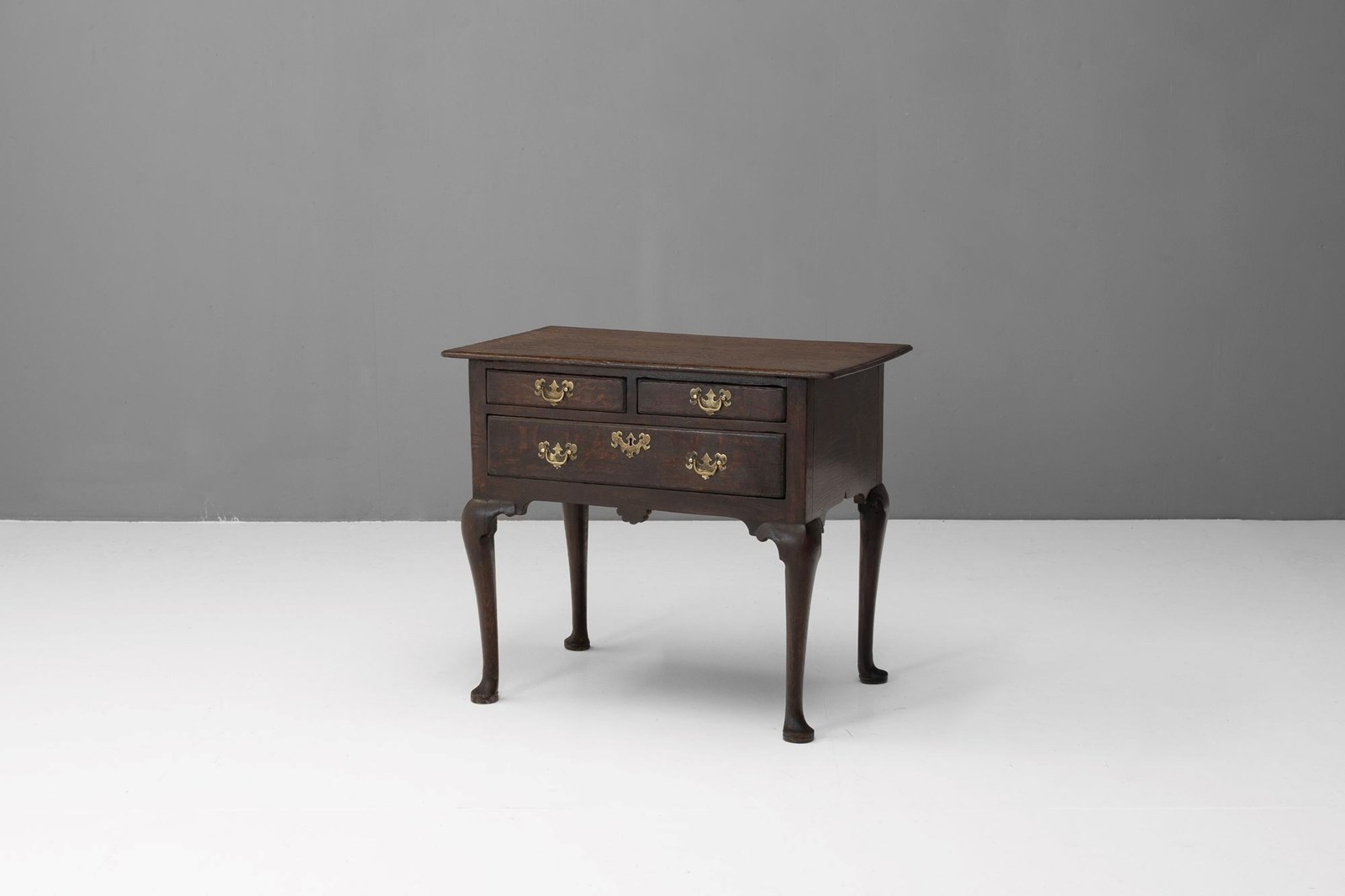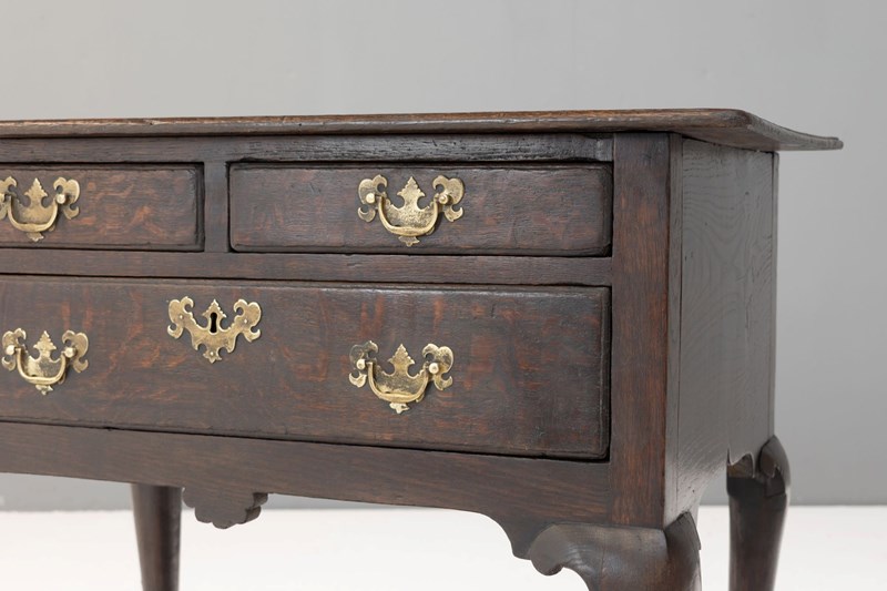 Oak lowboy with original handles and pad feet. Circa 1780.