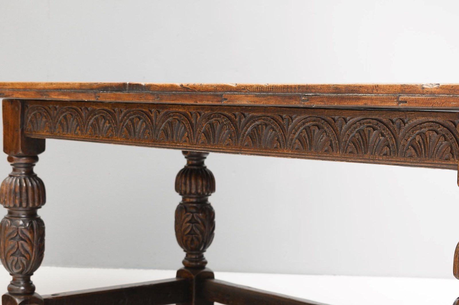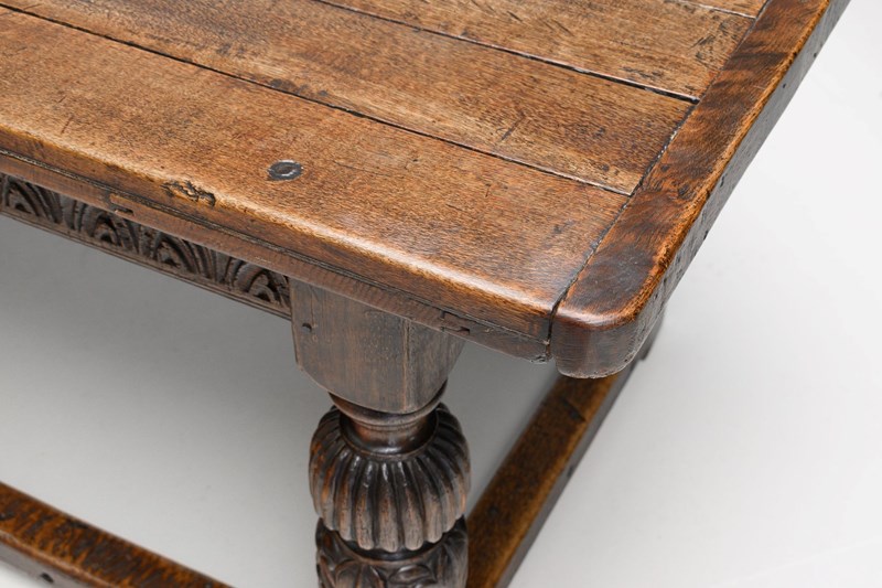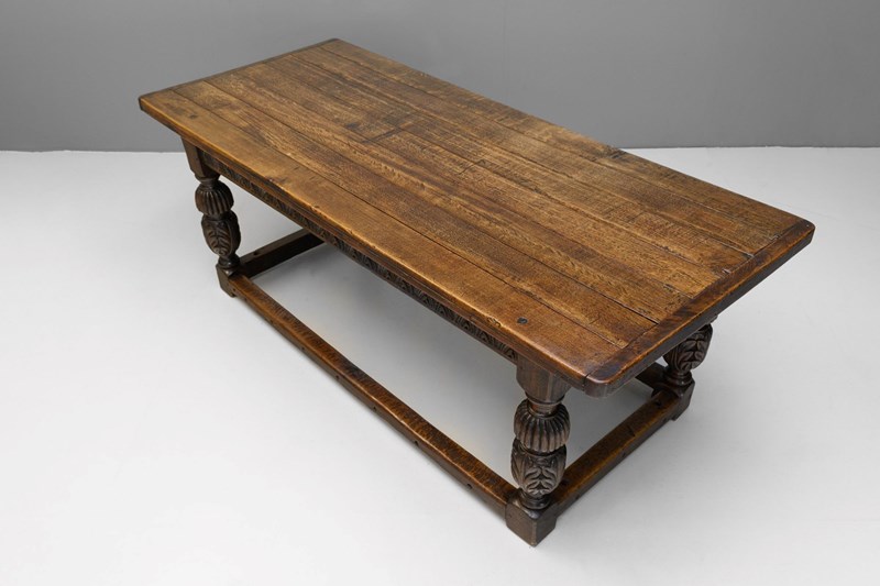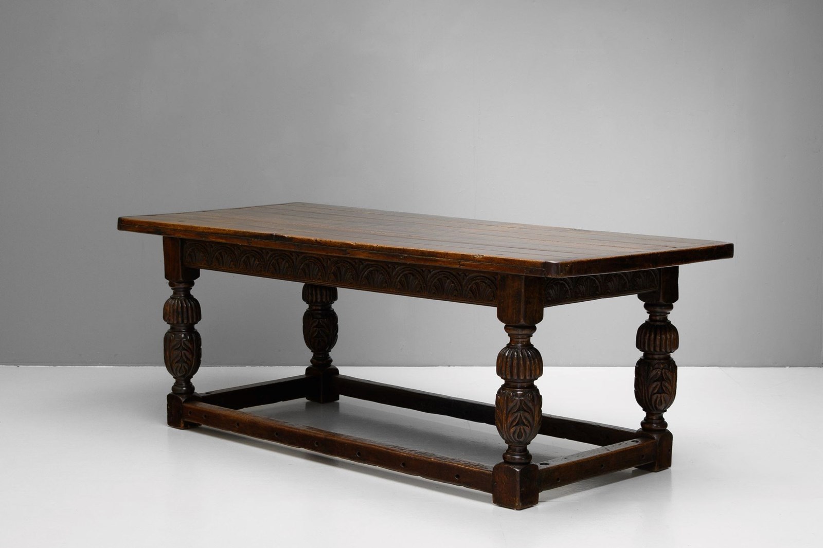 Oak refectory table with plank top on stretcher base. U.K circa 1850.