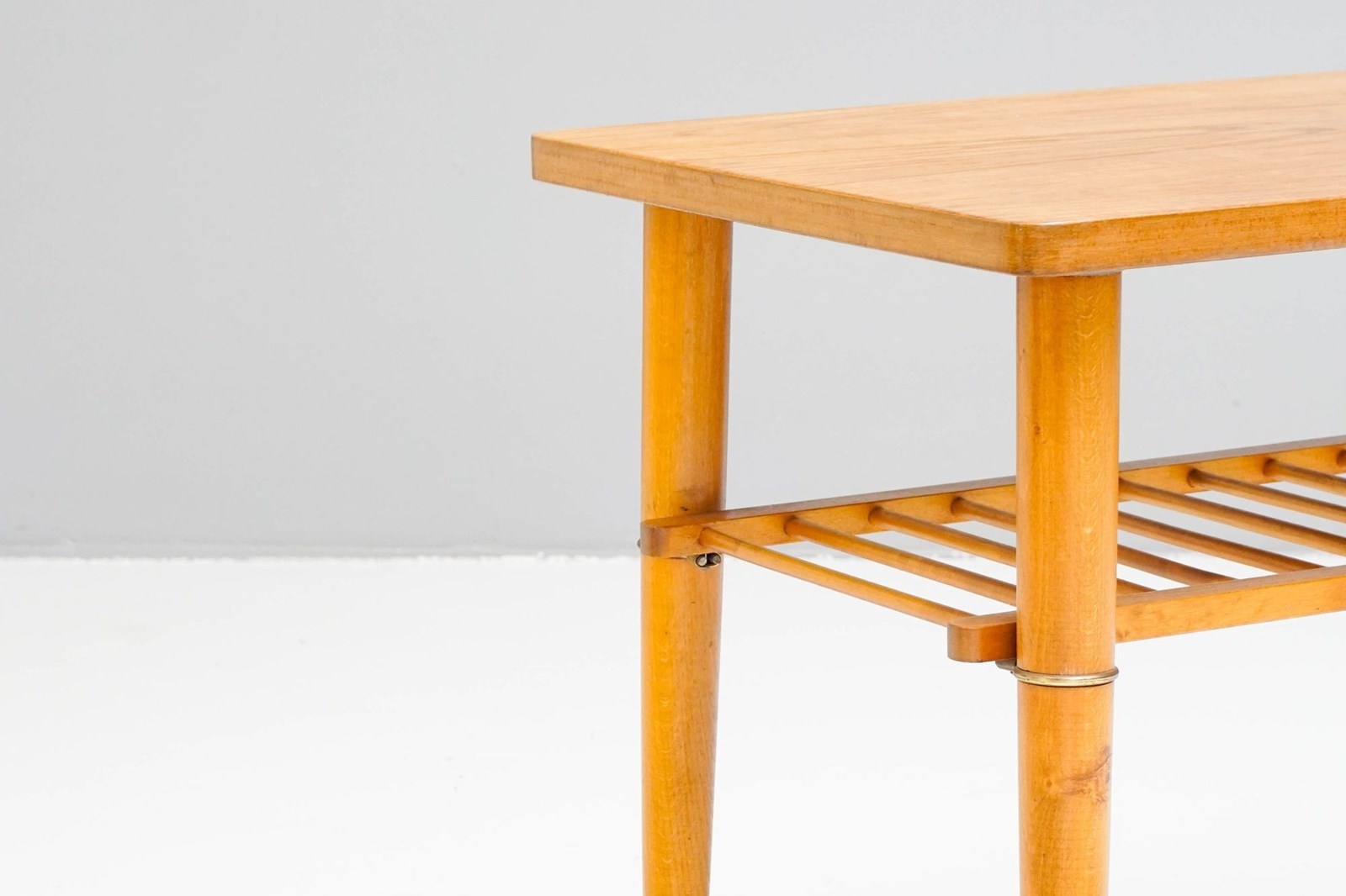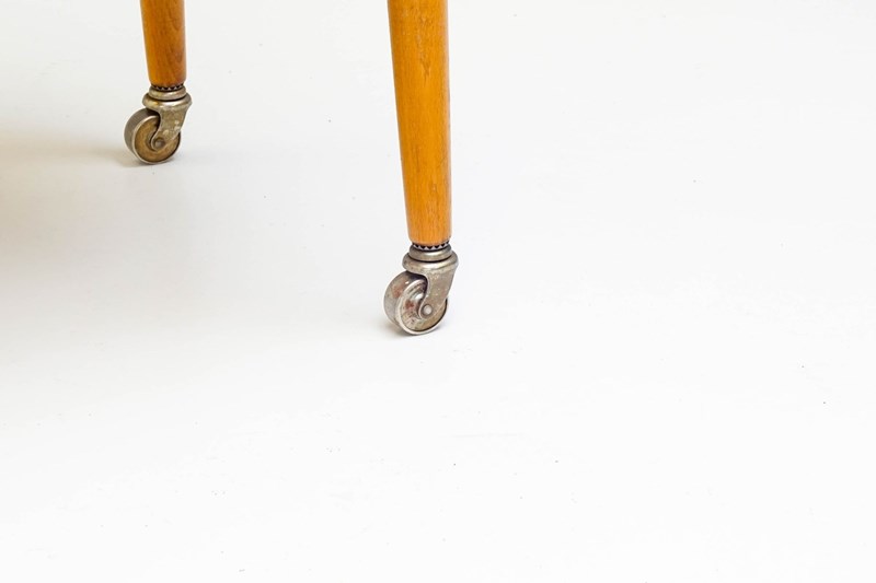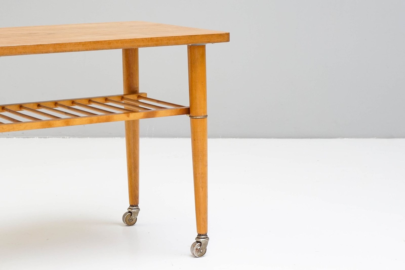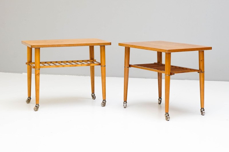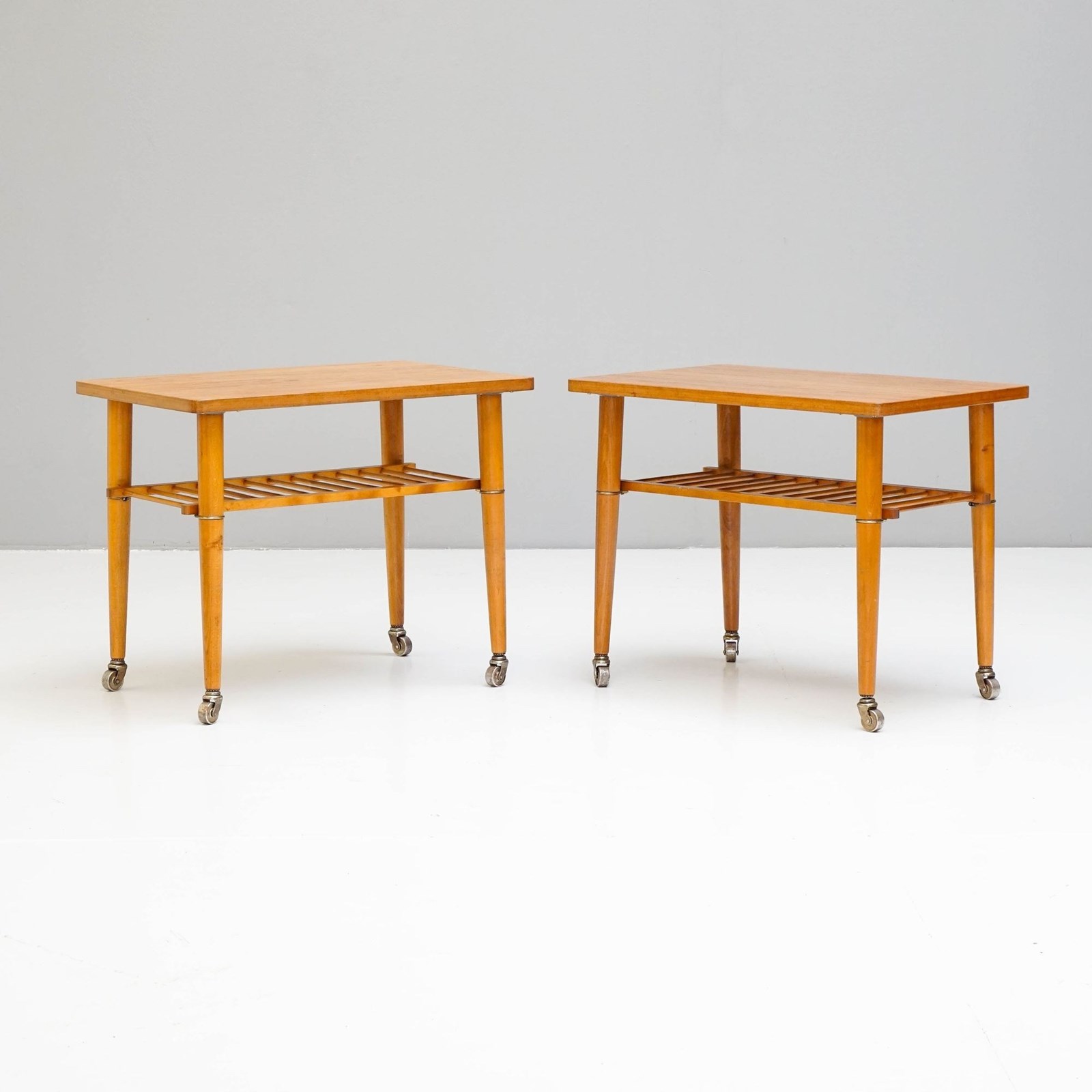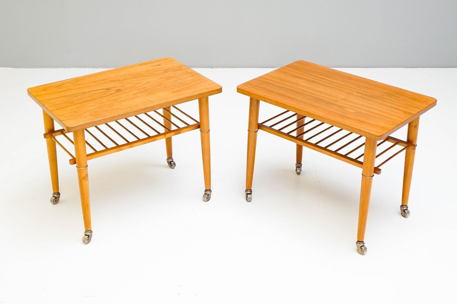 Pair of Swedish occasional tables on original castors, beech legs and magazine racks, teak veneered tops.