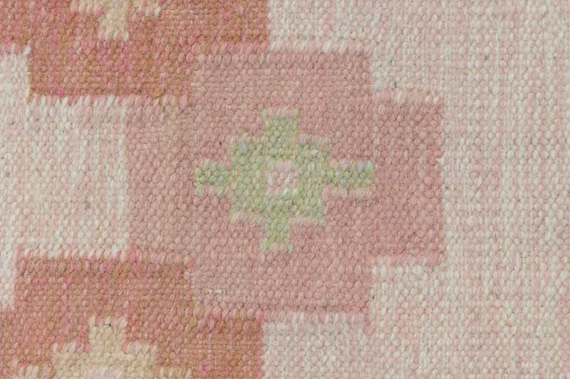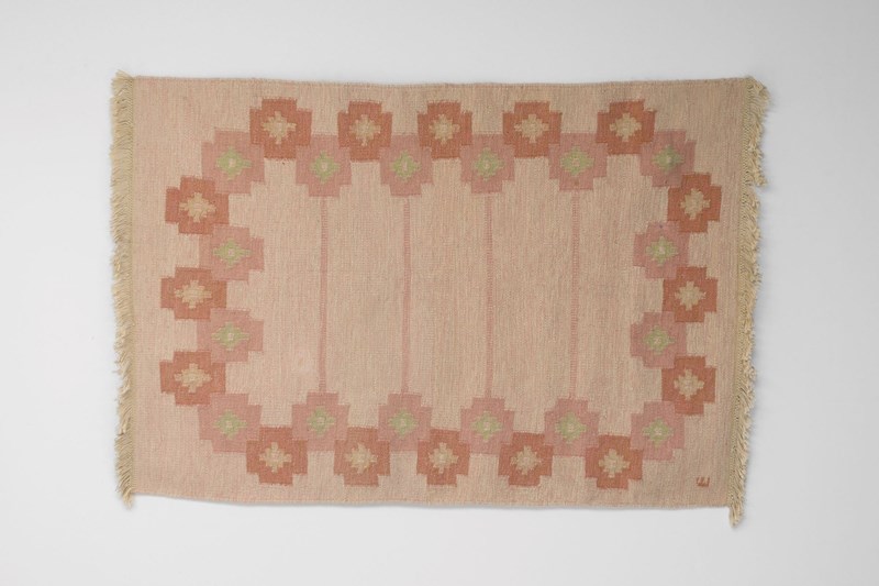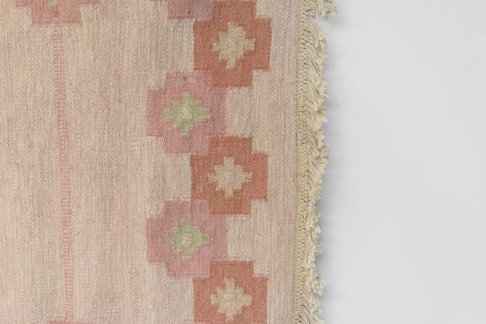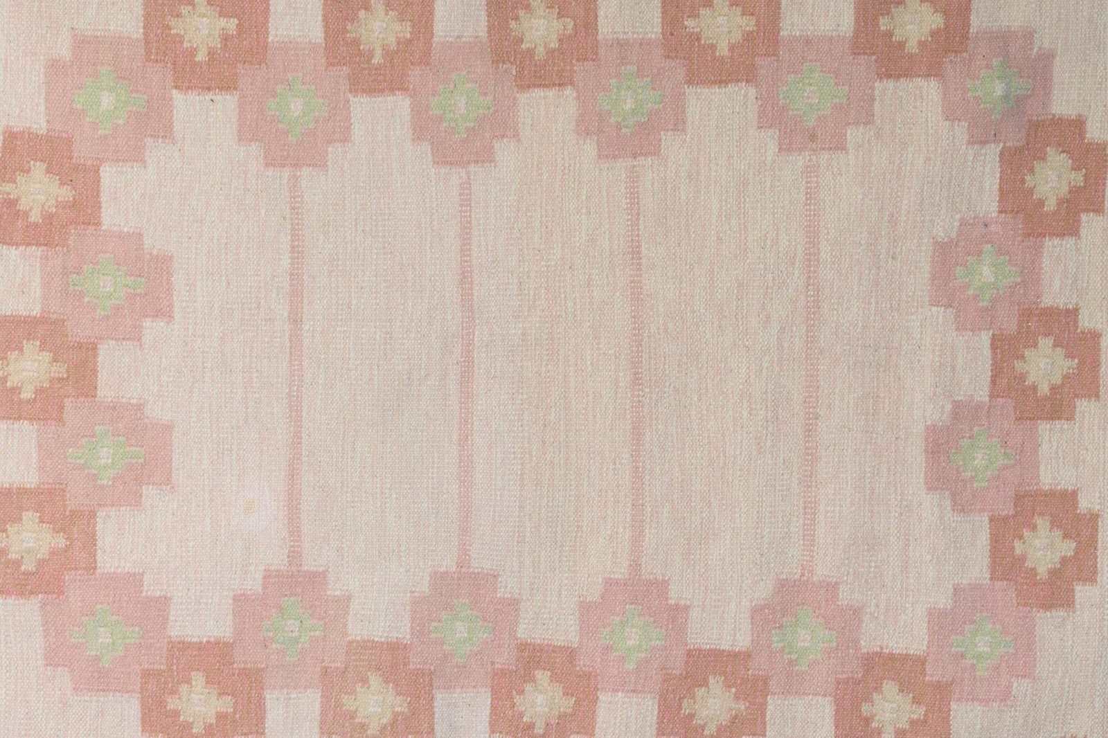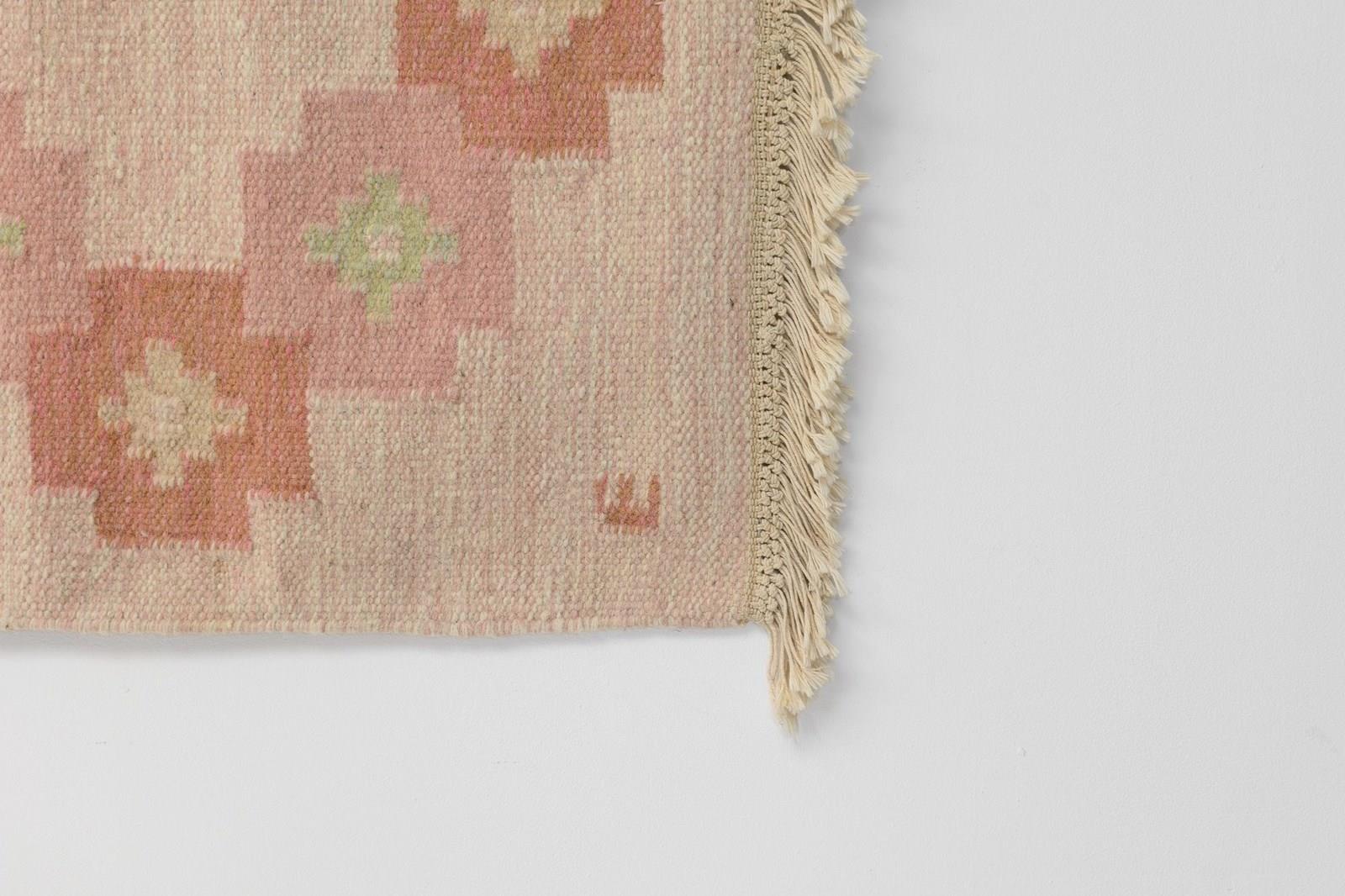 Mid-Century Swedish kilim in tones of pink signed E. Sweden circa 1960. All our carpets undergo a professional cleaning process. However, due to their age and previous life, some may exhibit minor signs of wear consistent with their history. Please examine the provided photos carefully or contact us for further information.