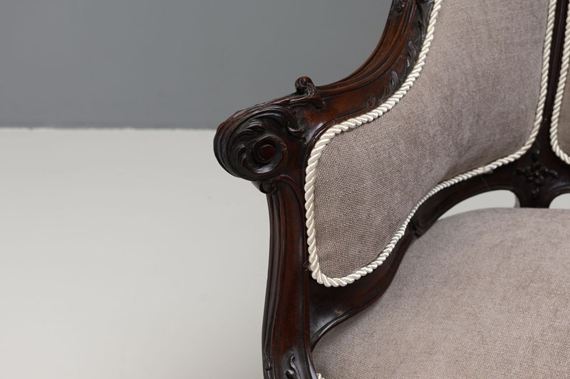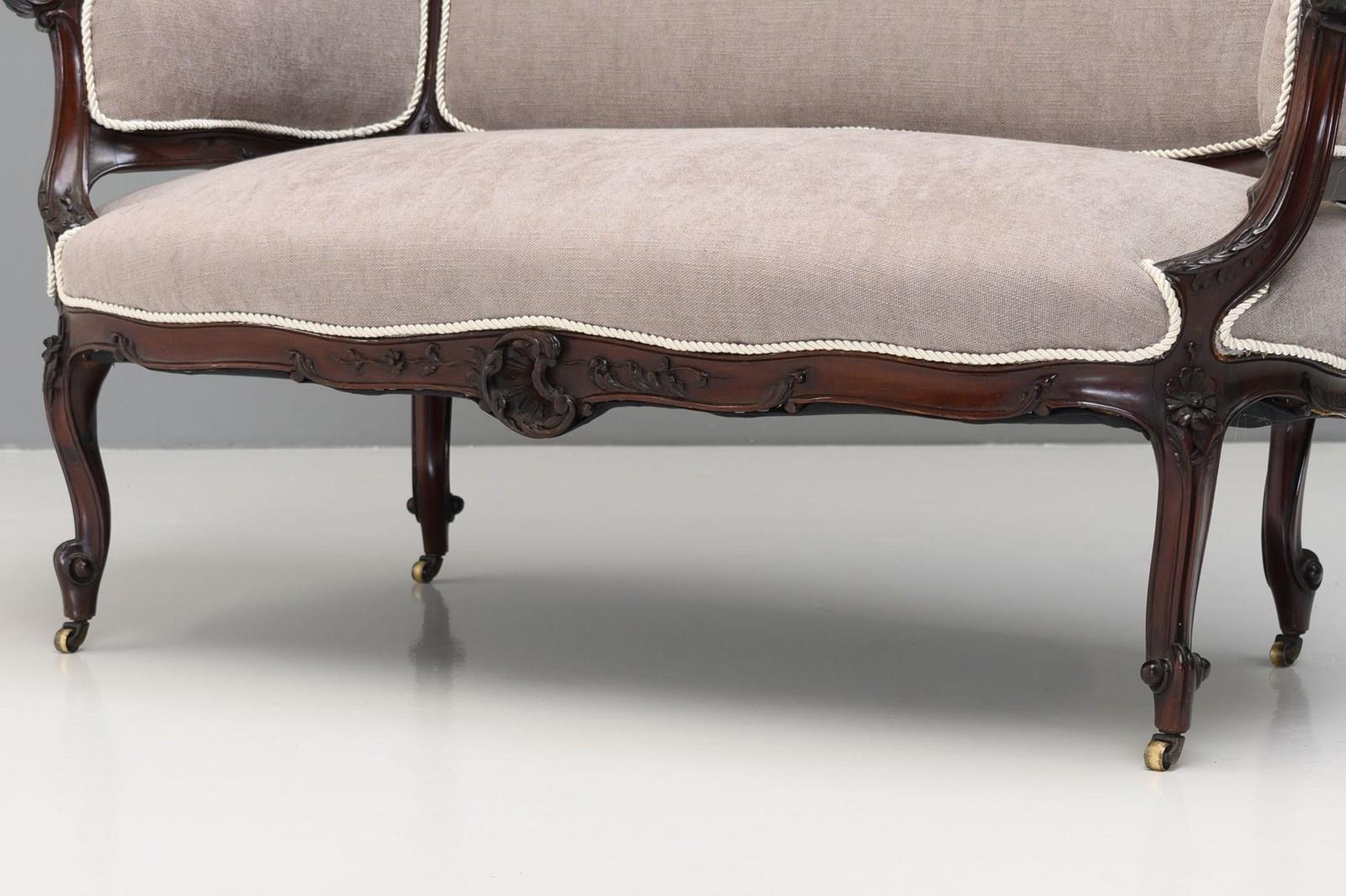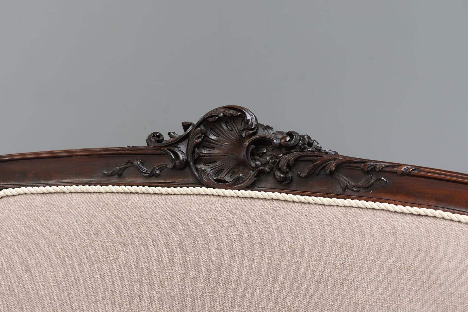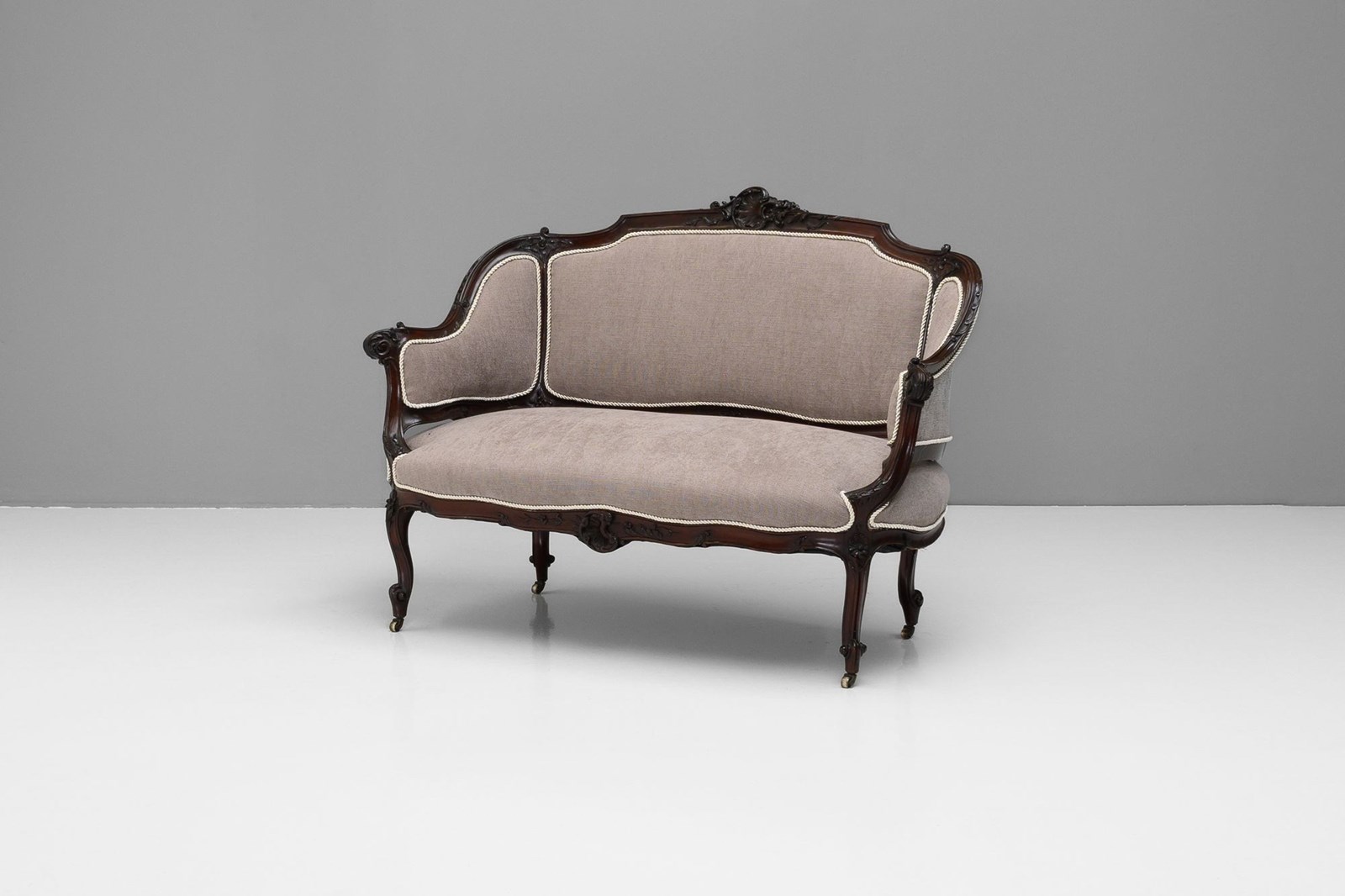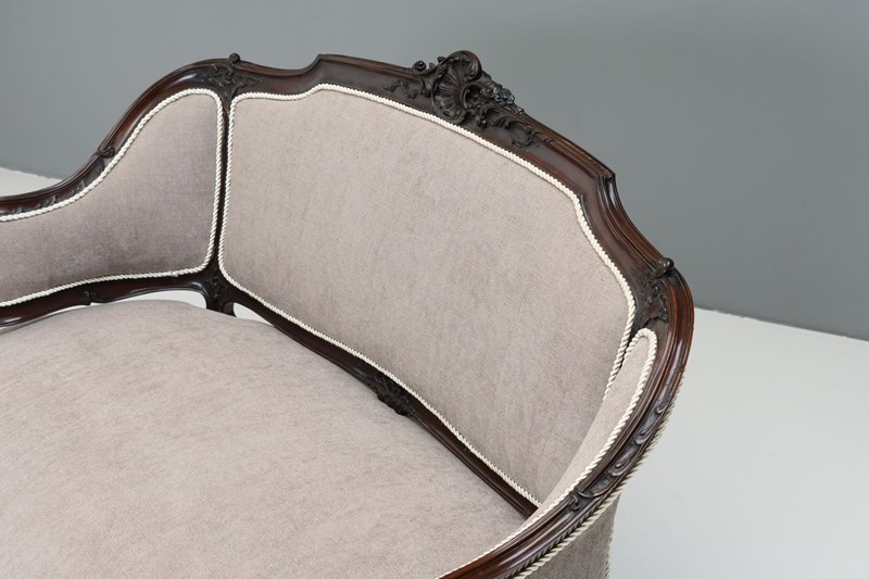 Reupholstered French rosewood rococo style two seat settee on cabriole legs. Circa 1890.