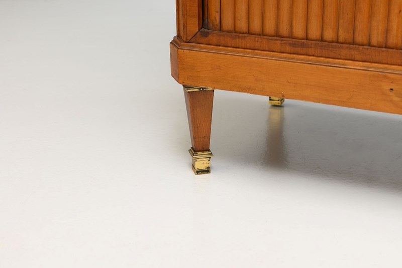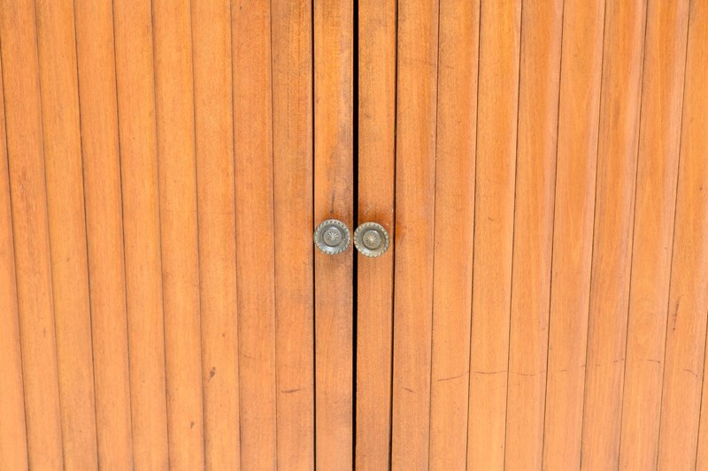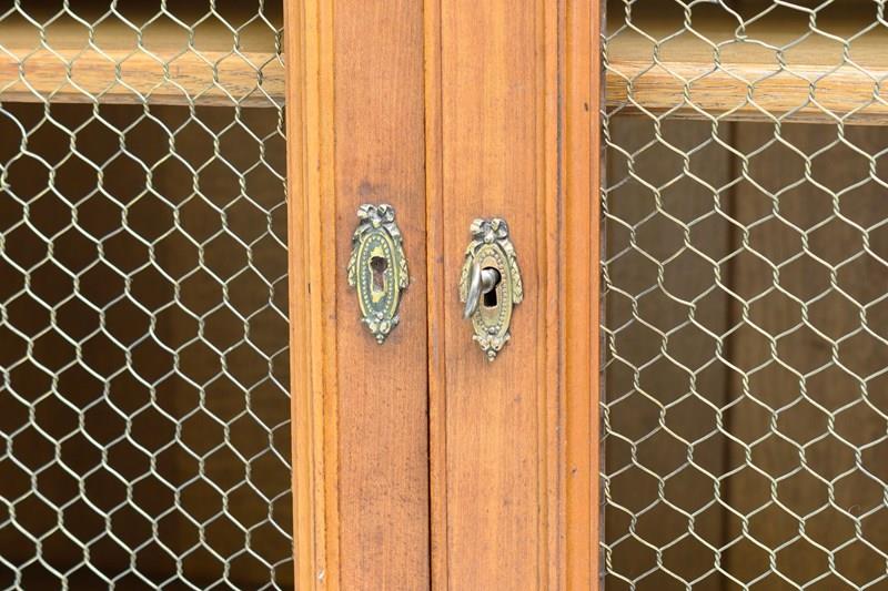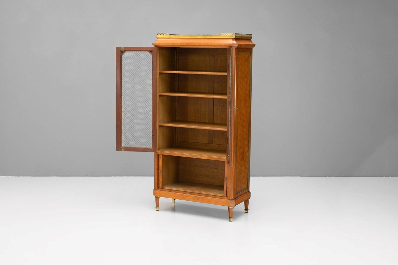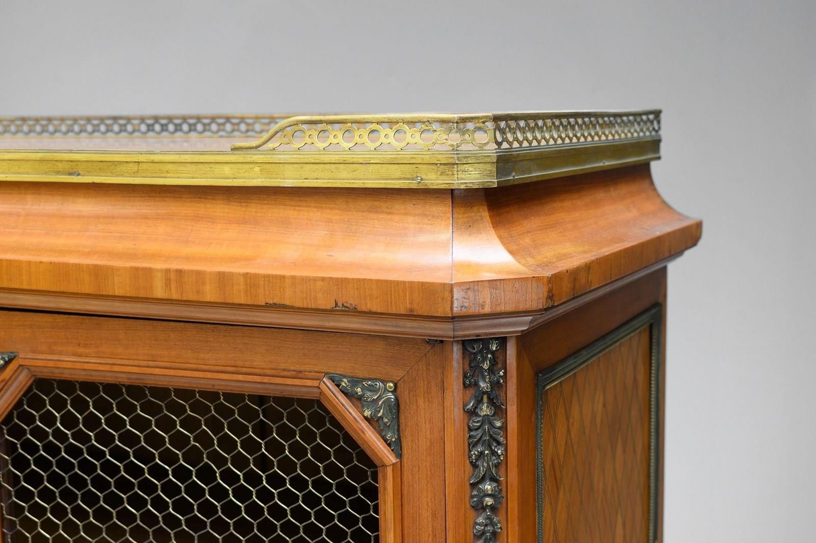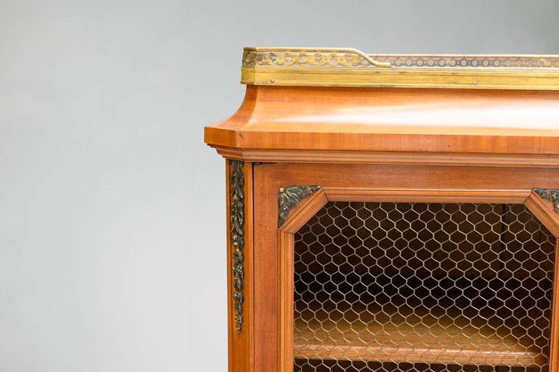 Two door satinwood cabinet with brass mesh and galleried top. France circa 1930.