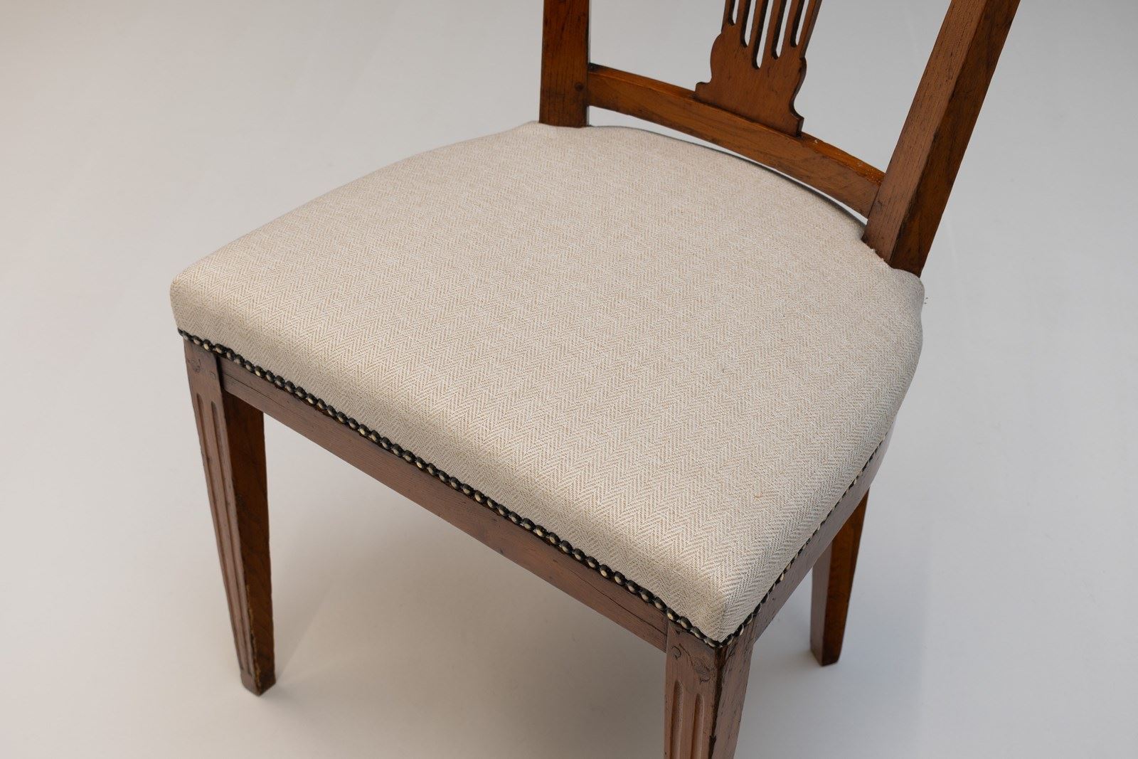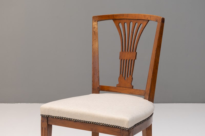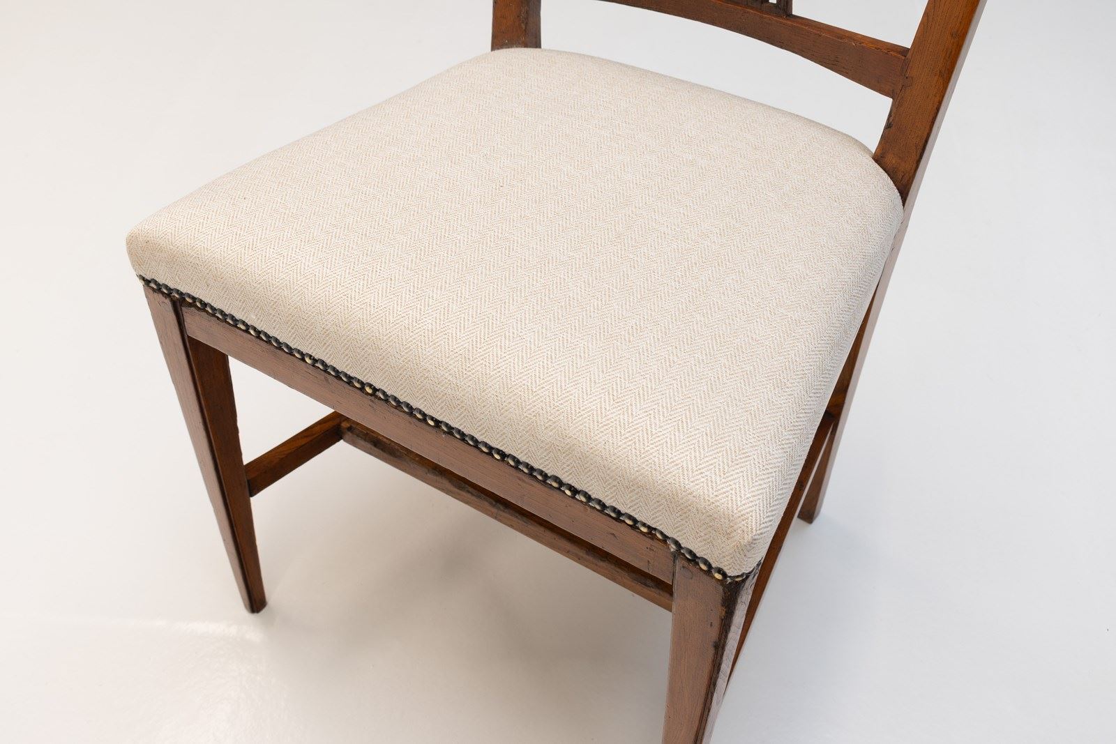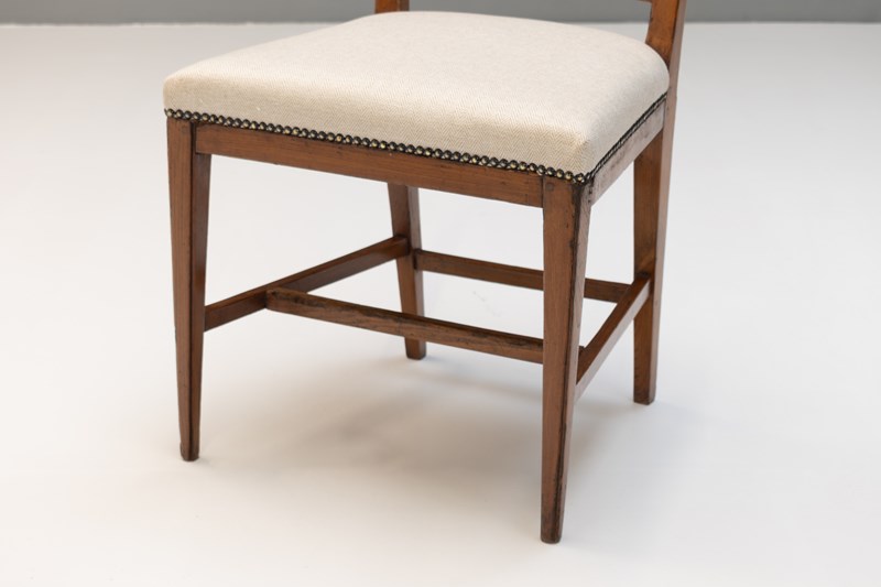 Set of 8 ( 6 + 2 similar ) French dining chairs on square tapered legs united by stretchers in elm with reupholstered seats. Circa 1800