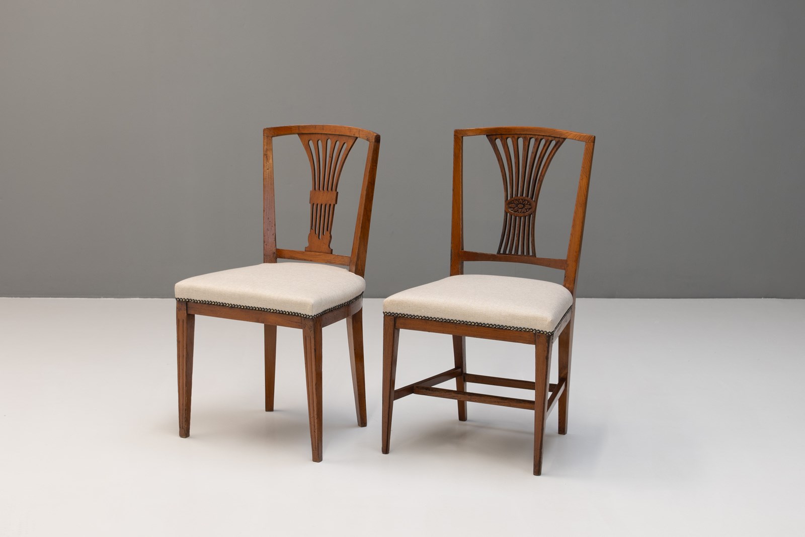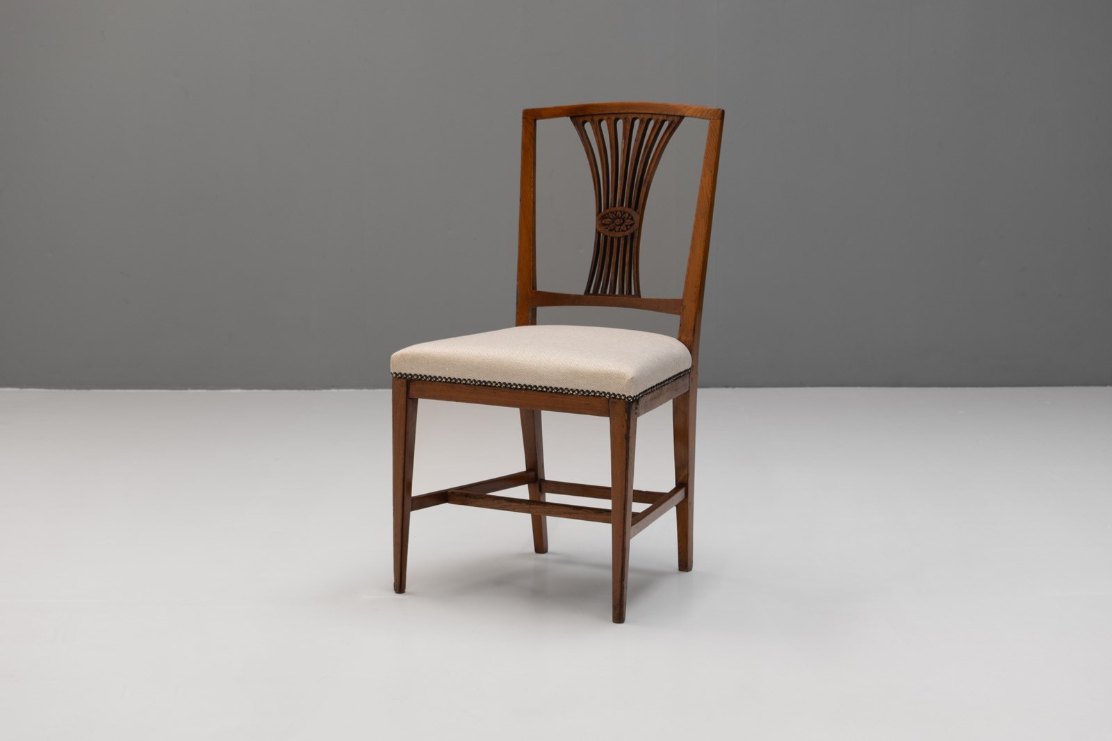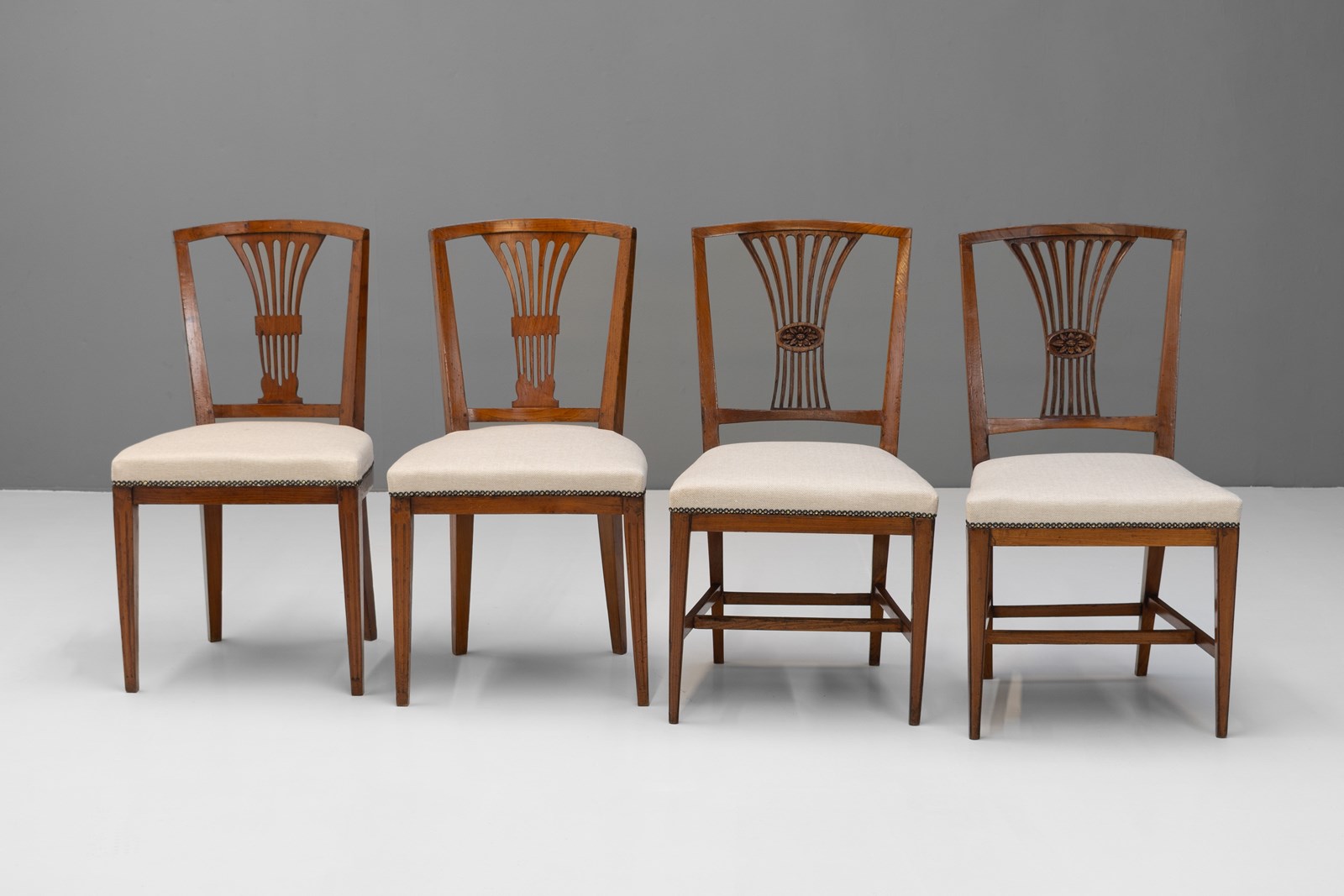 Set of 8 ( 6 + 2 similar ) French dining chairs on square tapered legs united by stretchers in elm with reupholstered seats. Circa 1800