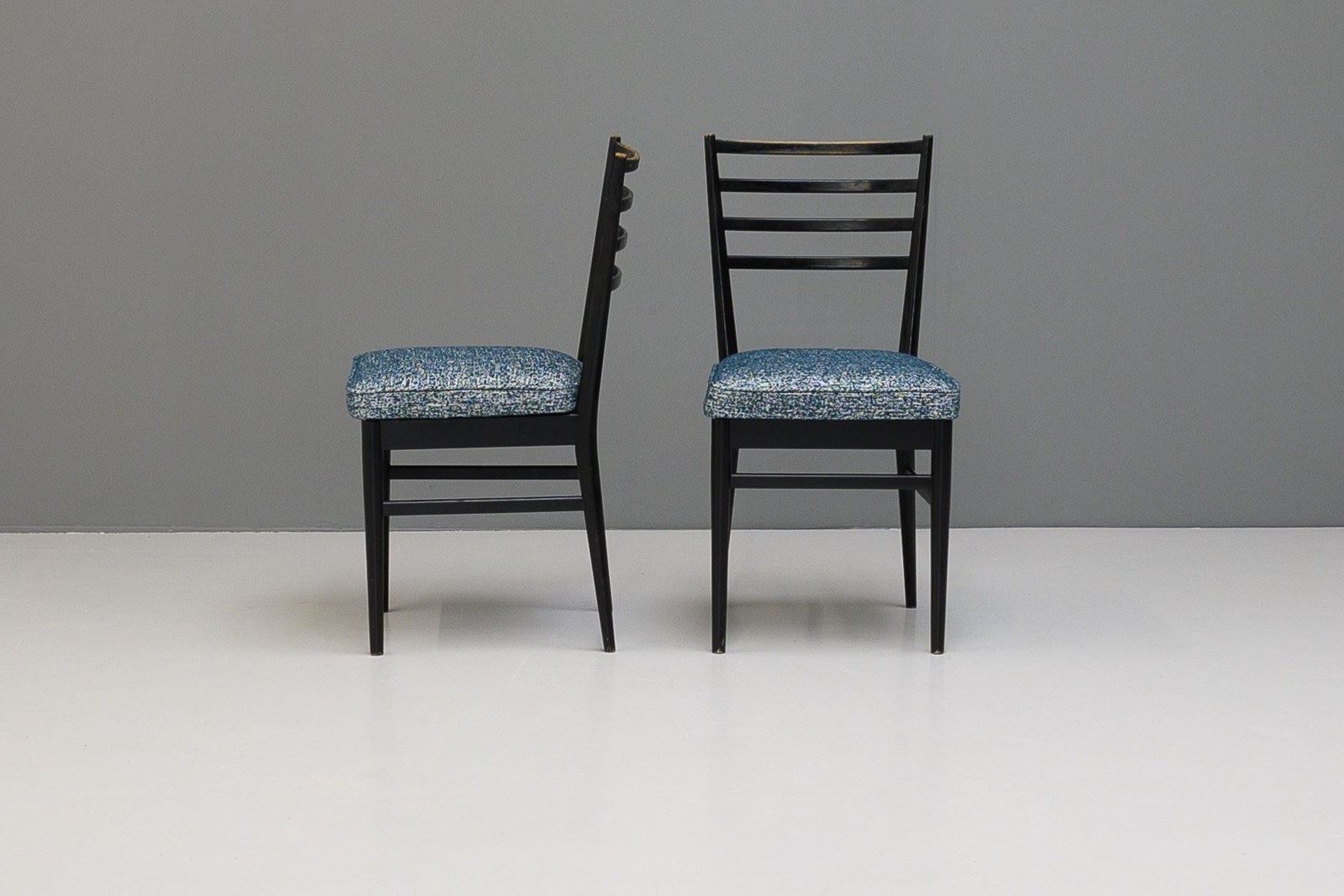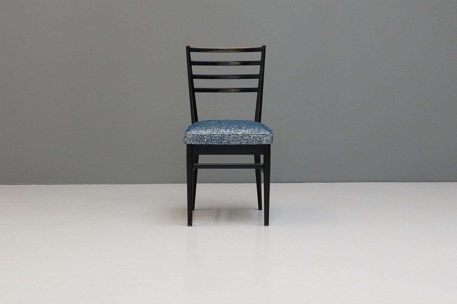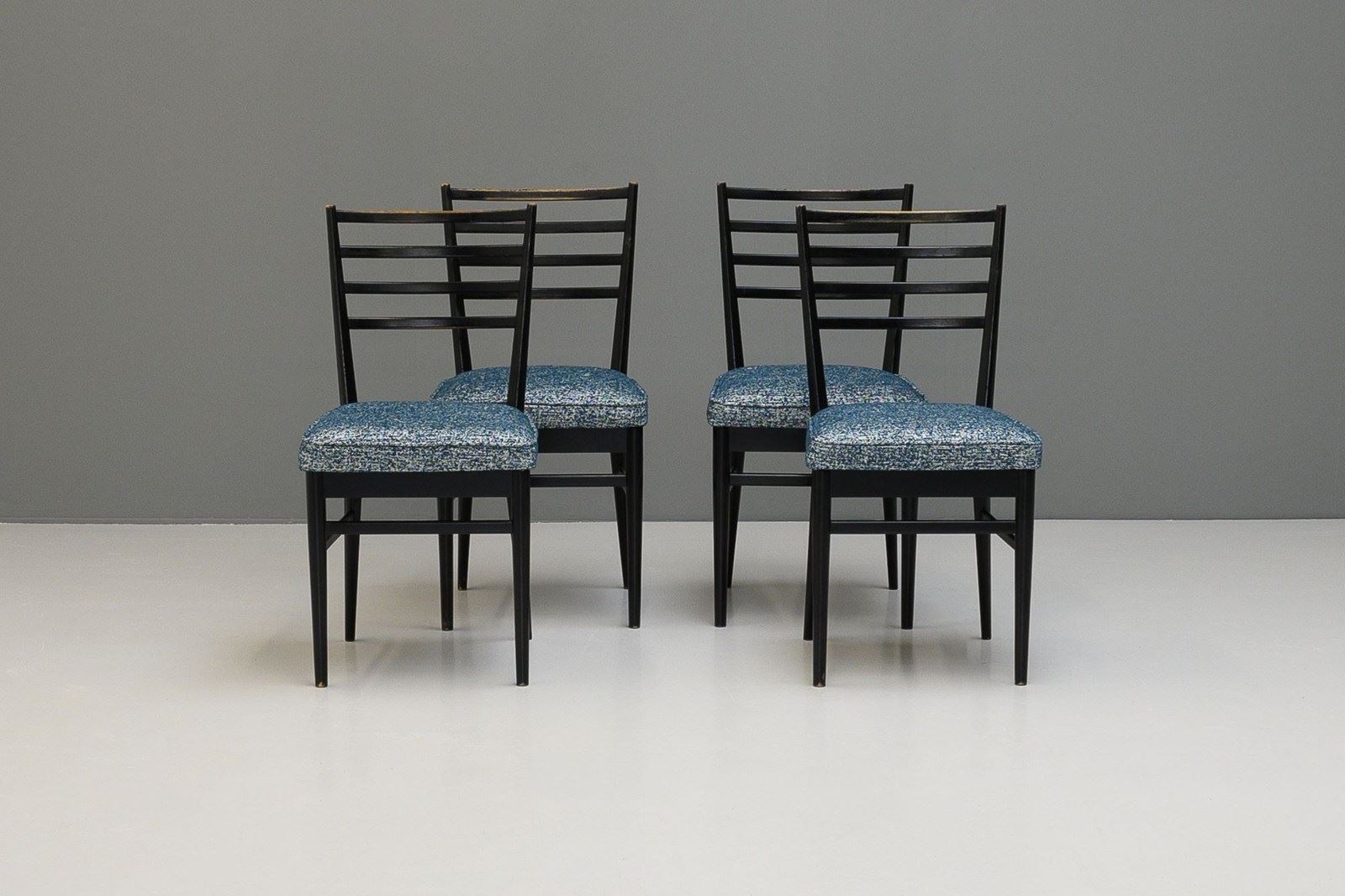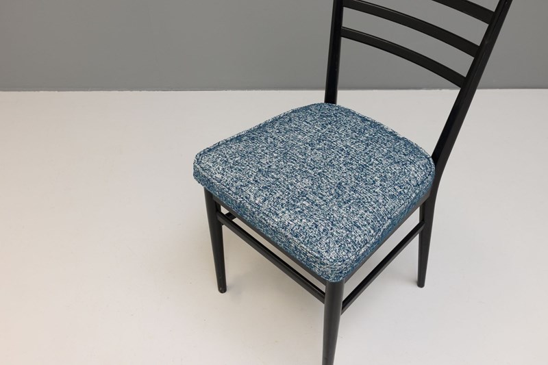Set of four ebonised dining chairs, in an Italian style, nicely worn on the spindle backs. Newly upholstered seat pads in a textured blue material.