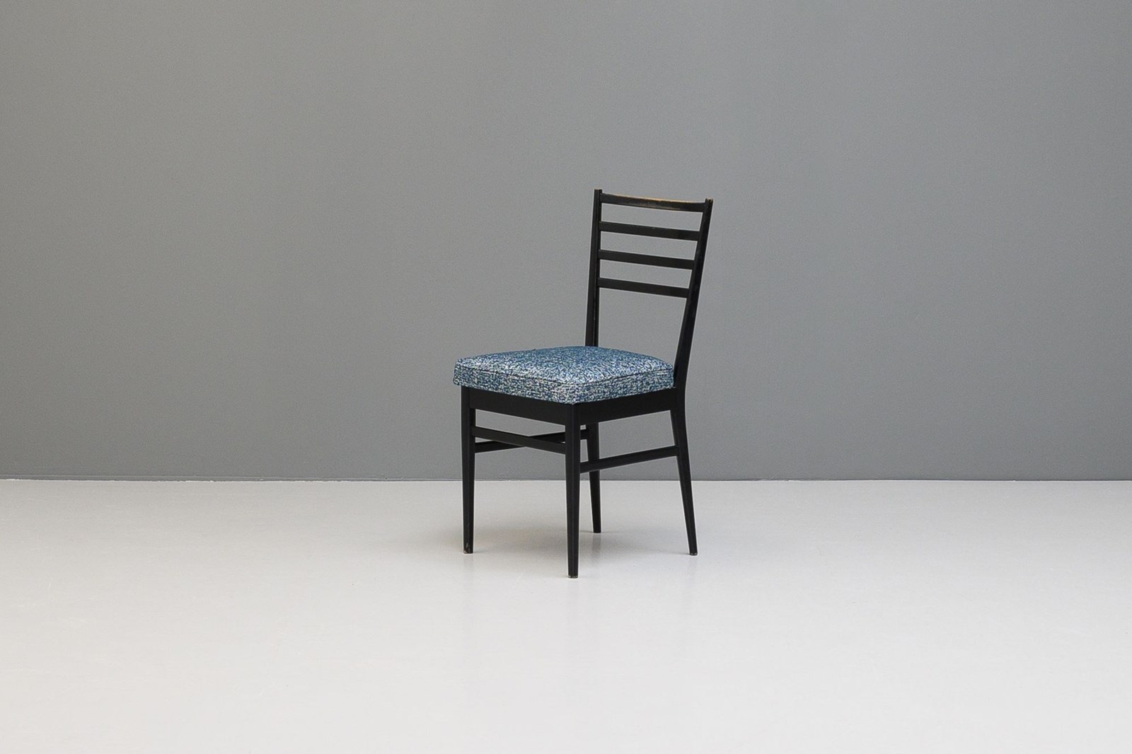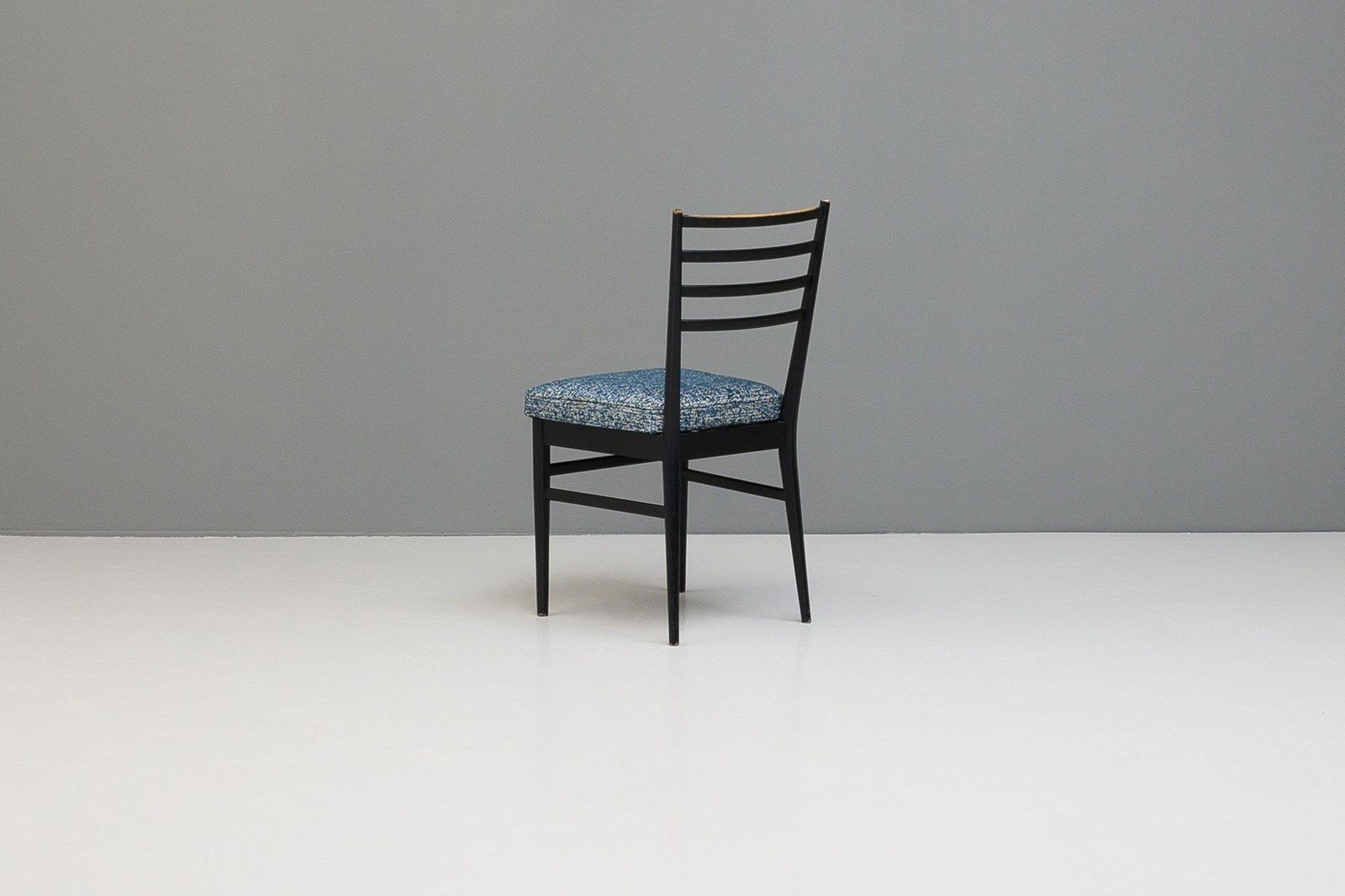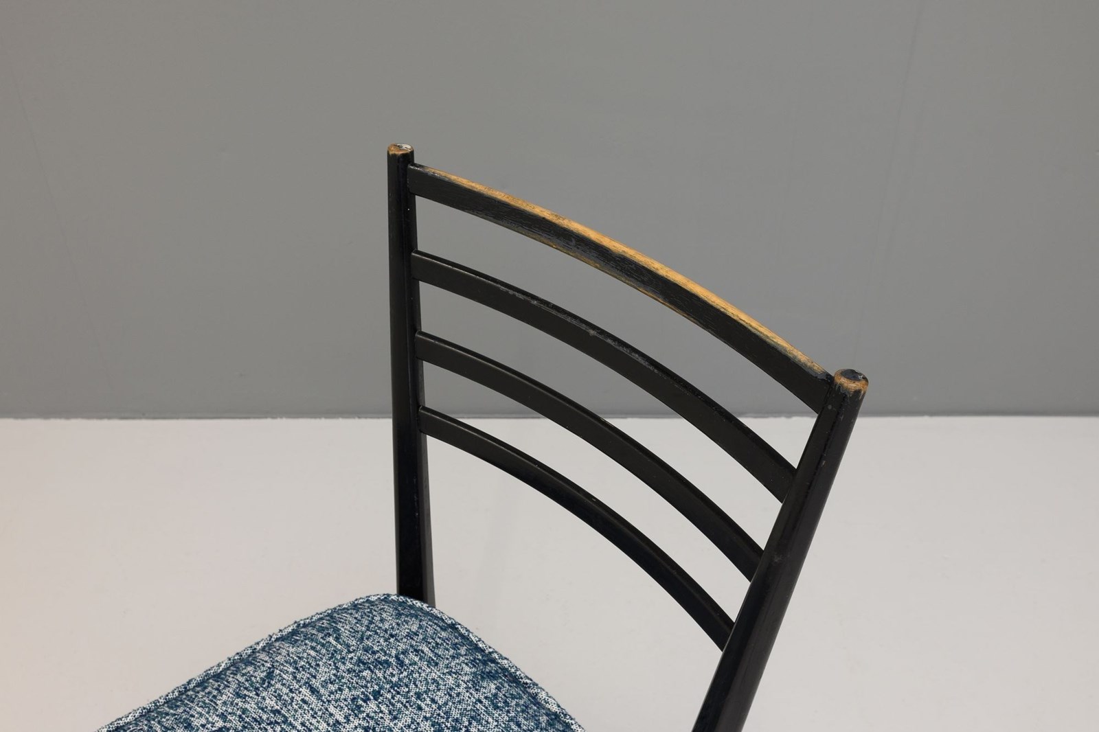 Set of four ebonised dining chairs, in an Italian style, nicely worn on the spindle backs. Newly upholstered seat pads in a textured blue material.
