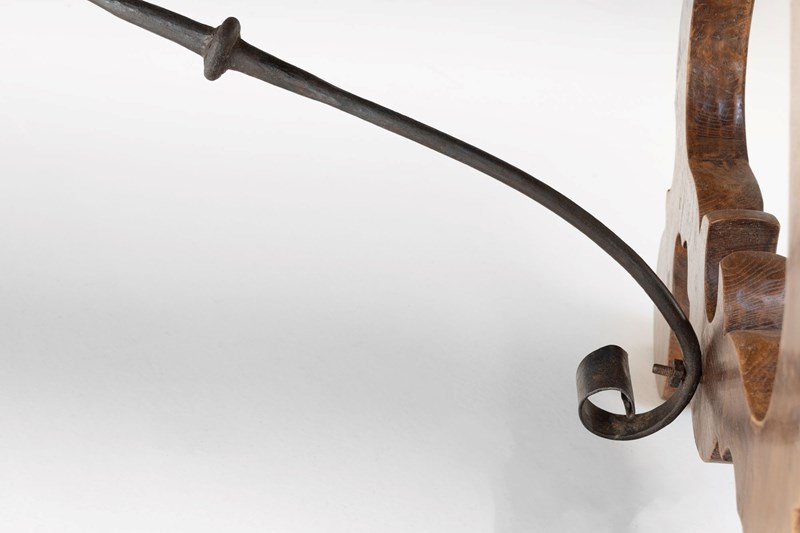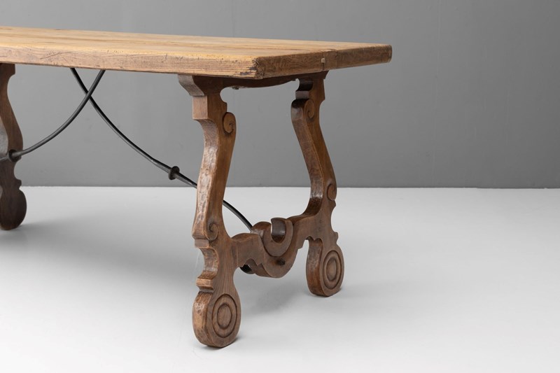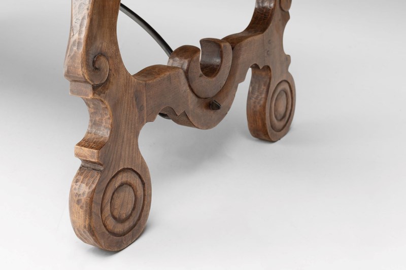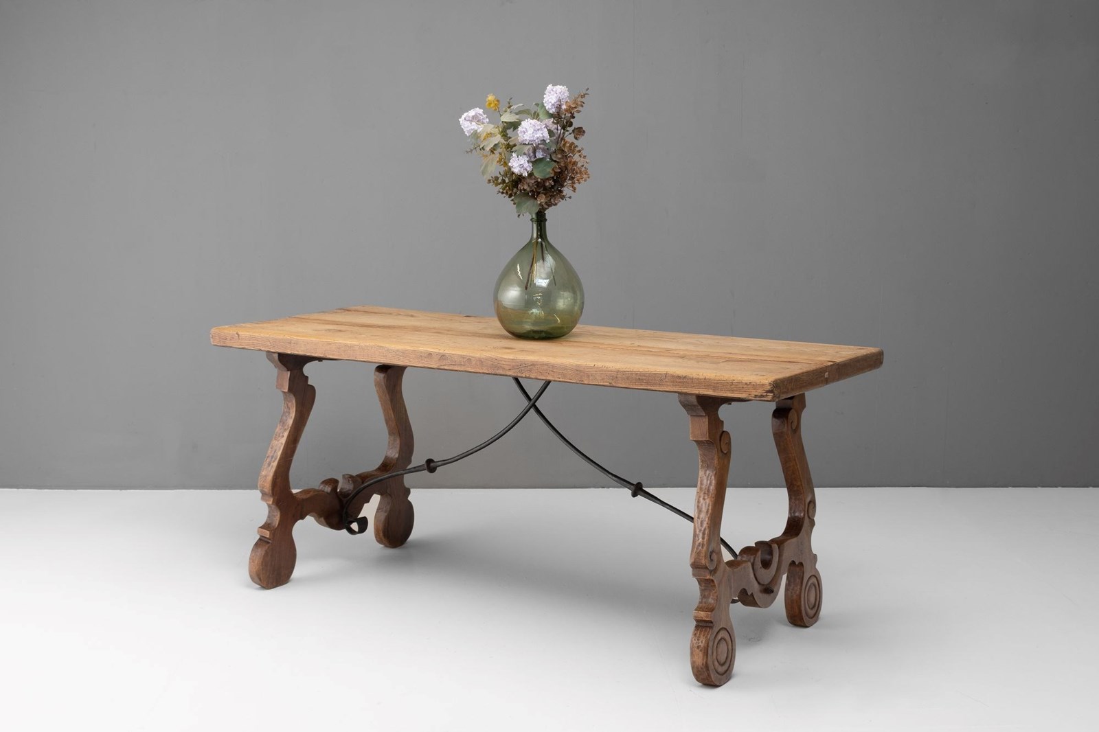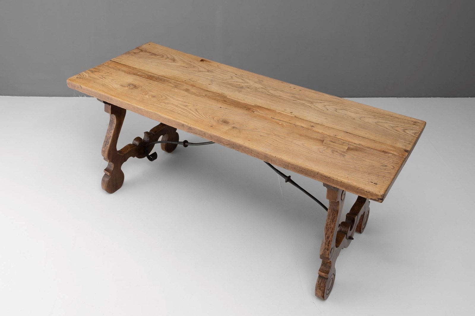 Spanish style walnut dining / console table with original metalwork. Circa 1930