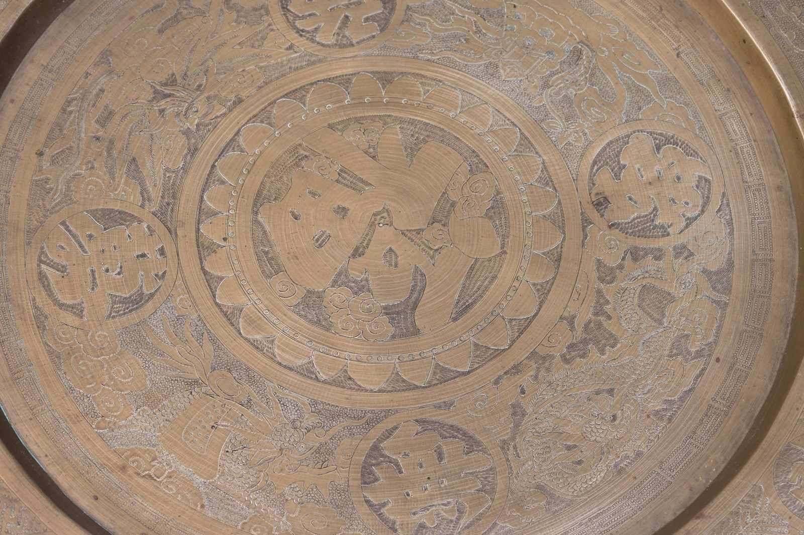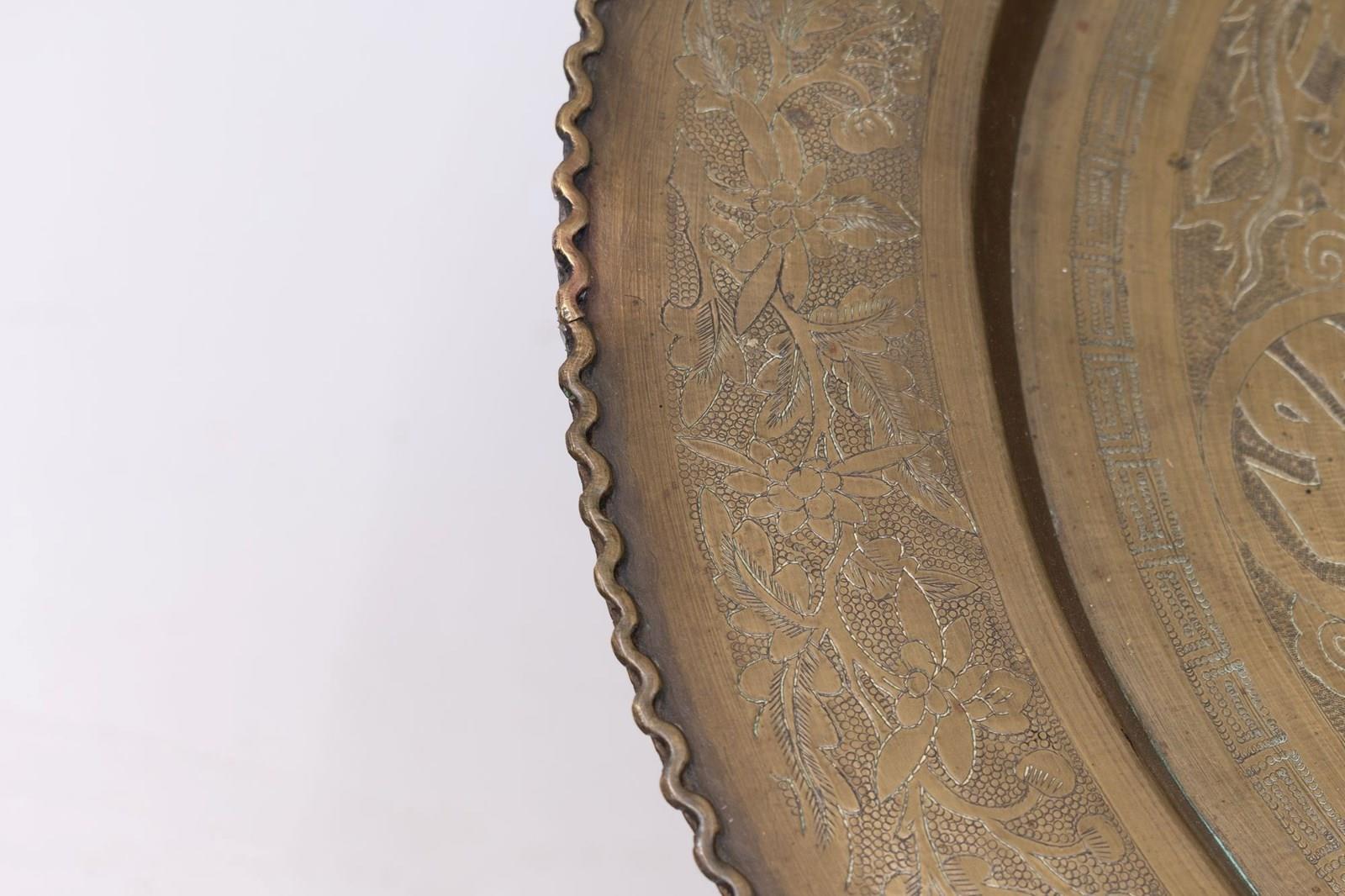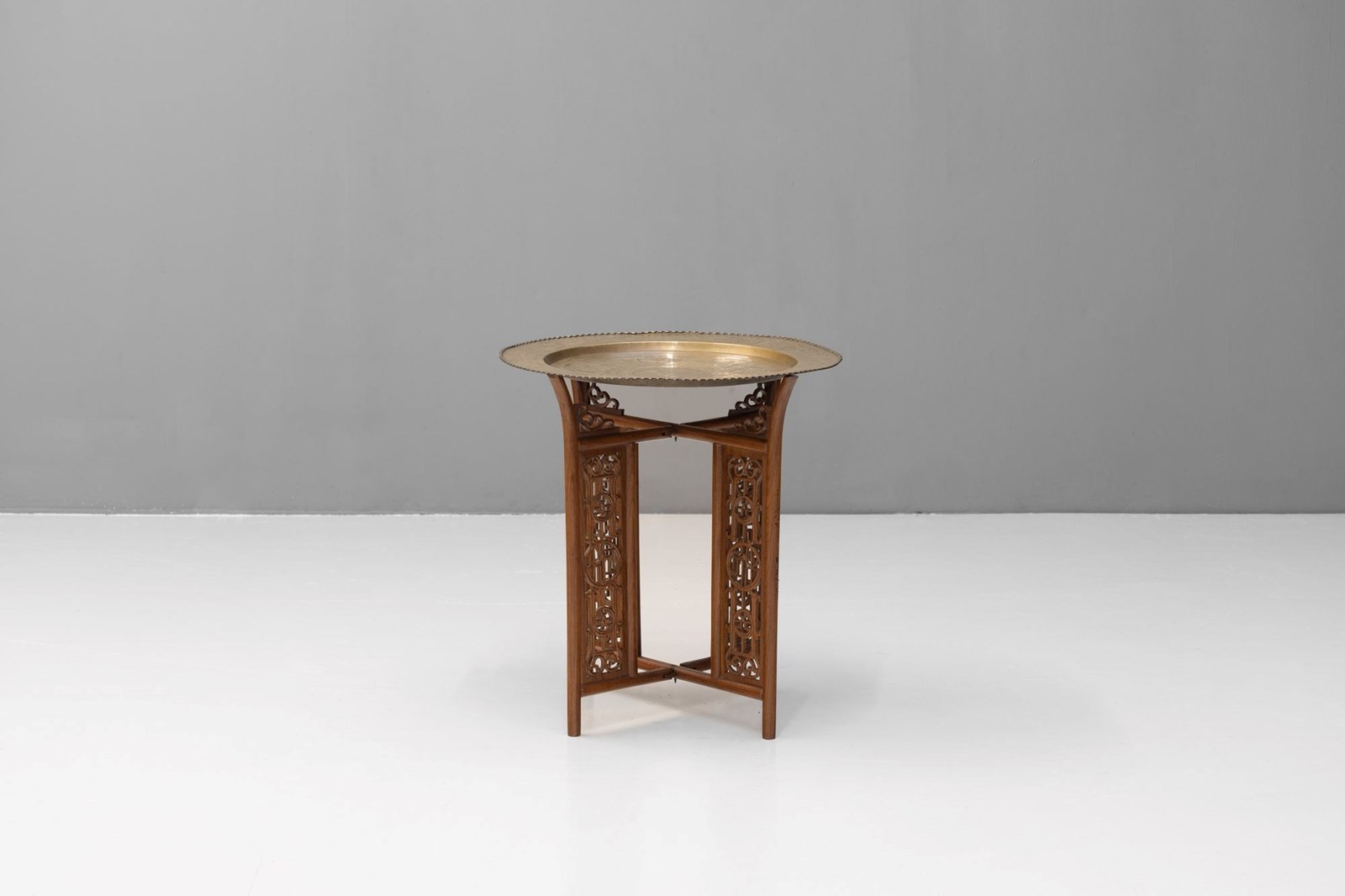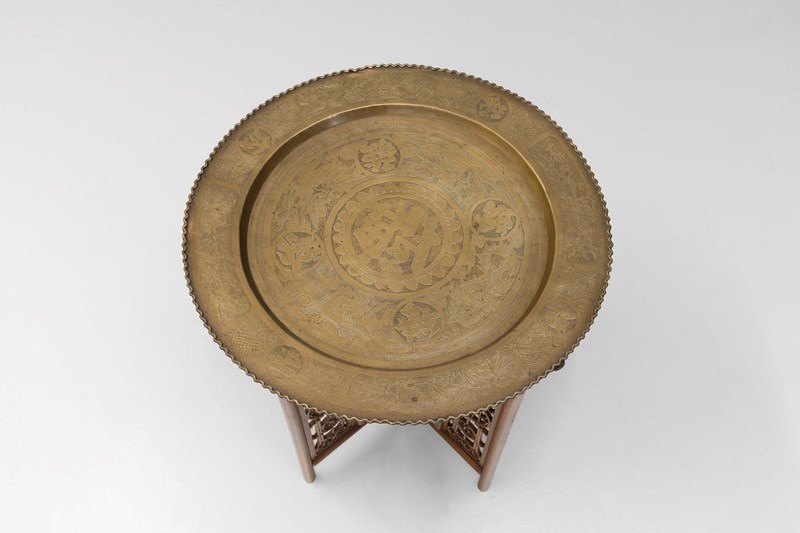 Brass dish top tray table with folding base. Circa 1930