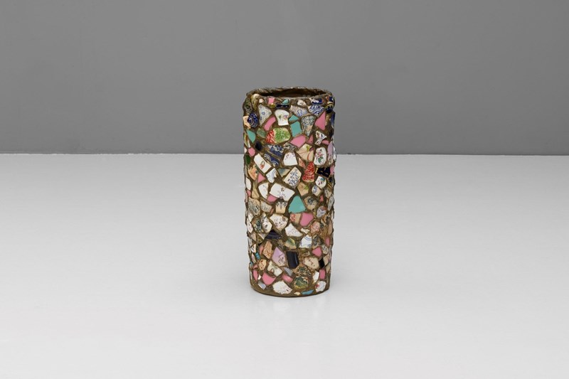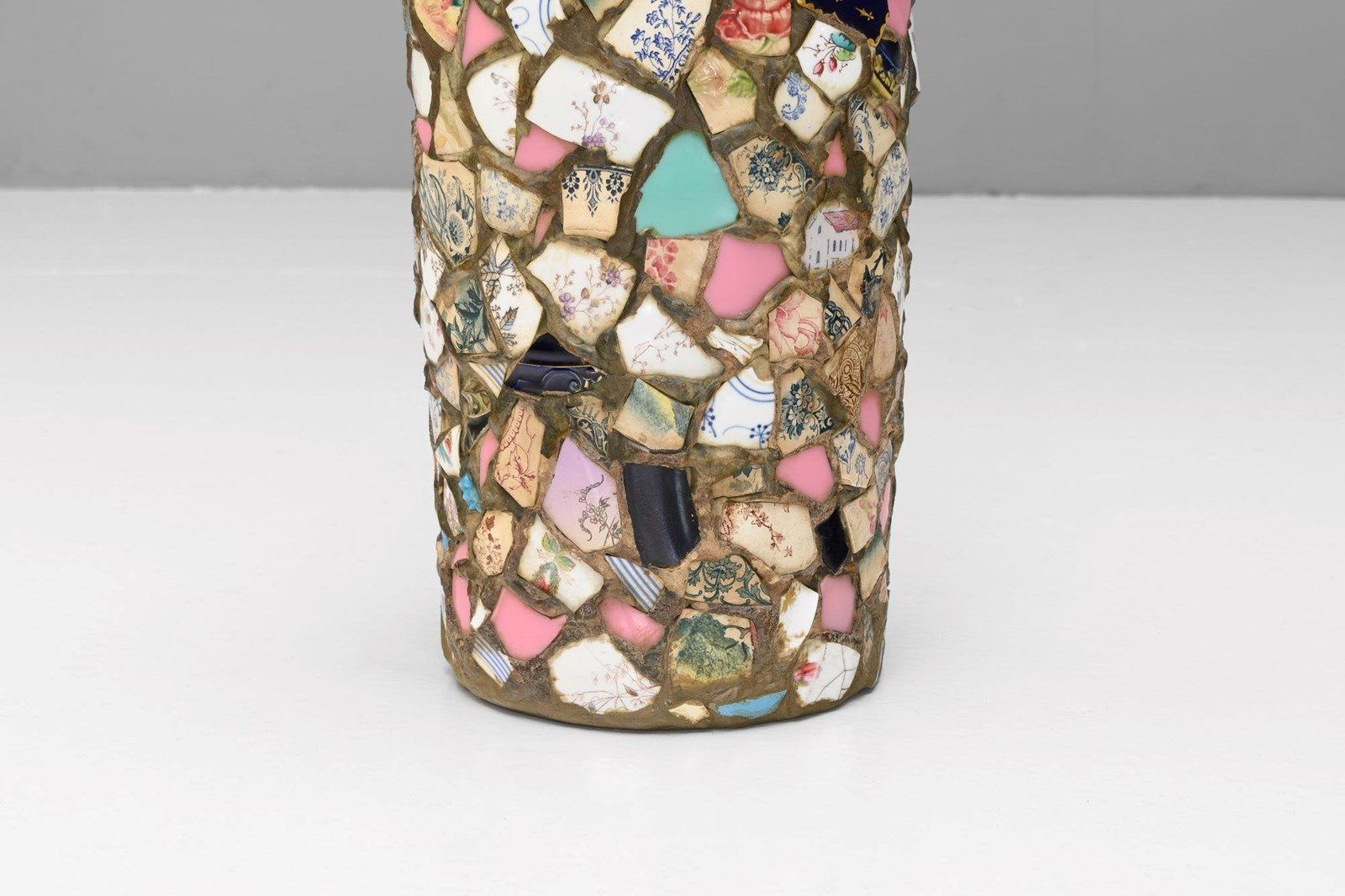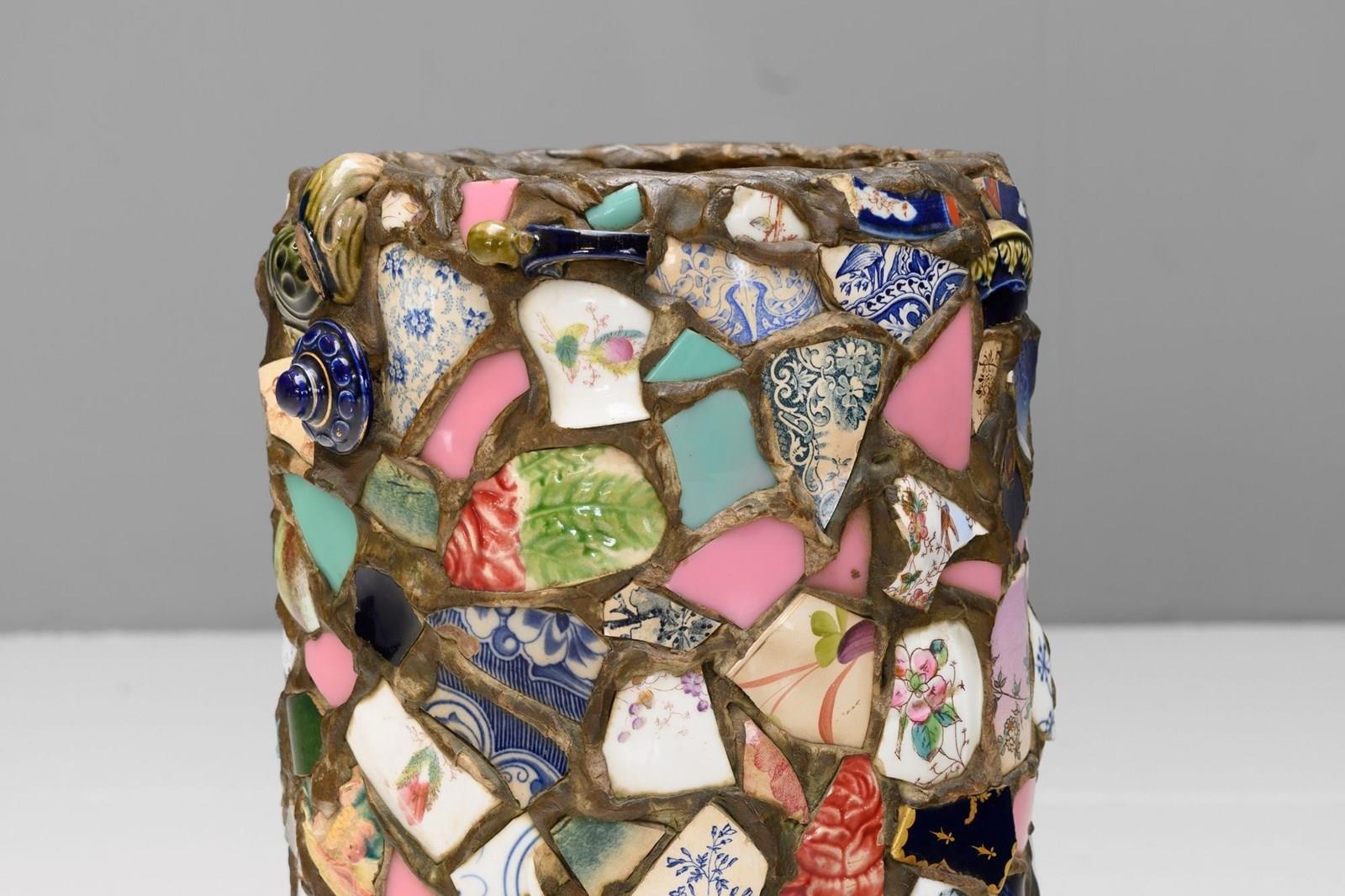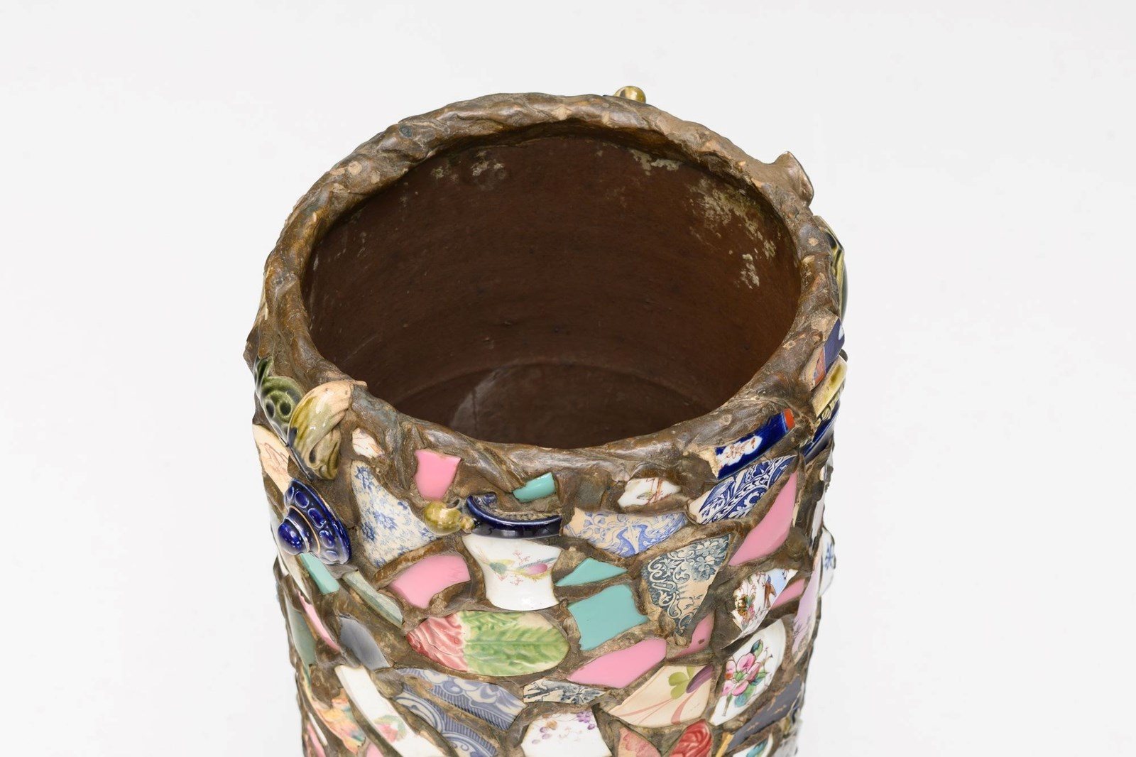 Terracotta umbrella stand with applied pottery shard decoration. Circa 1900.