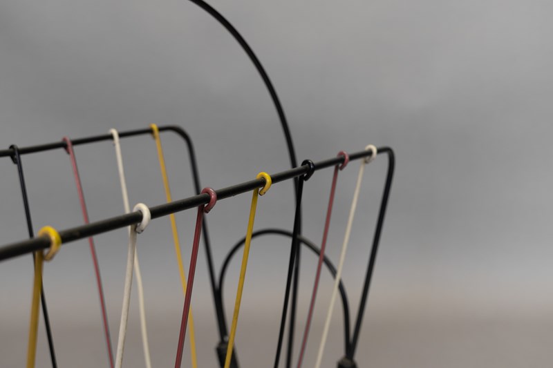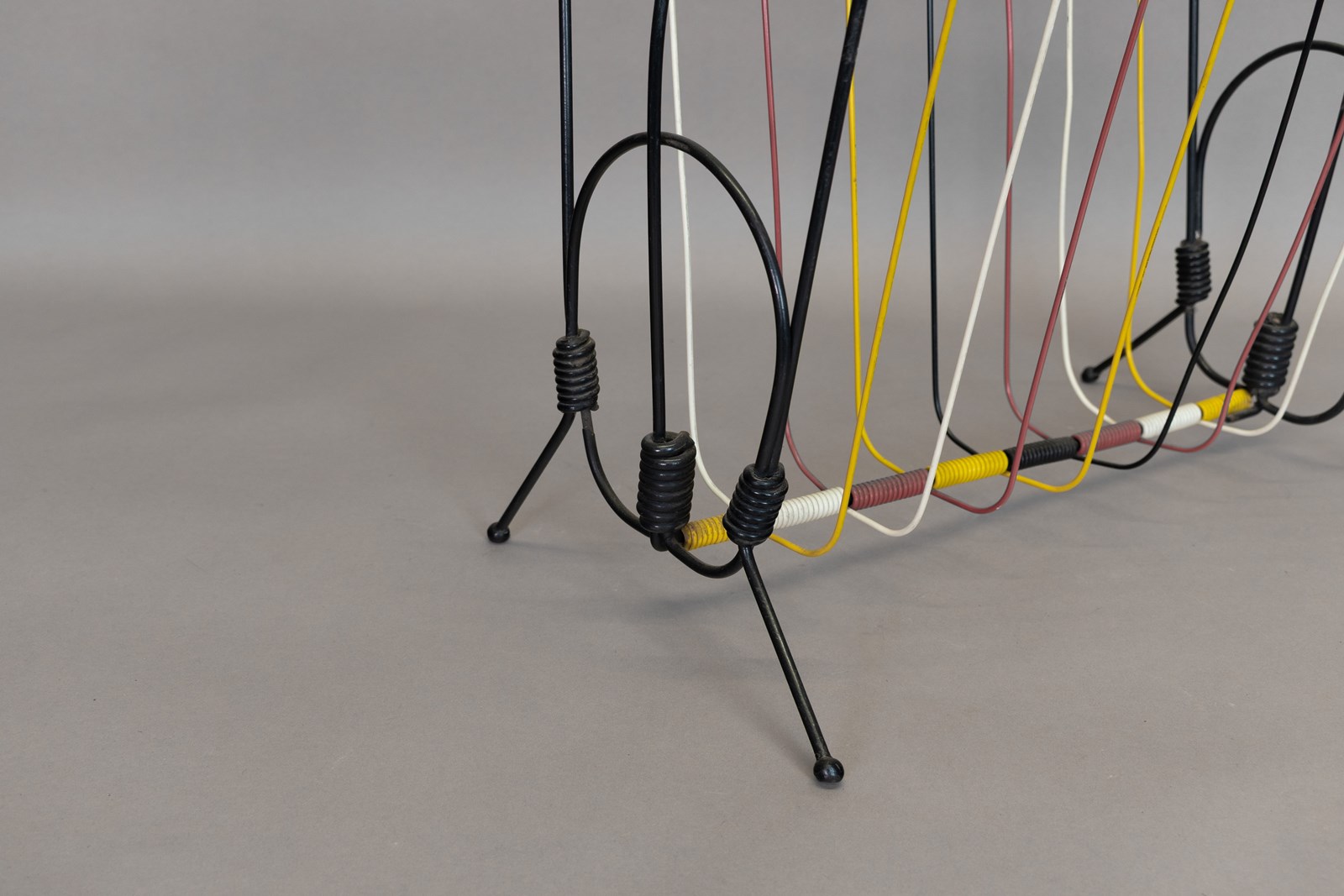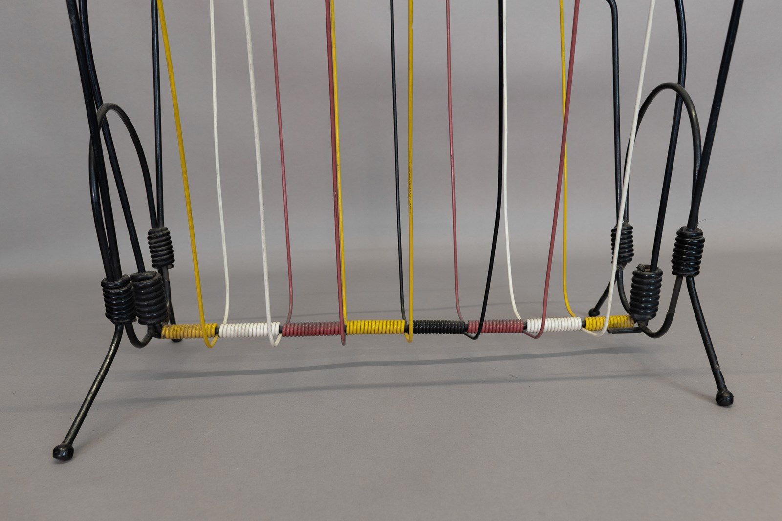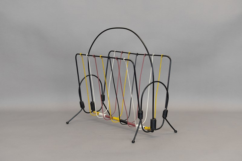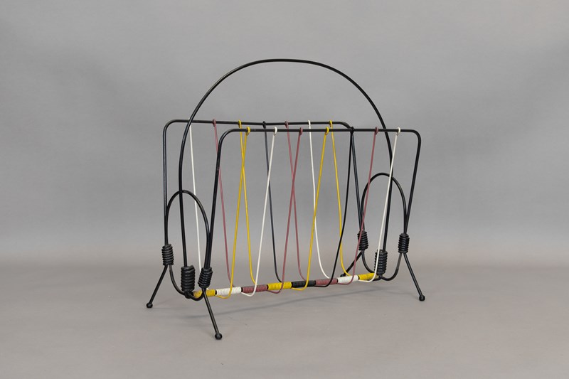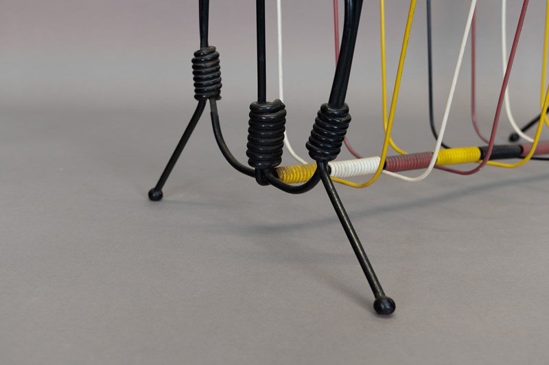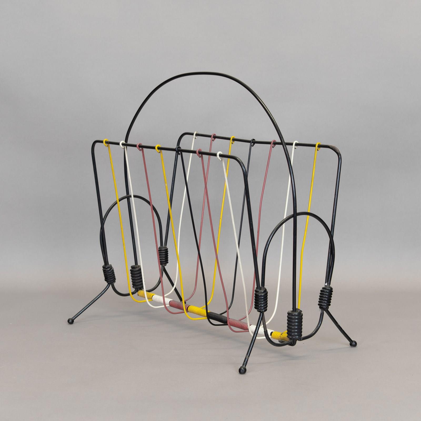 Mid-Century magazine rack in black and coloured wire. U.K circa 1970.