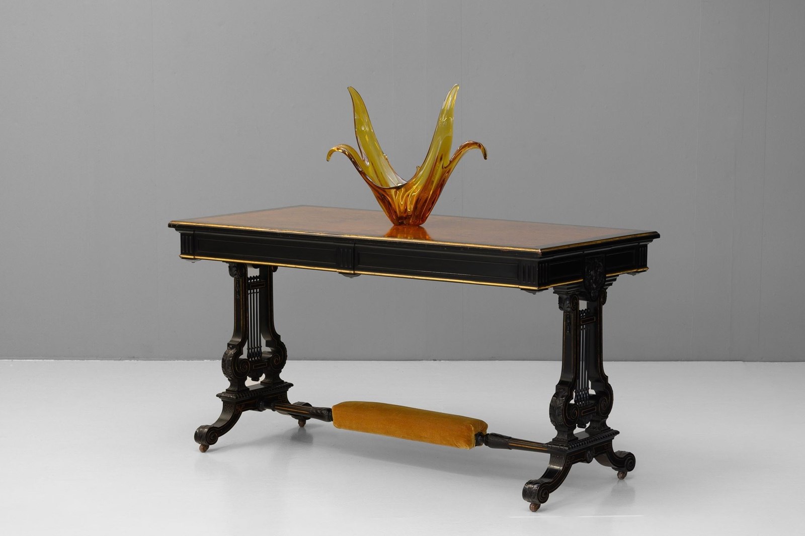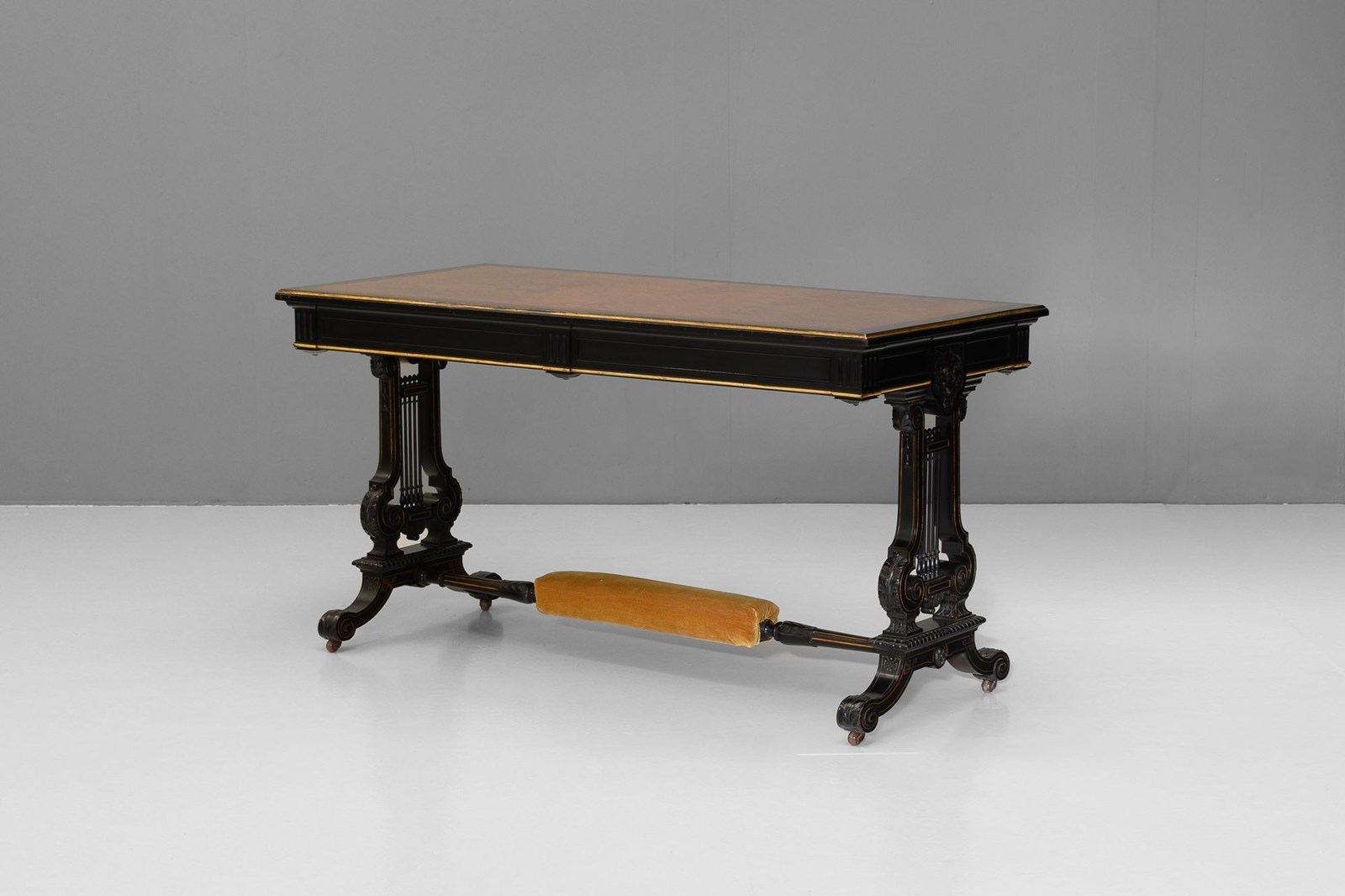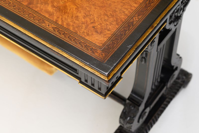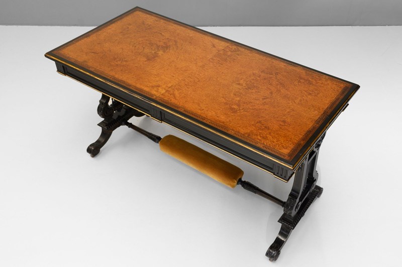 Ebonised Edwardian writing table with Birds Eye maple panel inset top. Circa 1890.