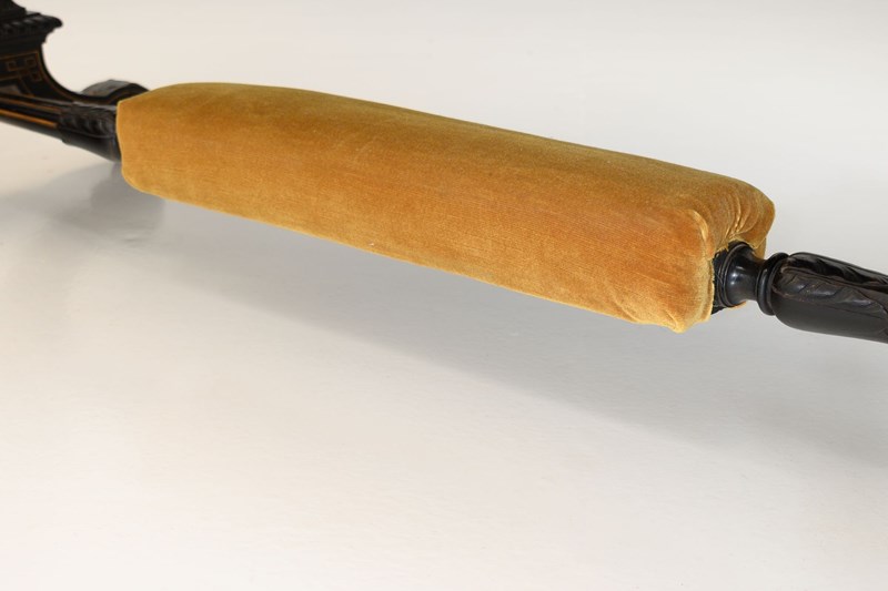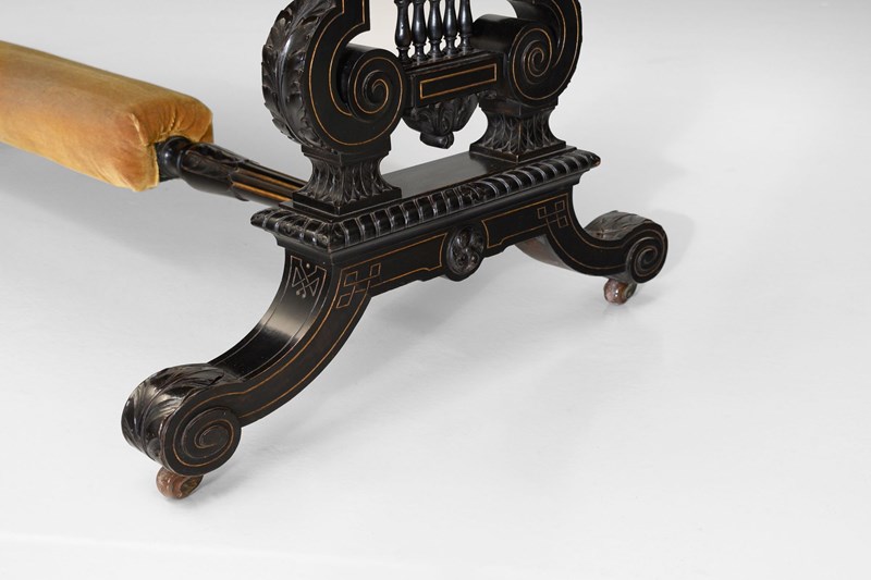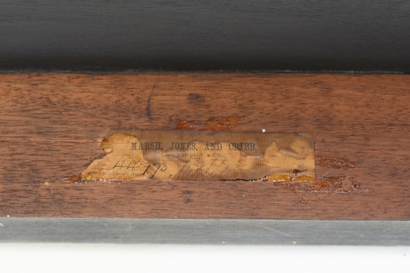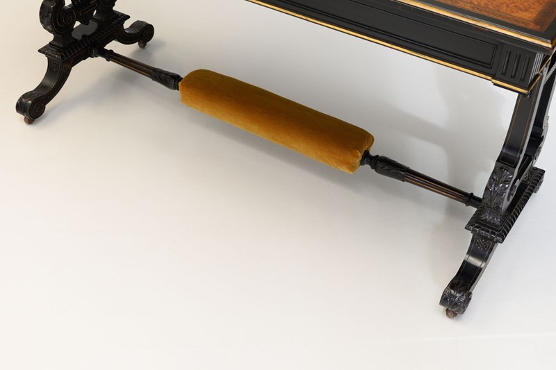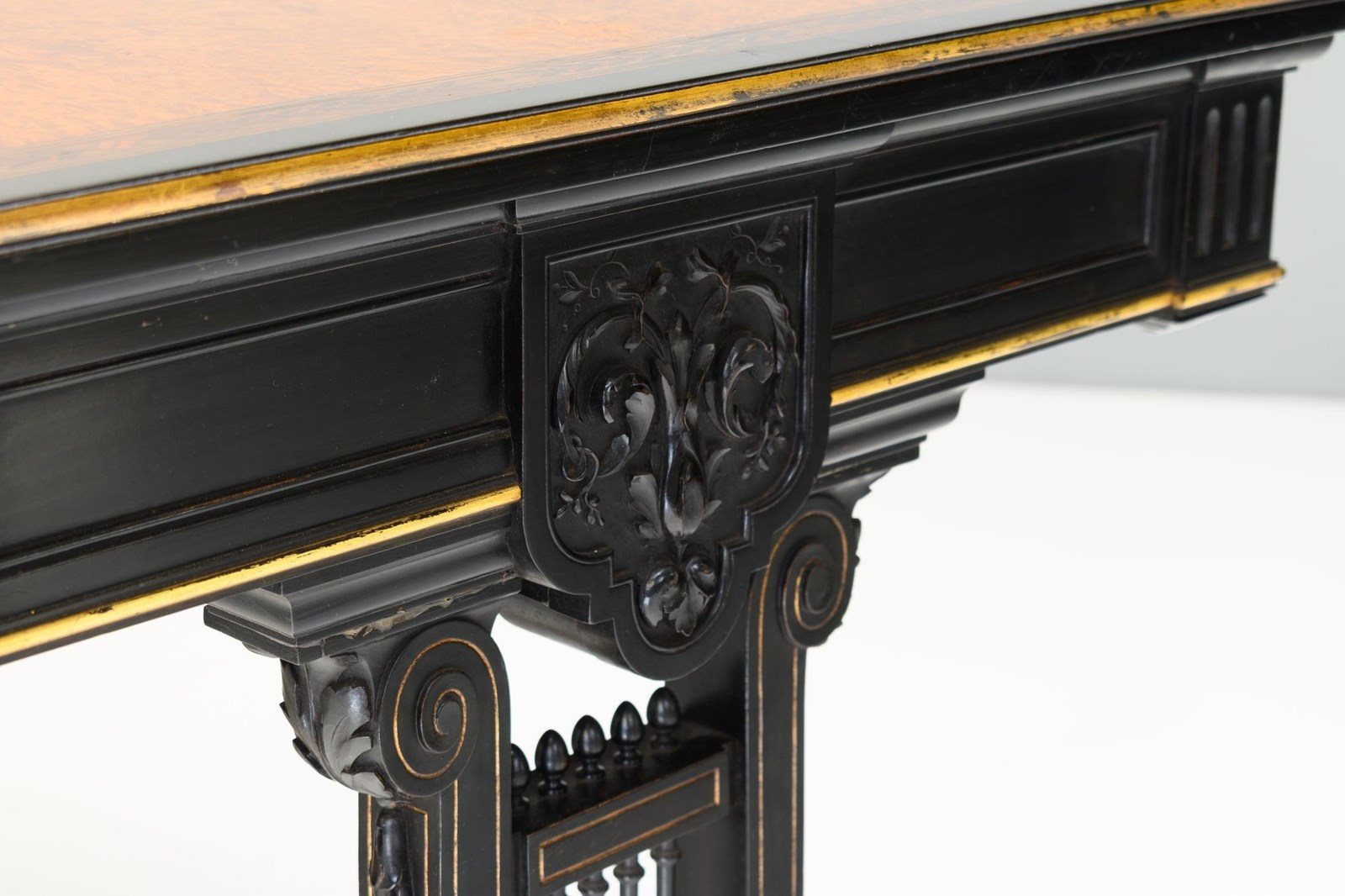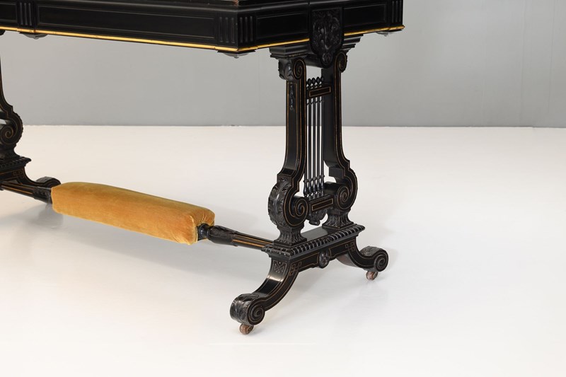 Ebonised Edwardian writing table with Birds Eye maple panel inset top. Circa 1890.