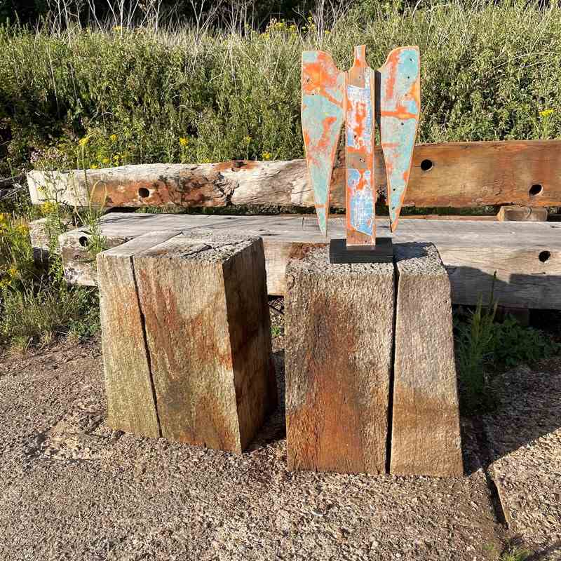 Painted driftwood & boat wood salvage on a wooden base. Signed on wing.