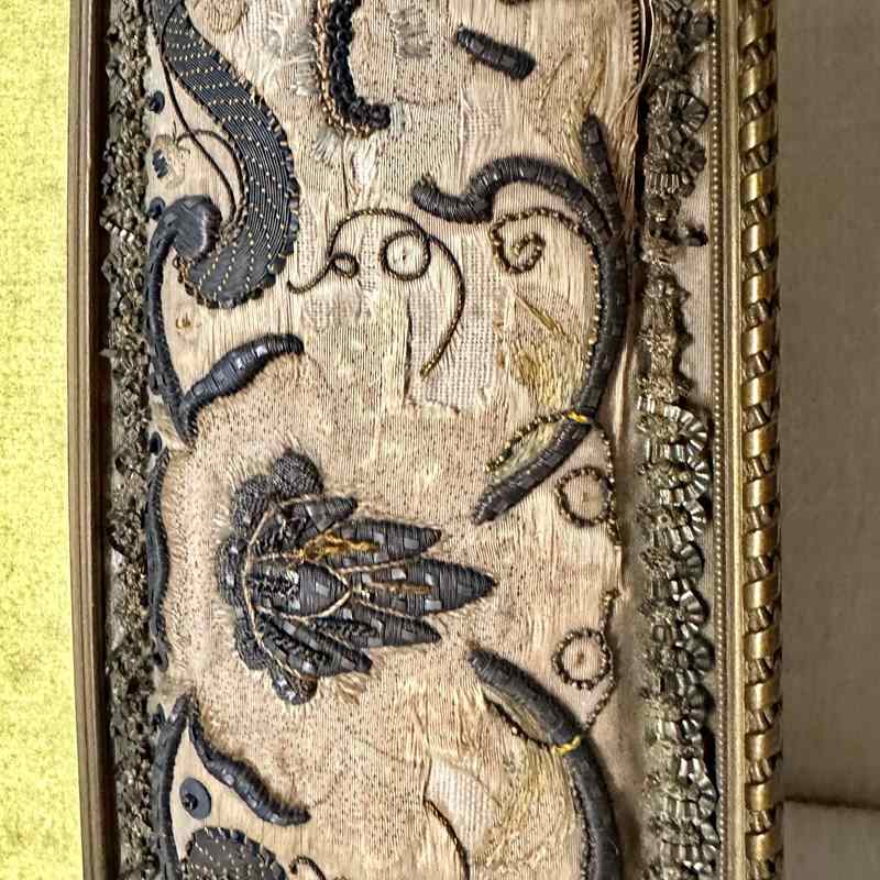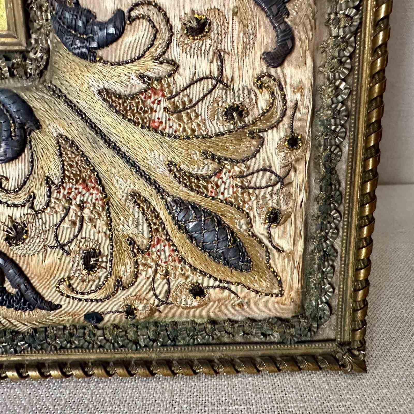 Beautifully detailed and rich with symbolism. The exceptionally skilful embroiderer has used a complex range of contrasting stitches to create texture. Each element has been worked in silk, wool, silver and gold threads.