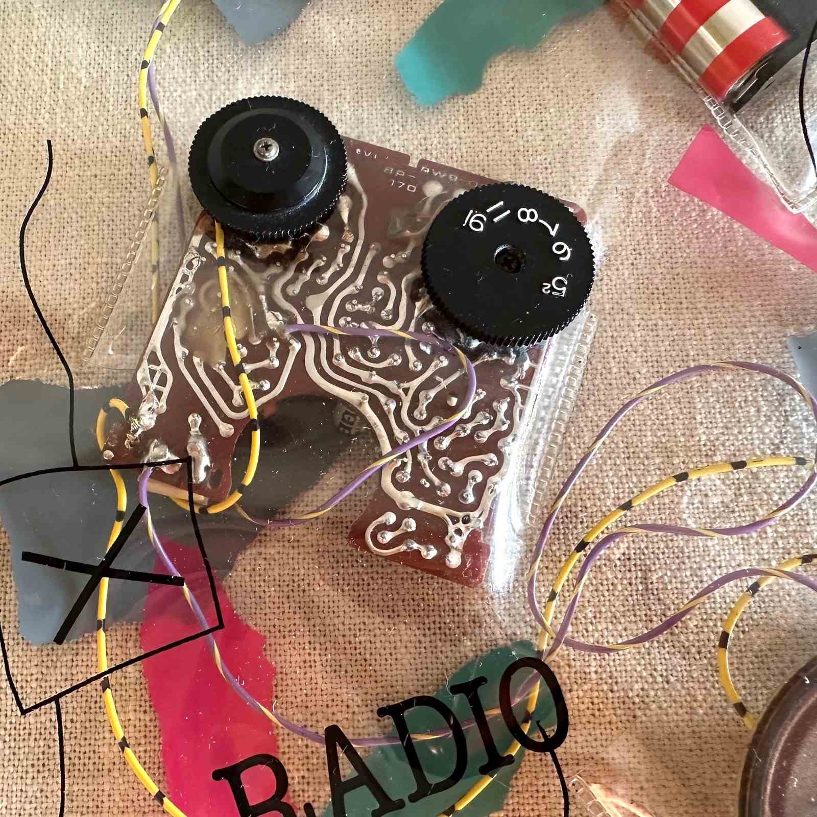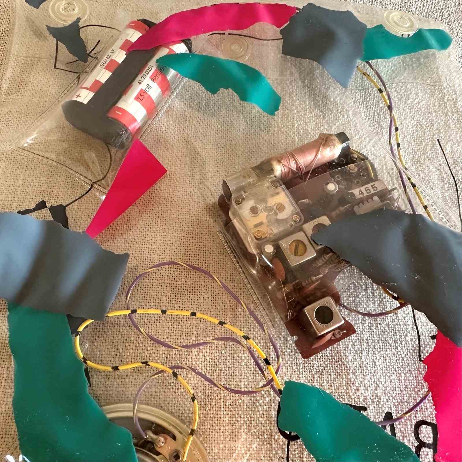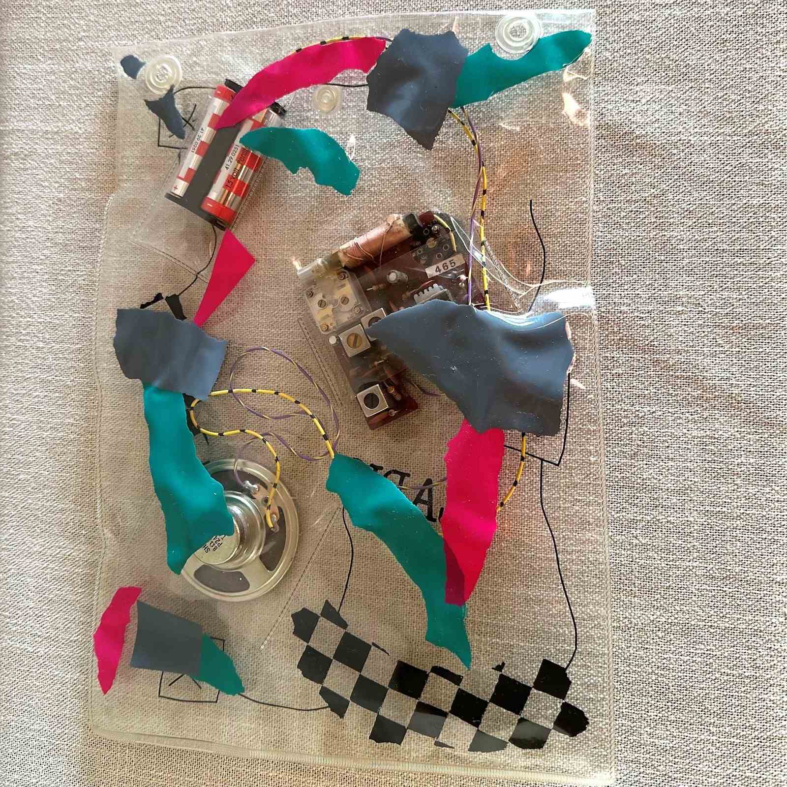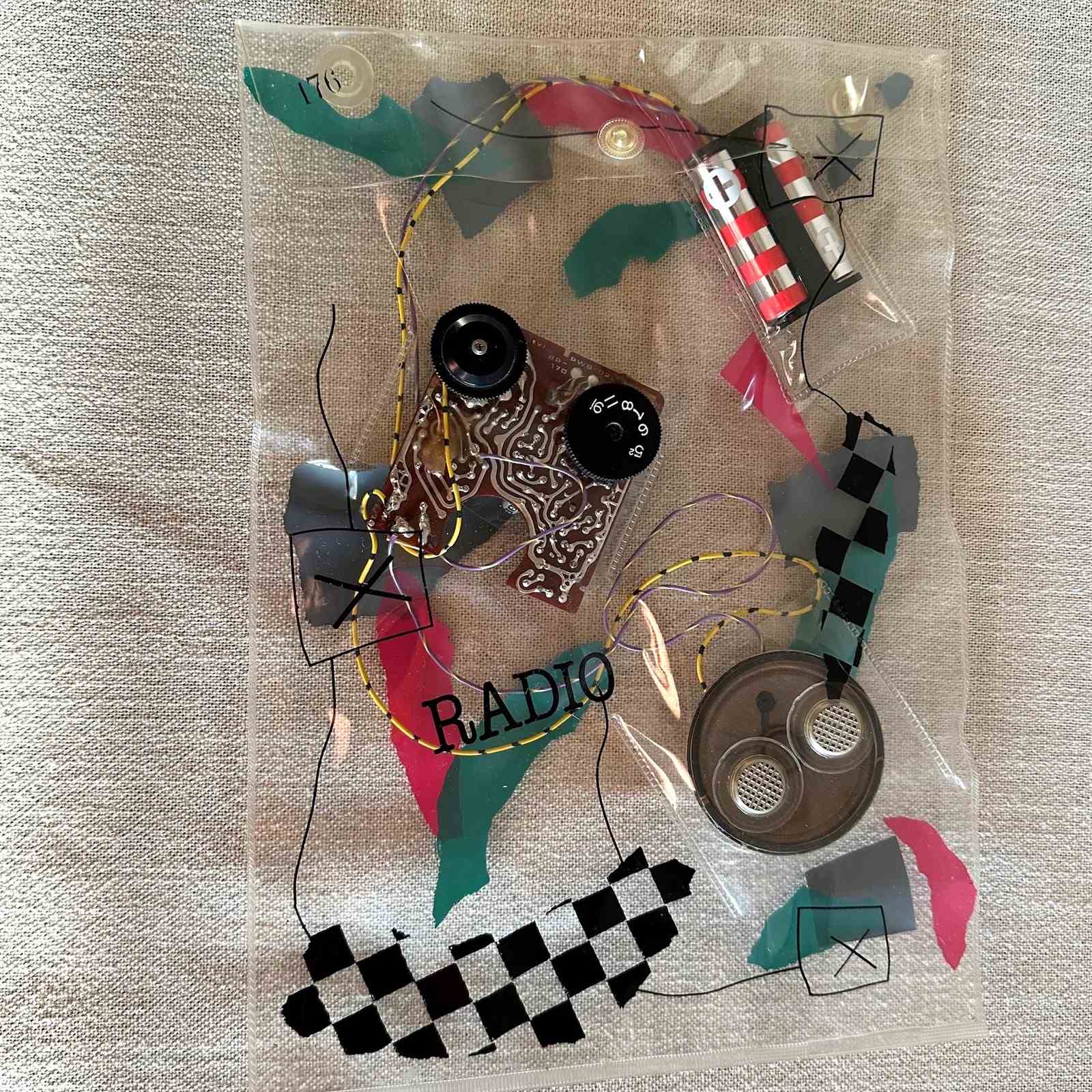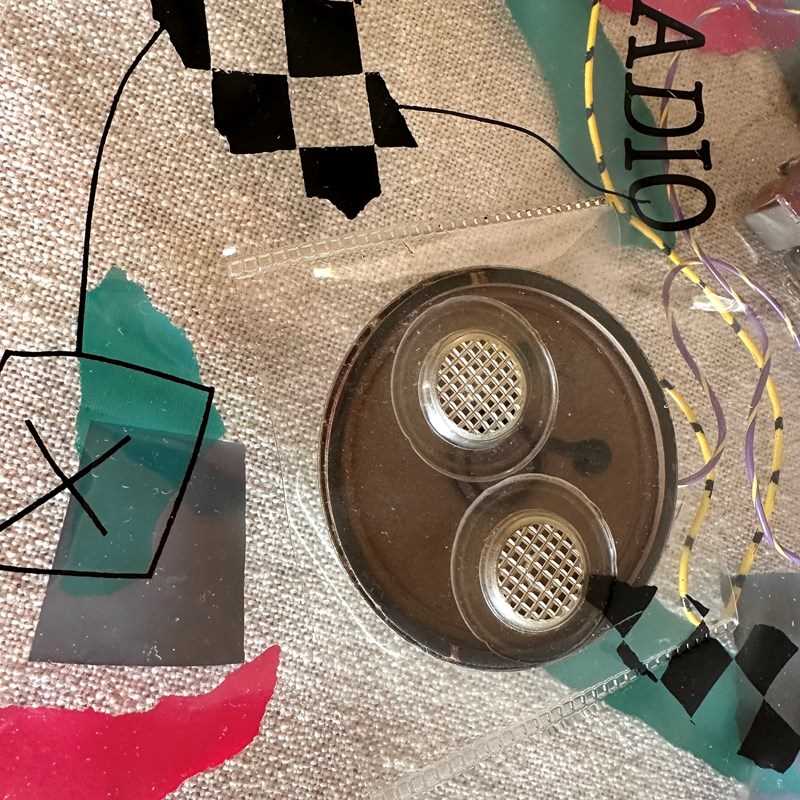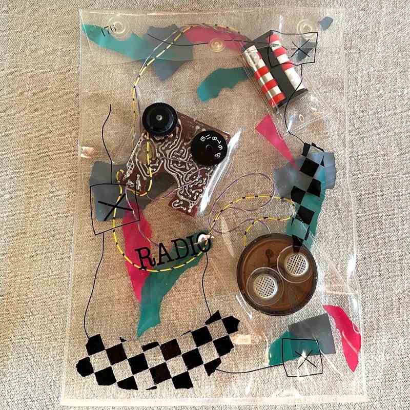 Daniel Weil's "Bag" radio freed the inner parts of a radio by housing them in a clear plastic bag decorated with brightly coloured graphics. The radio components become part of the decoration, a result which subverts the 1980s concept of the rectangular black box audio equipment.