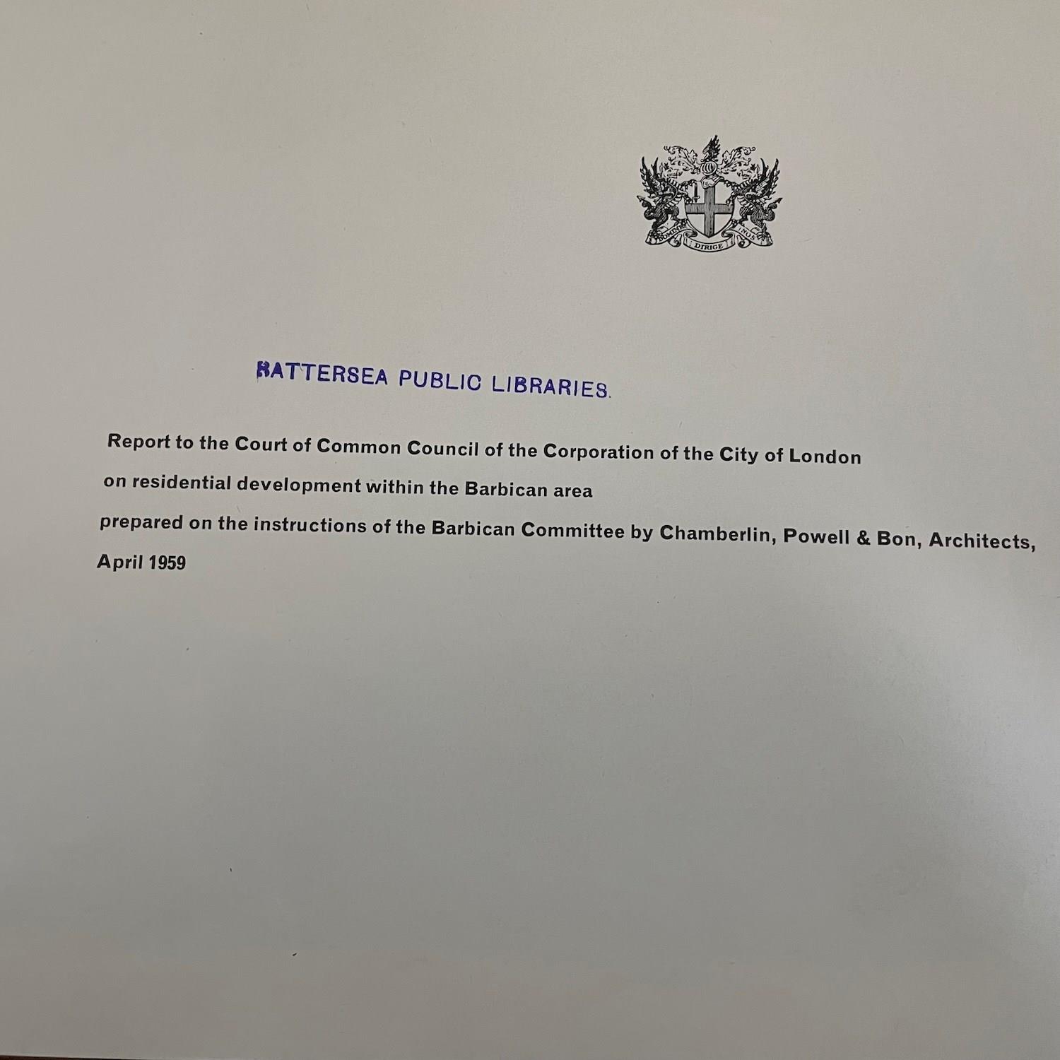 Report to the common Council of the Corporation of the City of London on the residential development within the Barbican area. Chamberlin Powell & Bon 1959. 1st Edition Hardcover 360x250mm. Ex Wandsworth Library.