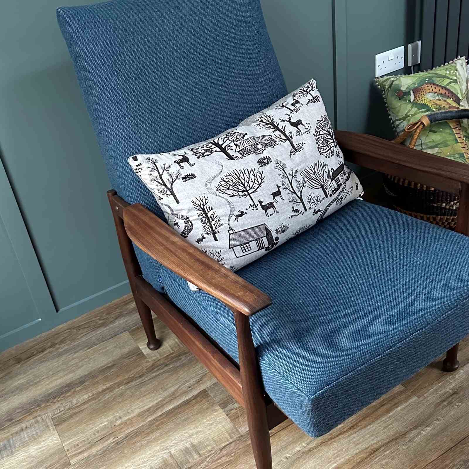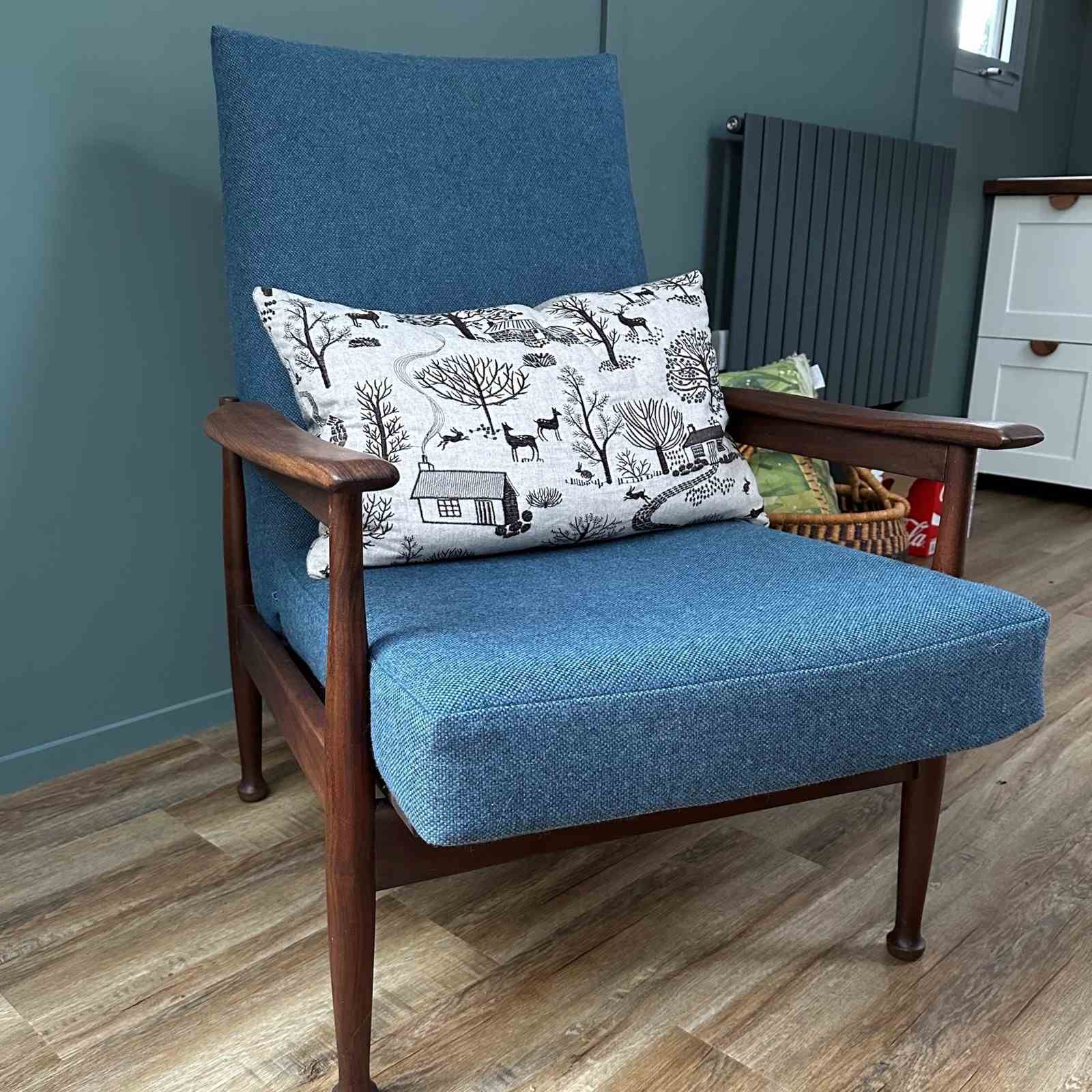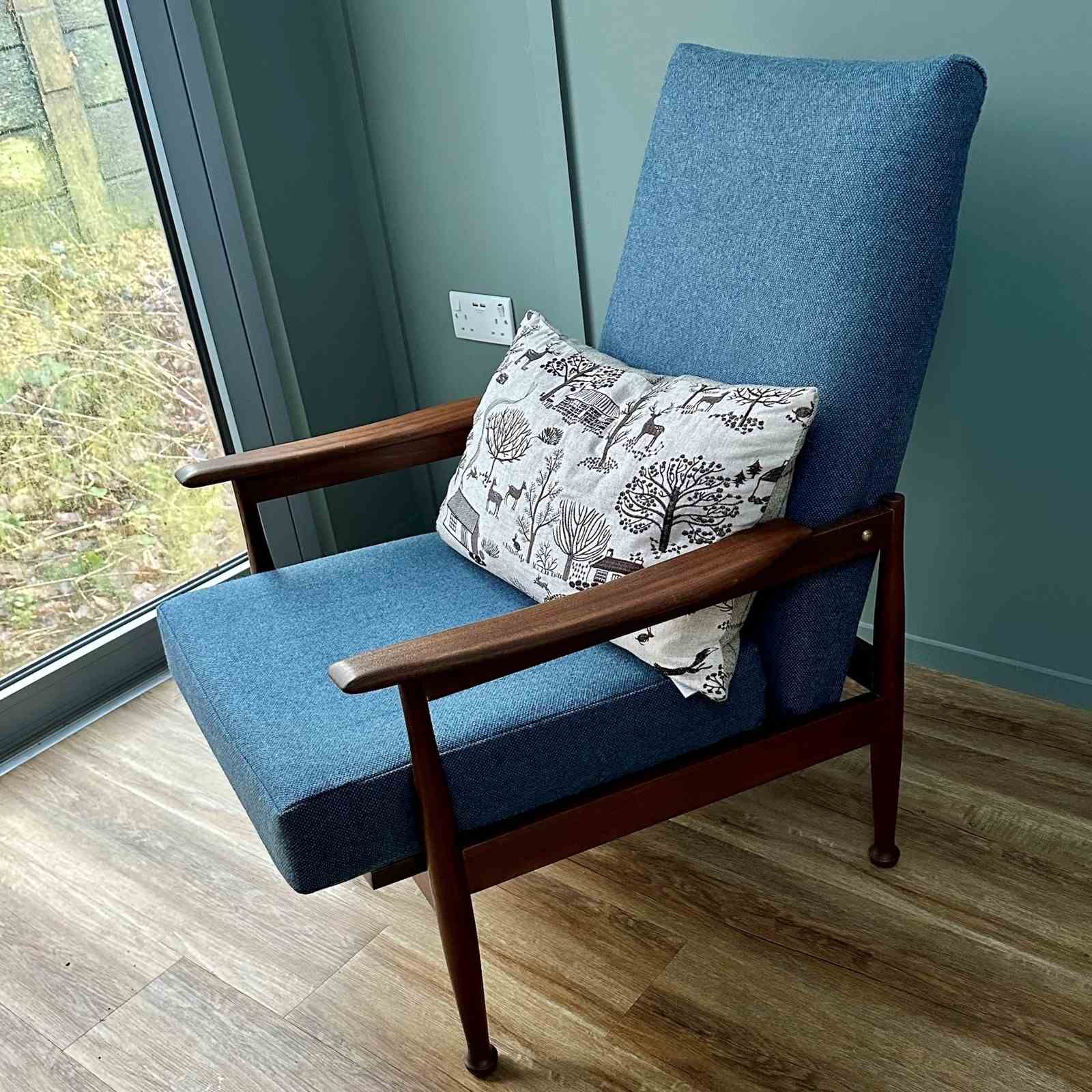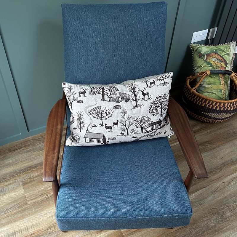 The armchair has been professionally reupholstered in a Bute Fabrics 100% new wool Tweed Fabric, Siberian Colourway, about 4 years ago. The webbing has been replaced, and the seating is very comfortable.