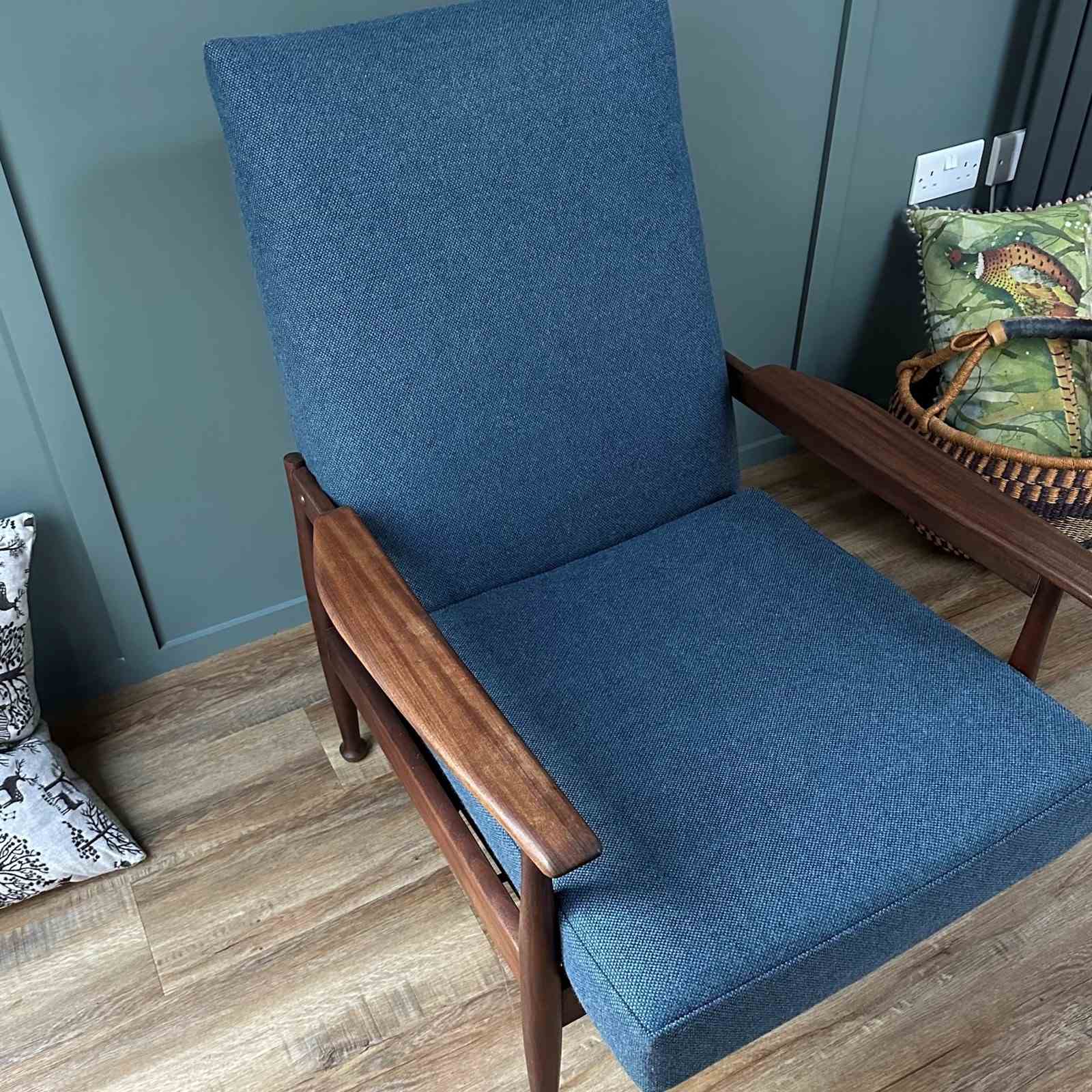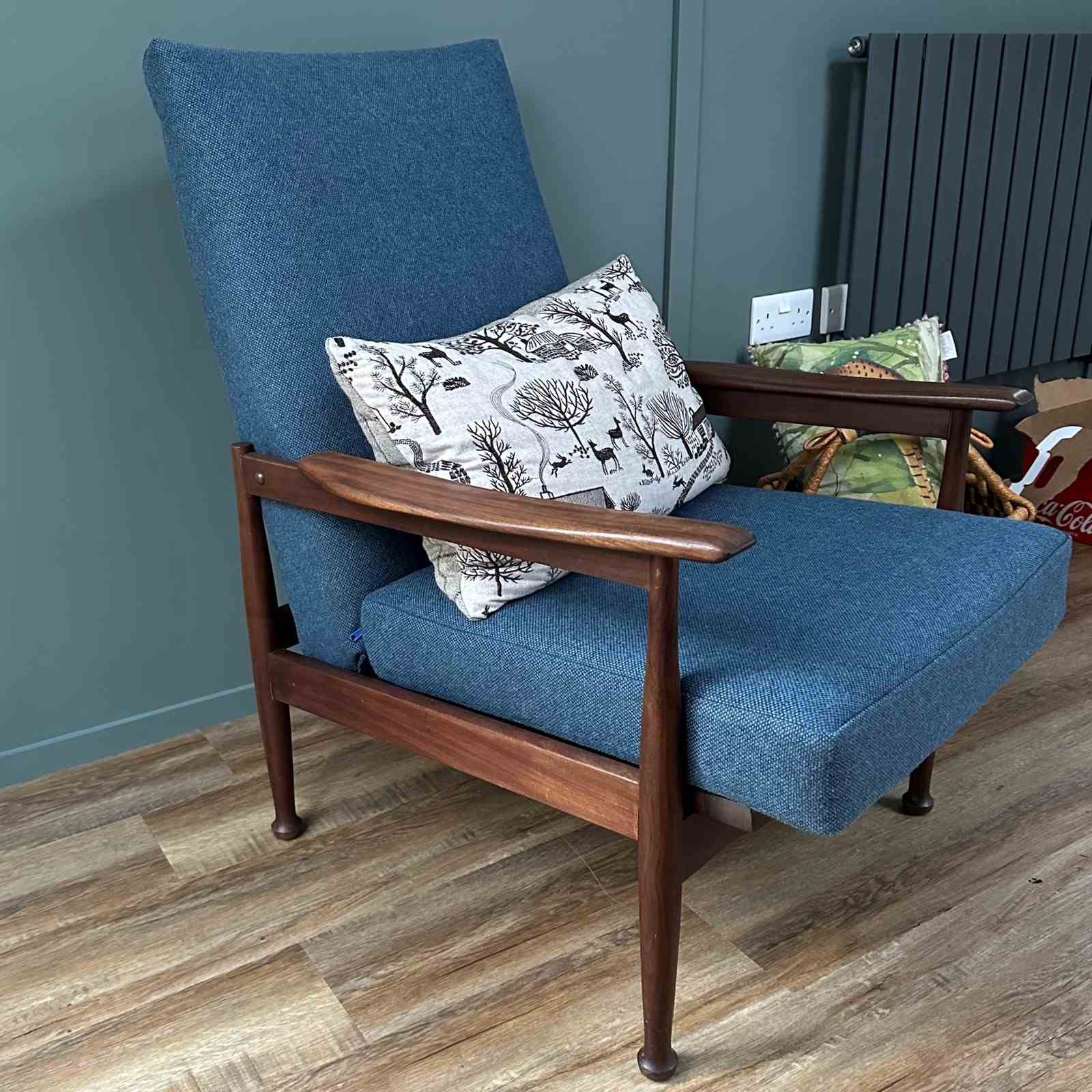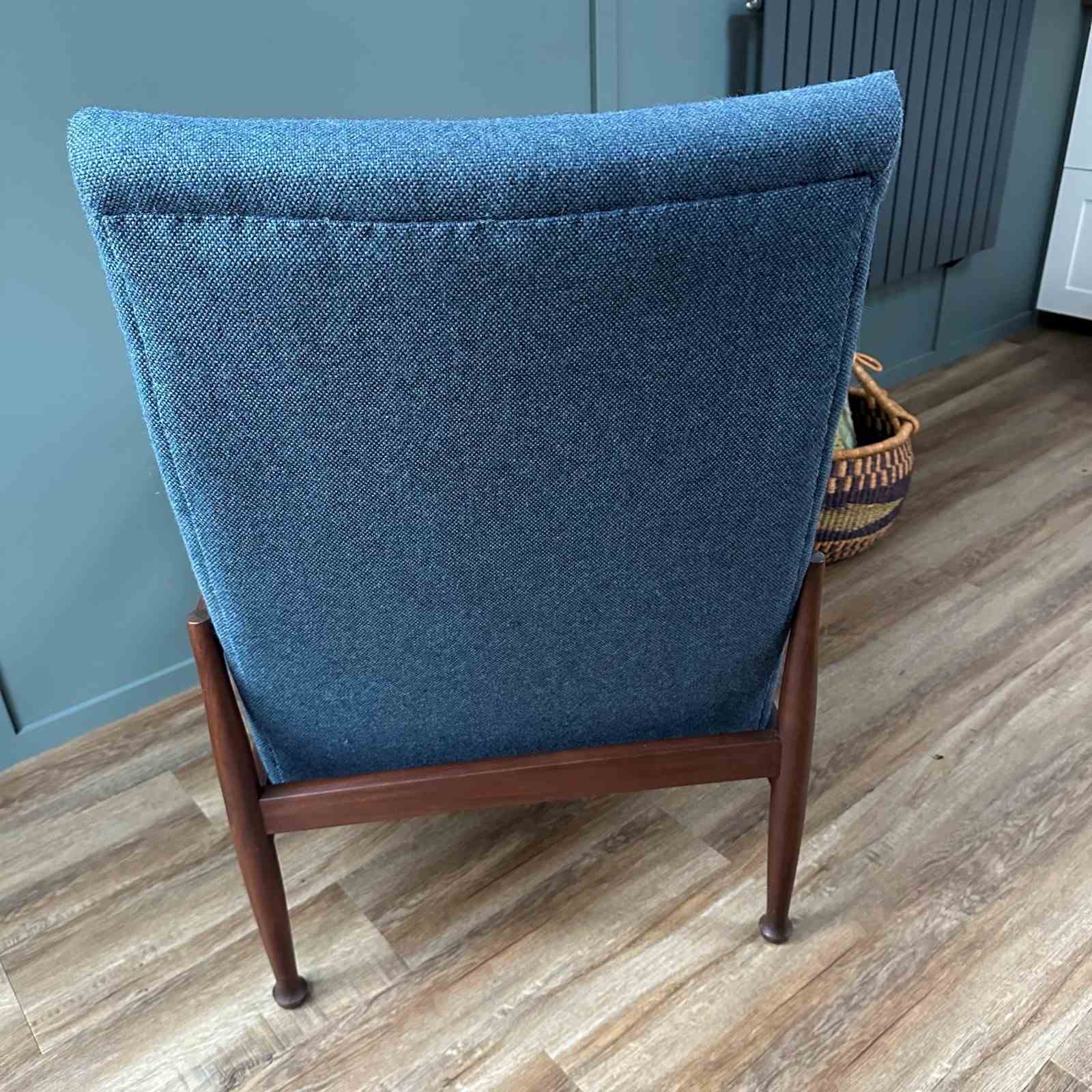 The chairs’ afrormosia frame is in very good vintage condition, showing some very light signs of use. The frame been cleaned and waxed, with the three adjustments working very well.
