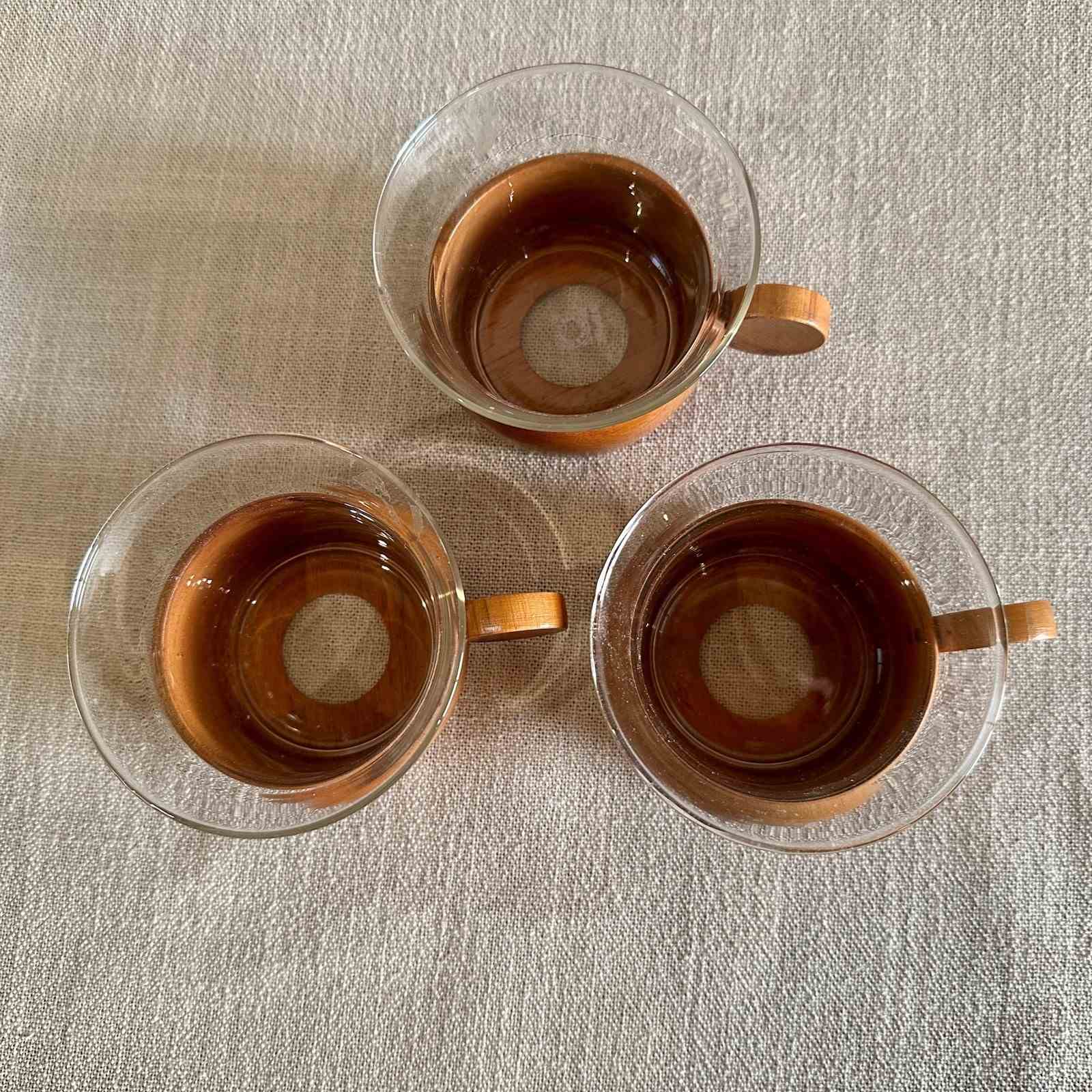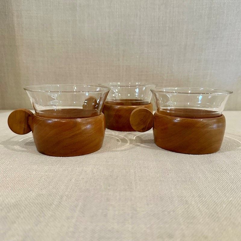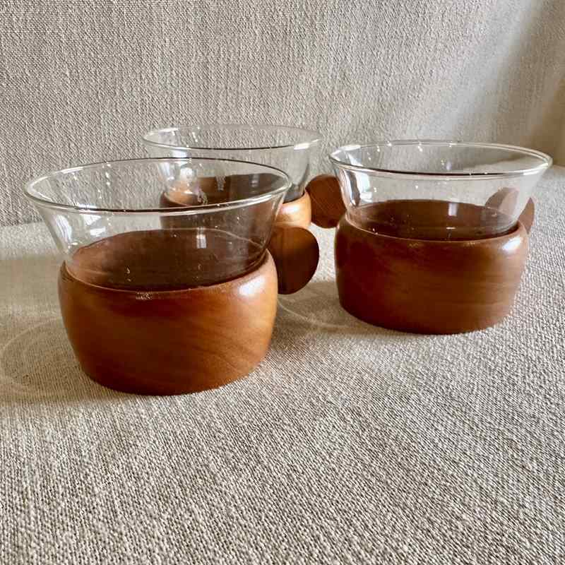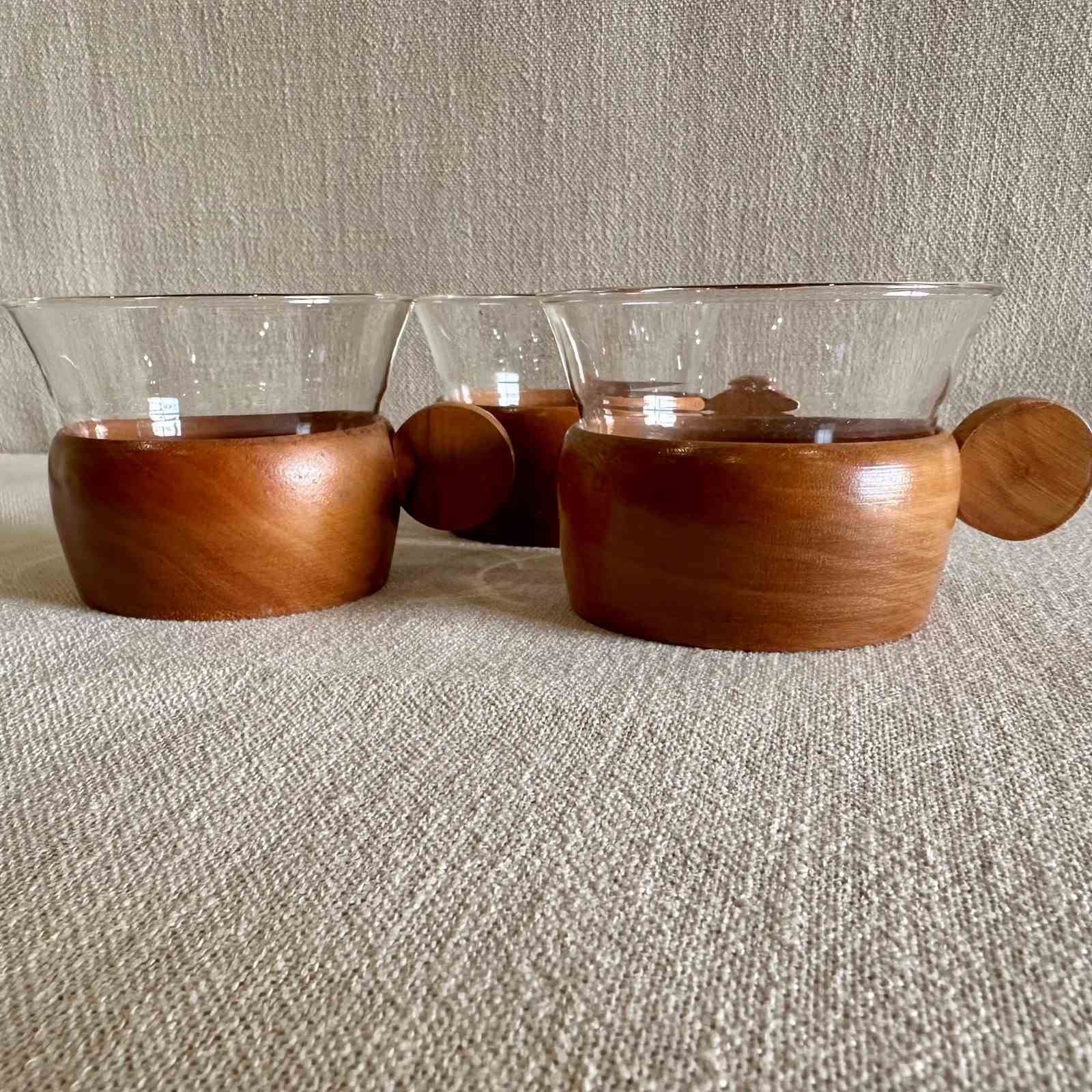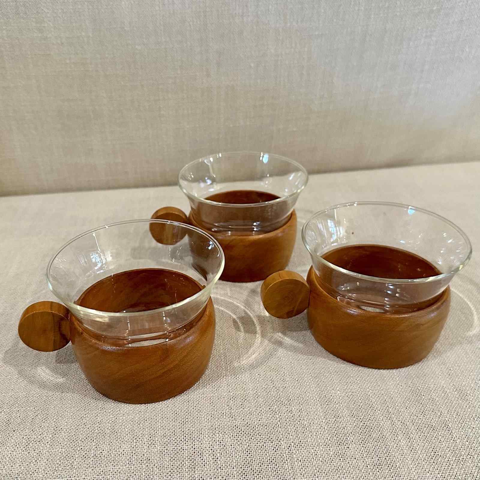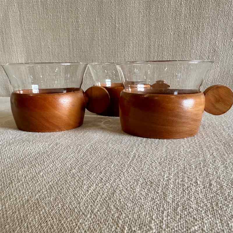 Set of 3 Teak and Glass Coffee cups.