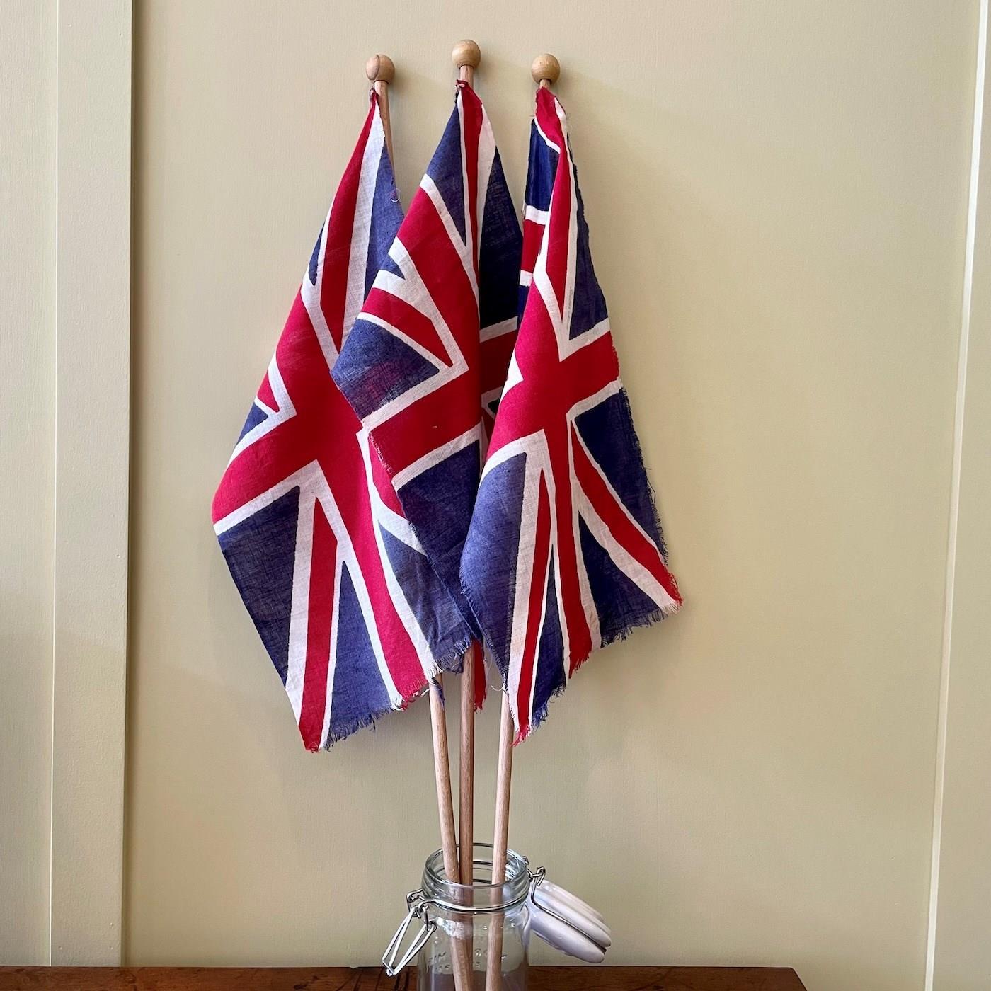 A set of three original handheld VE day Union Jack flags