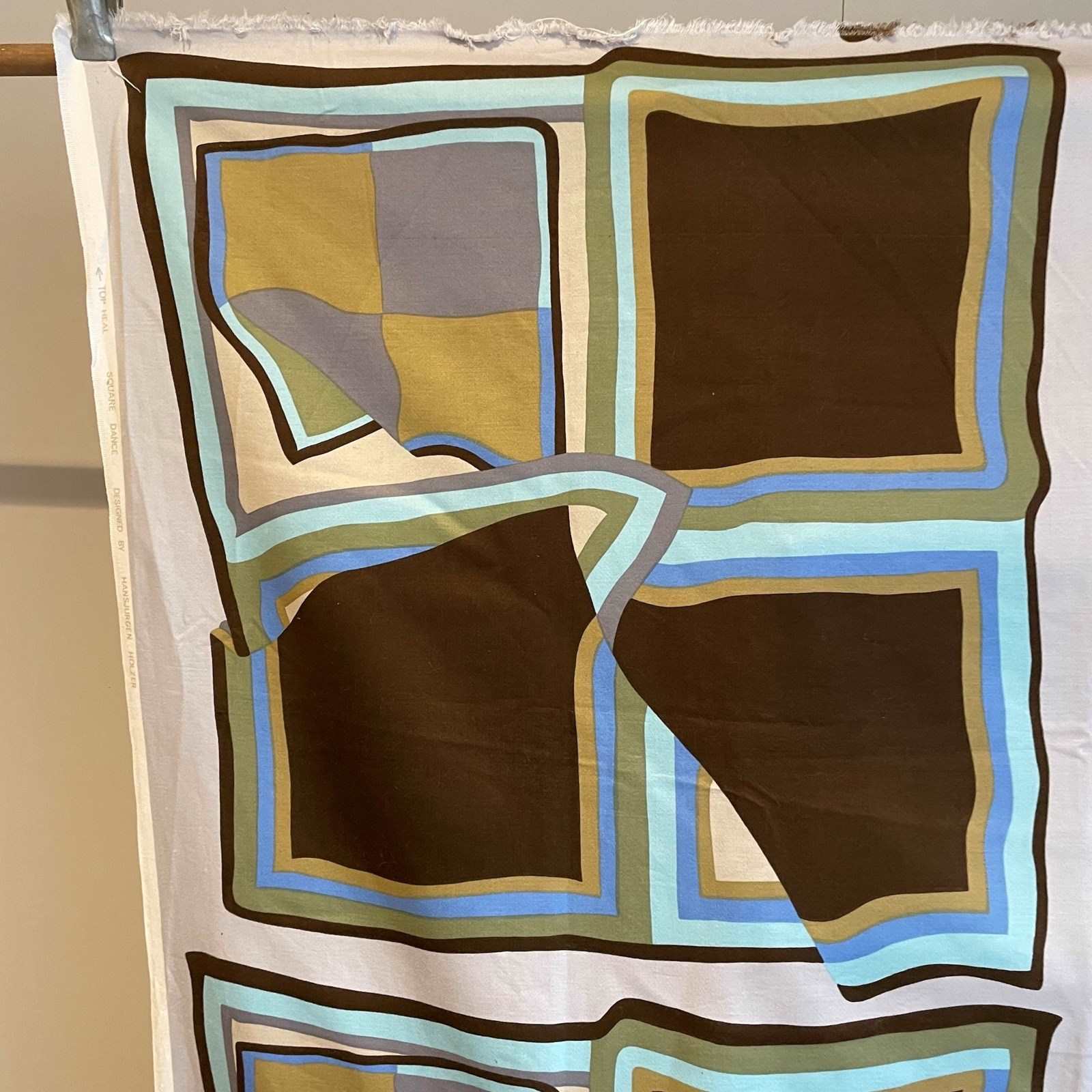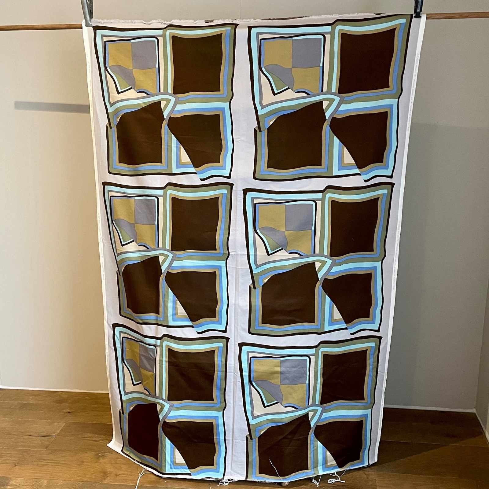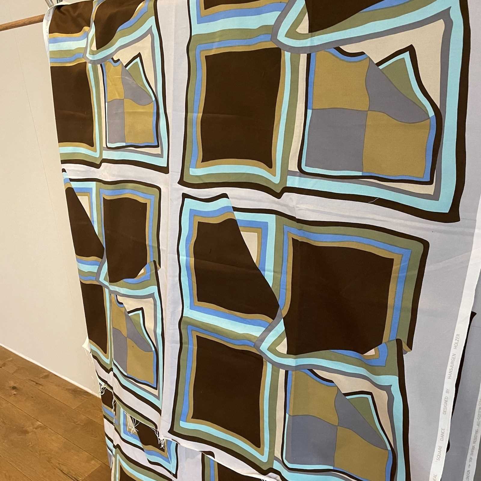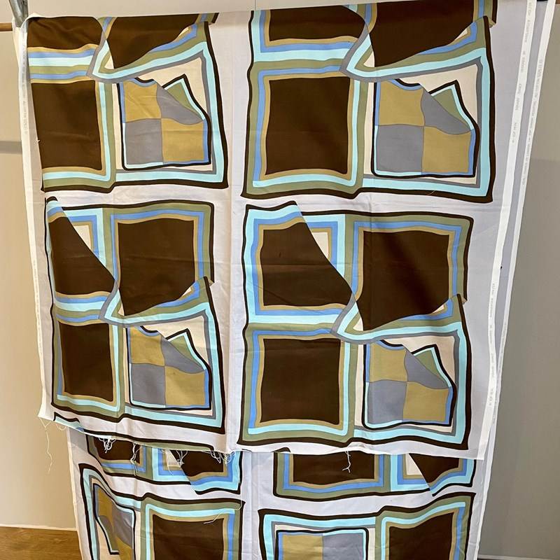 Furnishing fabric with a design of squares, twisted to give curving edges, in khaki, brown, blue, aquamarine on grey. Designed in 1980.
