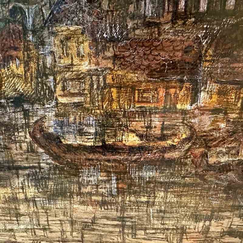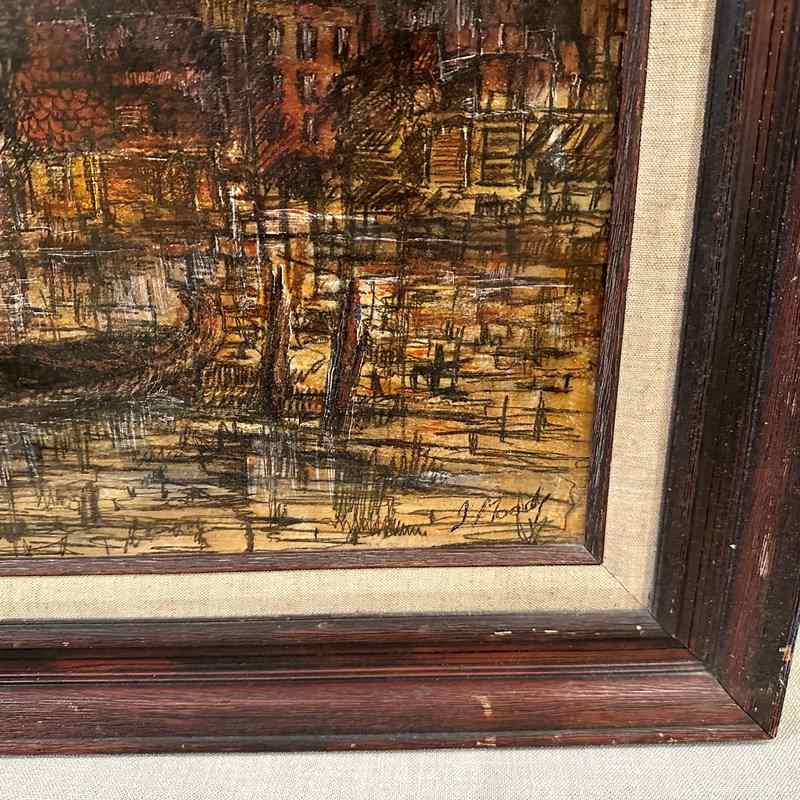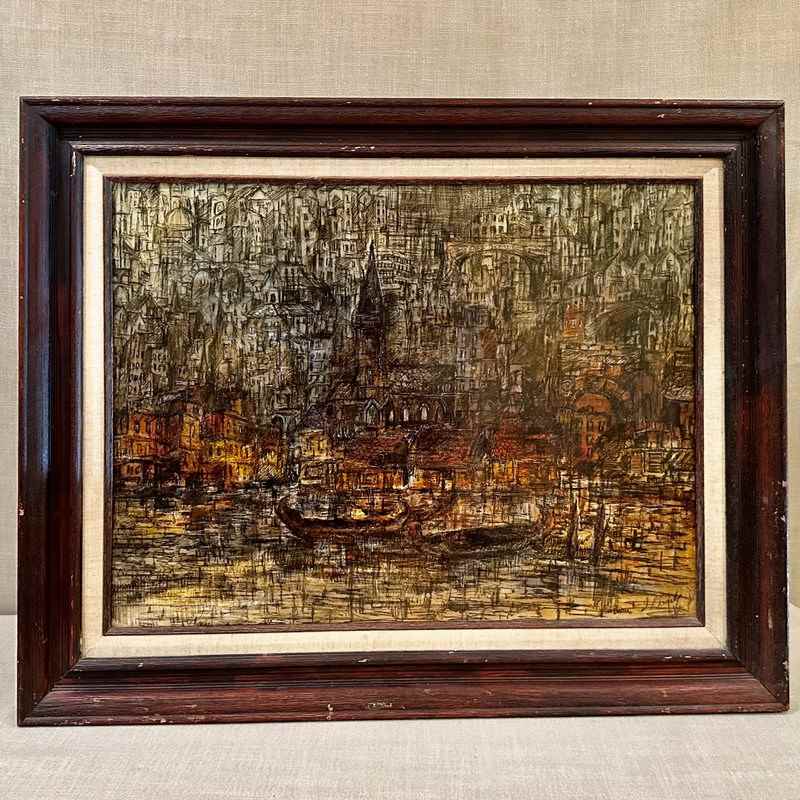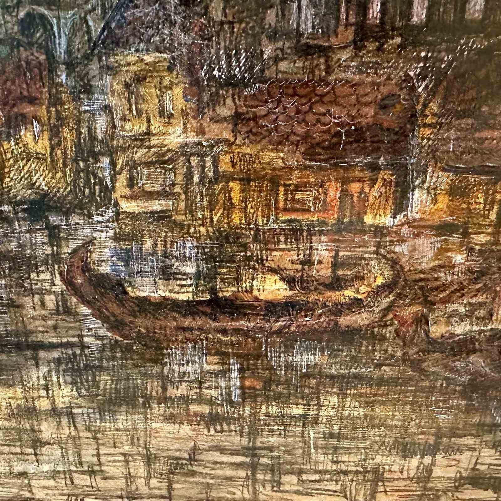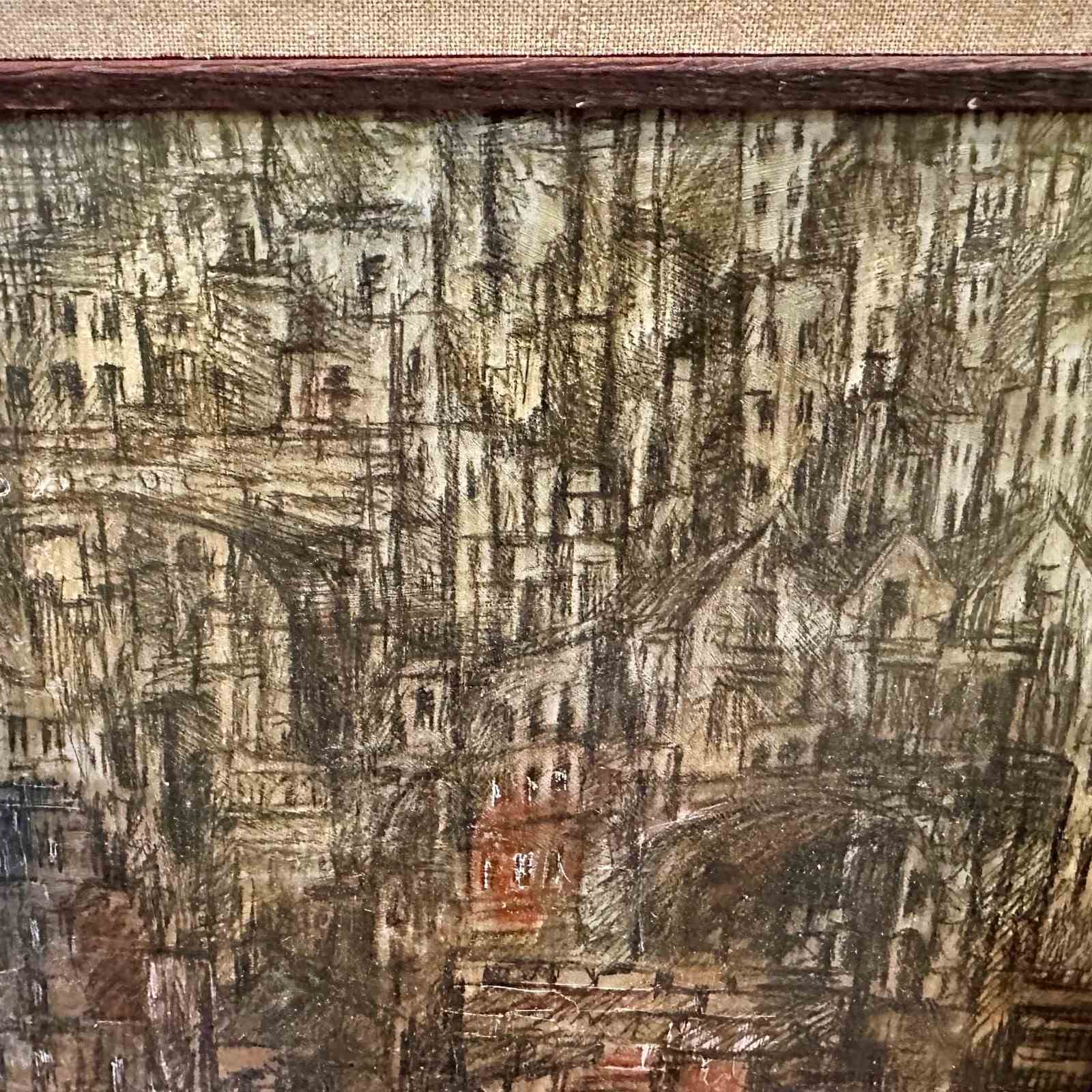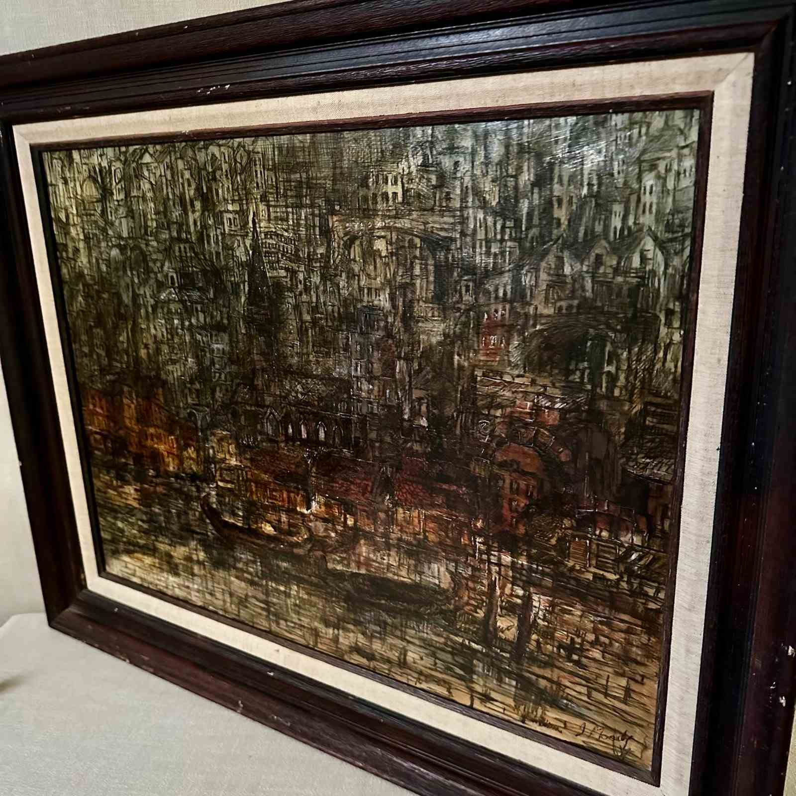 Large framed oil on board 1960’s painting of a detailed Medieval cityscape.