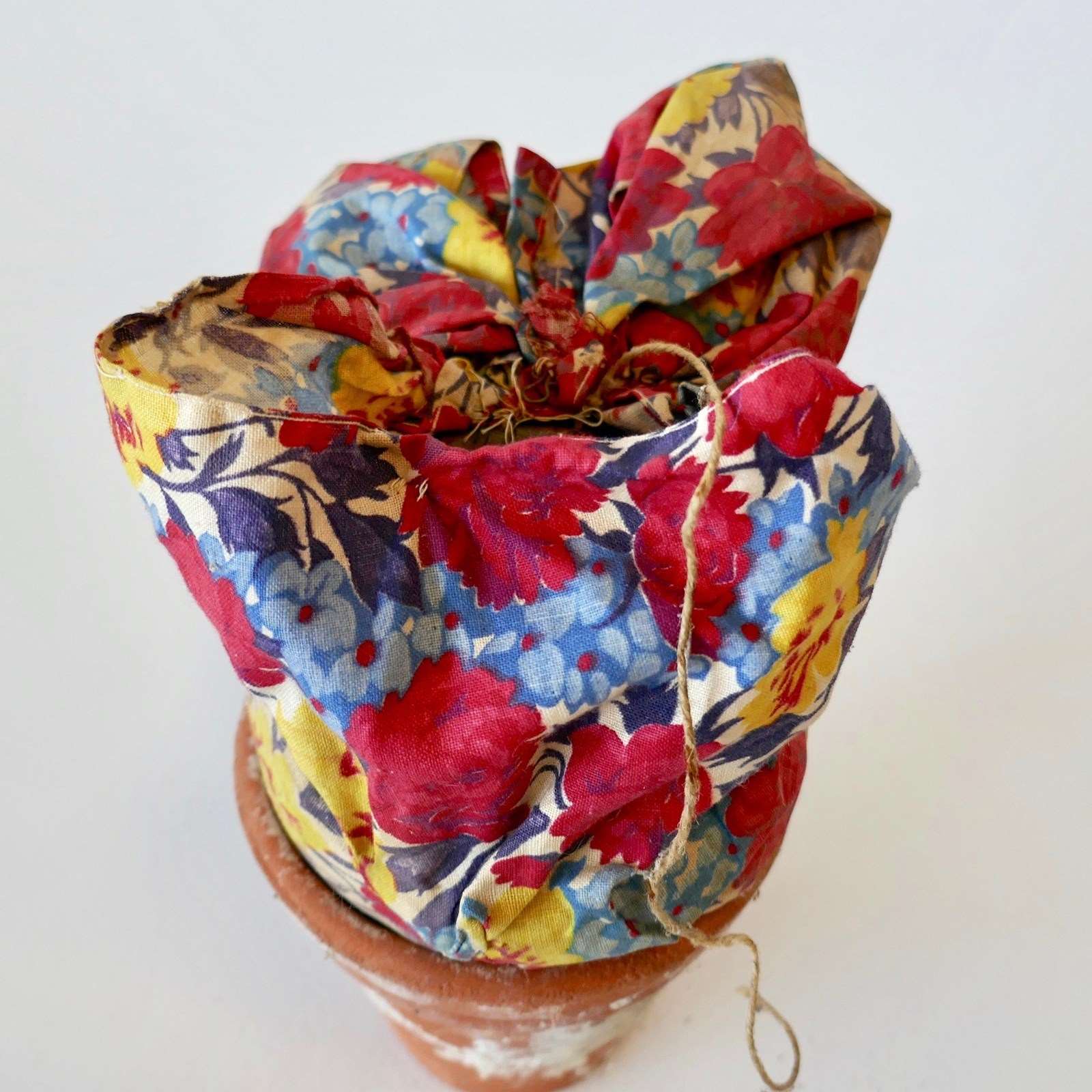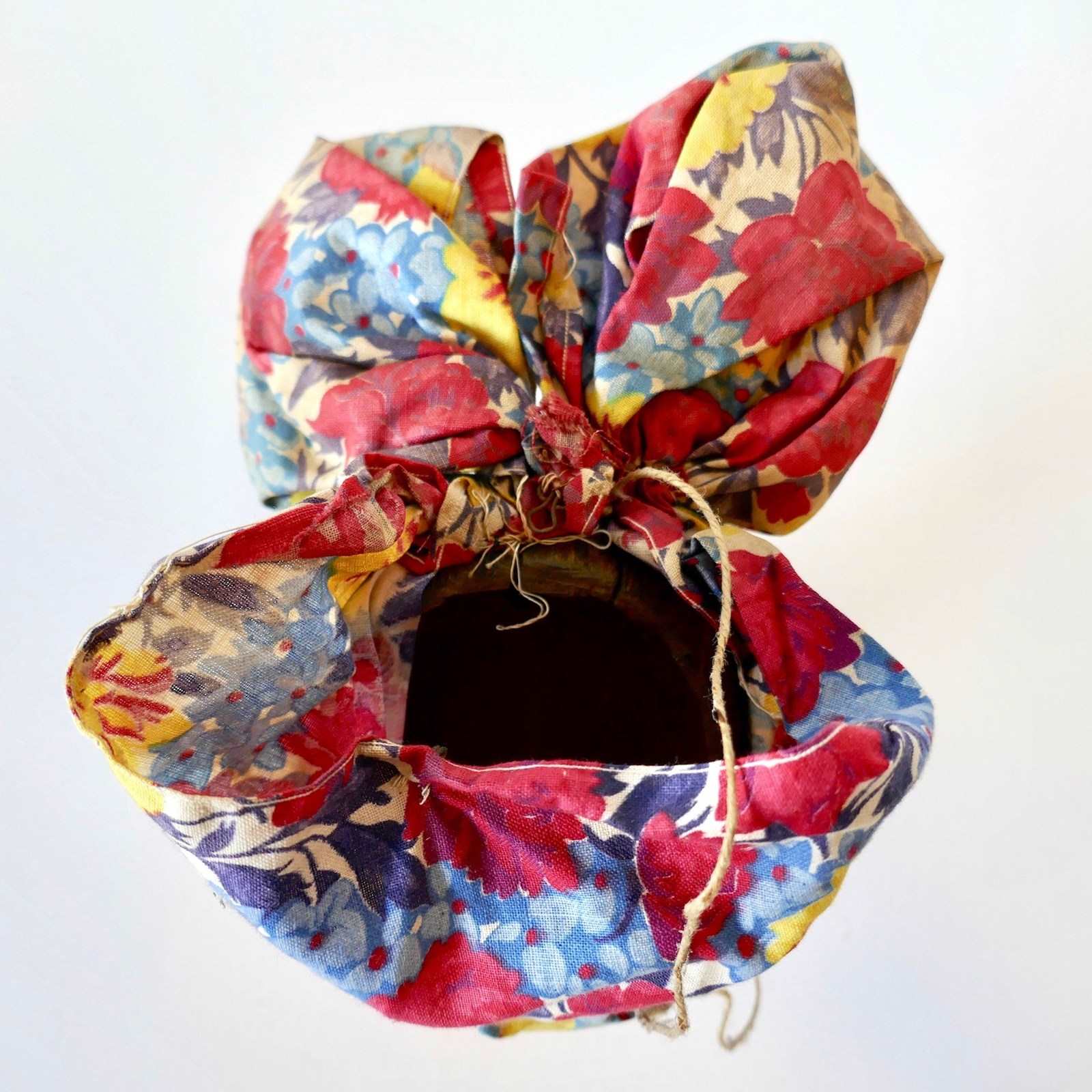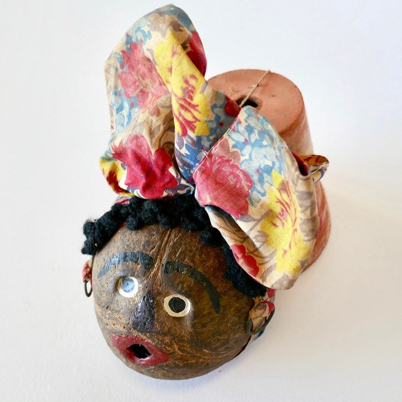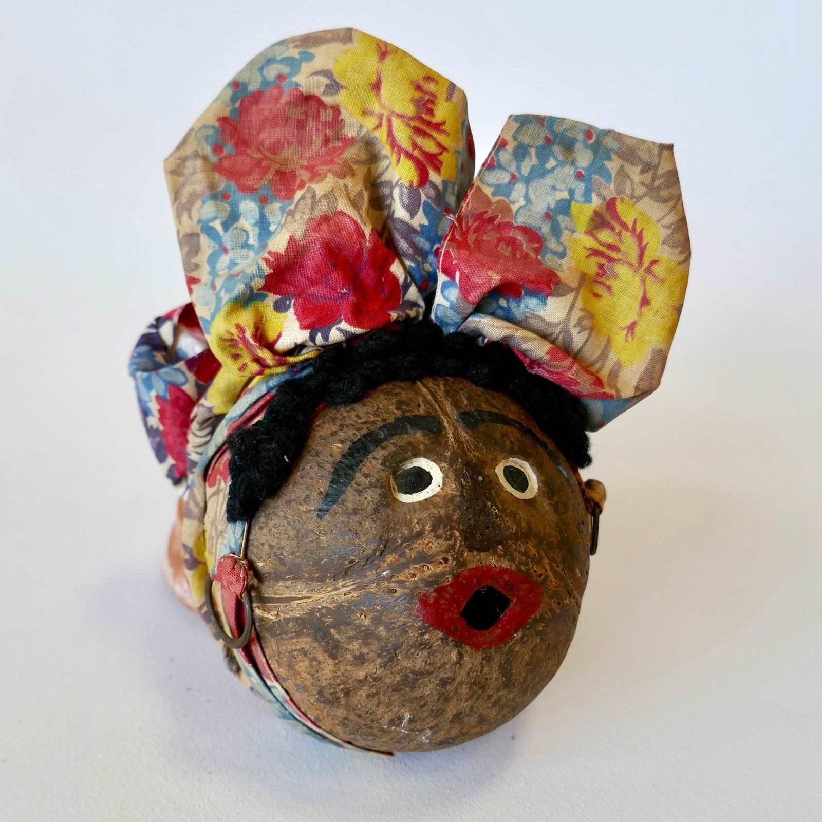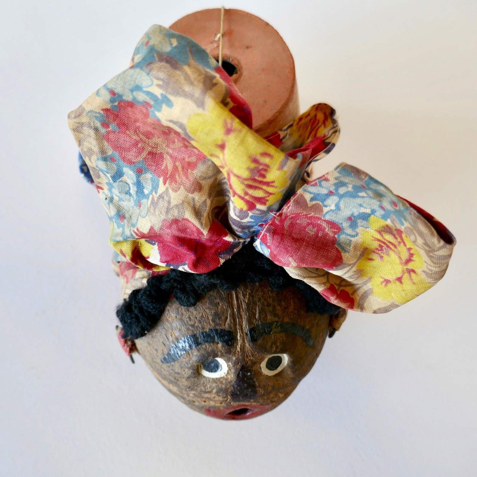 A hand made Jamaican folk art string holder. Made from upcycled and vintage pieces. The head scarf has been hand sewn from a really vibrant cotton print and closes at the back with a simple hook and eye. Hand painted with house paints the head is a coconut shell with wool hair and curtain ring earrings. A piece of string allows the holder to be hung from a kitchen shelf.