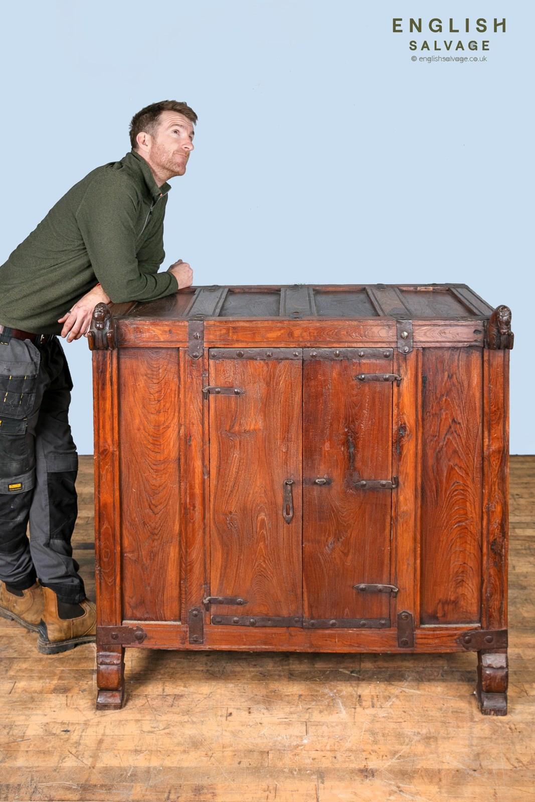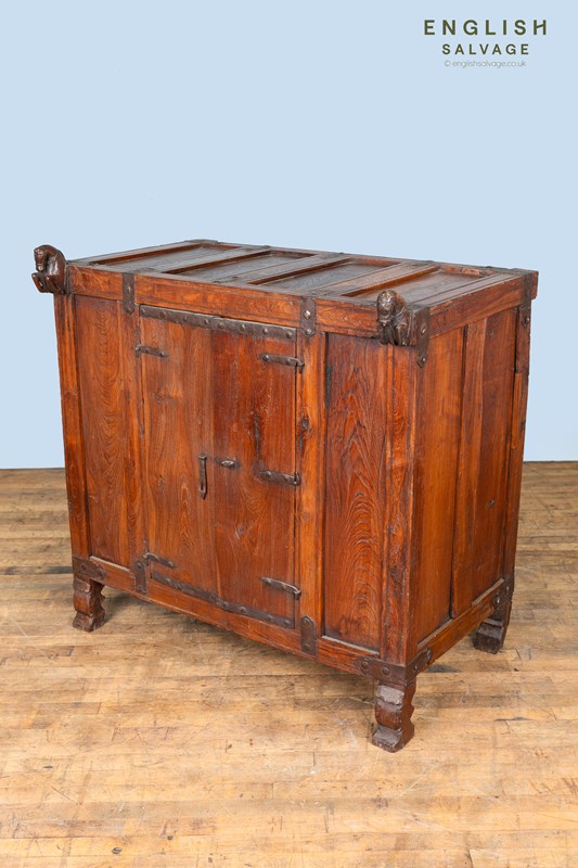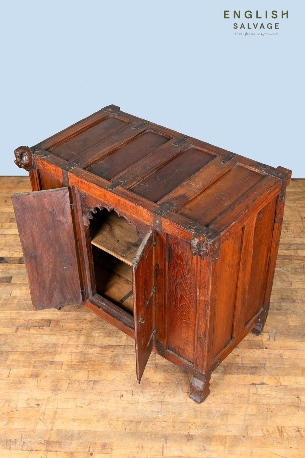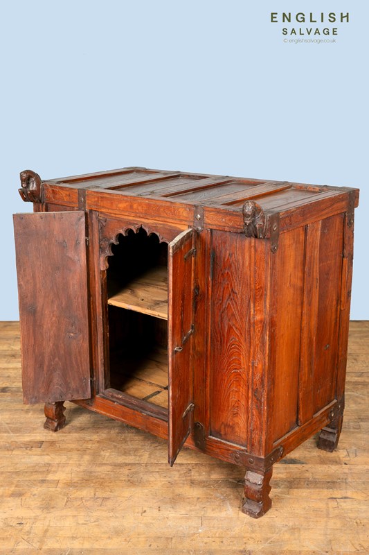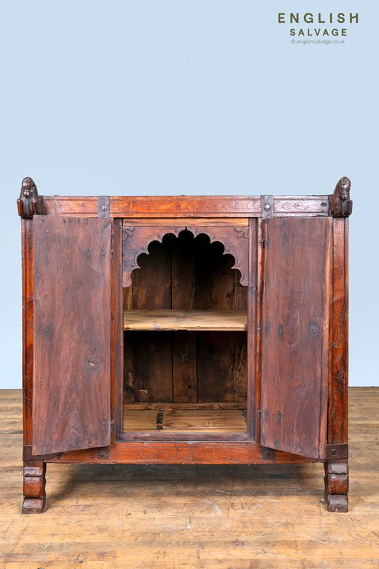 Reclaimed late 19th Century Indian merchant's cabinet. Carved teak horses to the front with arched detail inside. Lovely studded metal work and a deep, warm colour to the wood. Some signs of use, as can only be expected with age. This cabinet is from Uttar Pradesh.