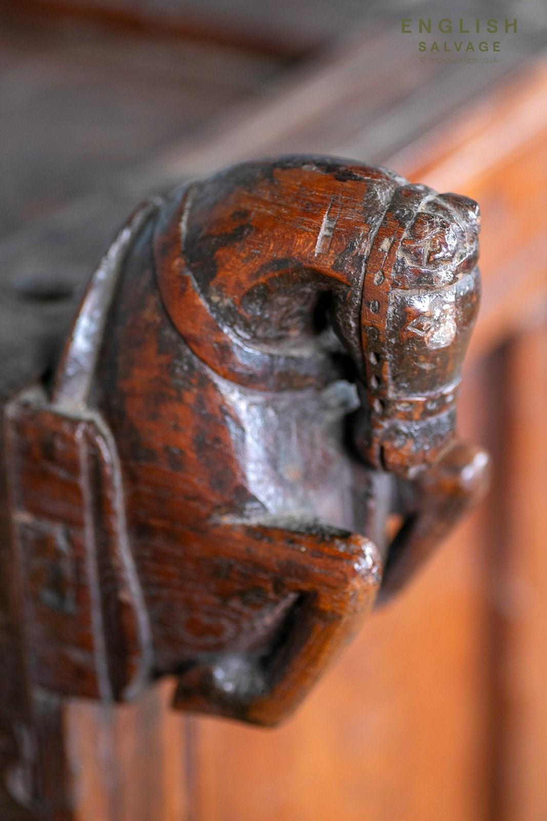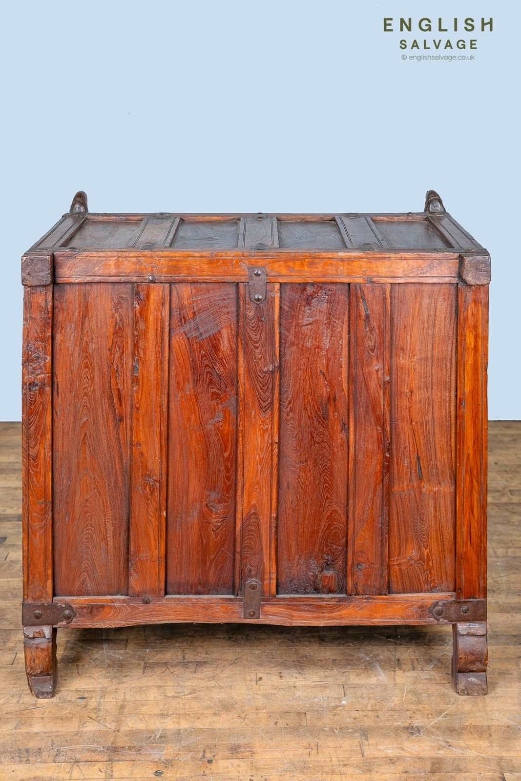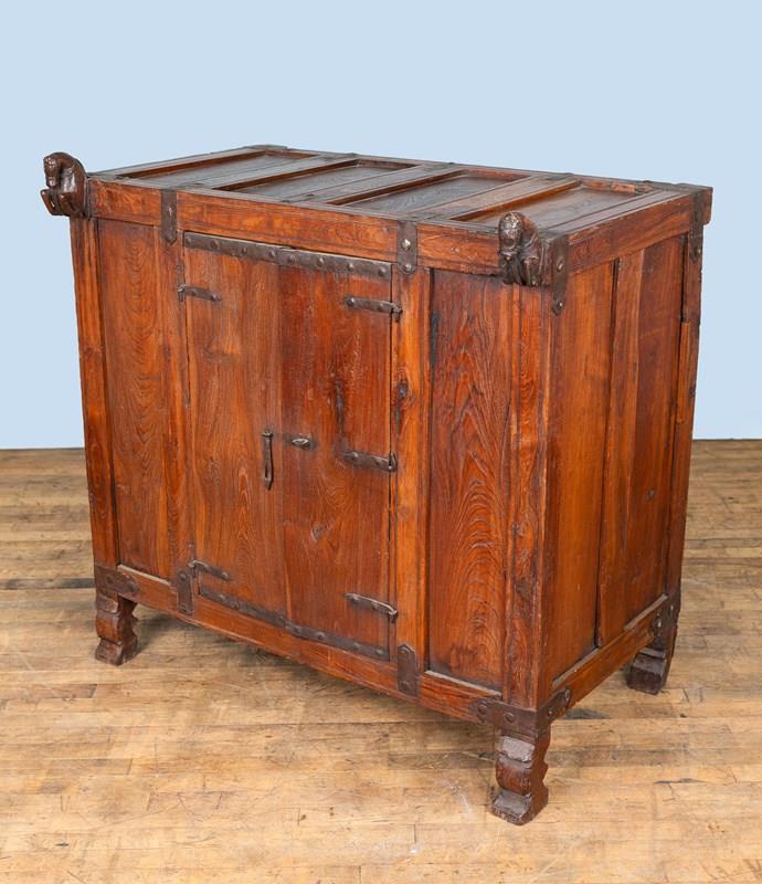 Reclaimed late 19th Century Indian merchant's cabinet. Carved teak horses to the front with arched detail inside. Lovely studded metal work and a deep, warm colour to the wood. Some signs of use, as can only be expected with age. This cabinet is from Uttar Pradesh.