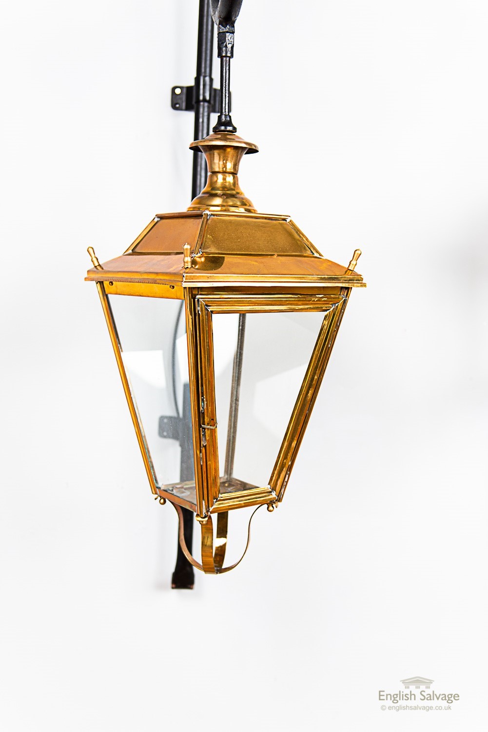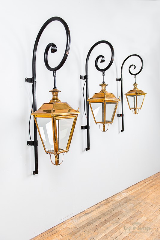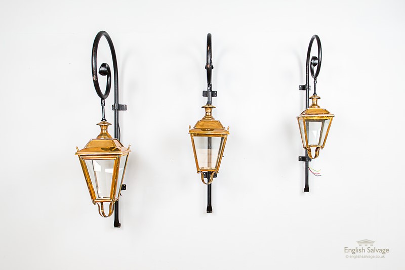 Three sizes of Victorian style wall hung copper lanterns on wrought iron crook brackets. Newly made. Small: 24.5cmW x 123.5cmH x 48cmD. Costs £275 each Medium: 30.5cmW x 147cmH x 55cmD. Costs £385 each Large: 33.5cmW x 153.5cmH x 70cmD. Costs £425 each All electrical work/installation must be undertaken by a qualified electrician. We cannot insure glass in transit - please refer to our Delivery page