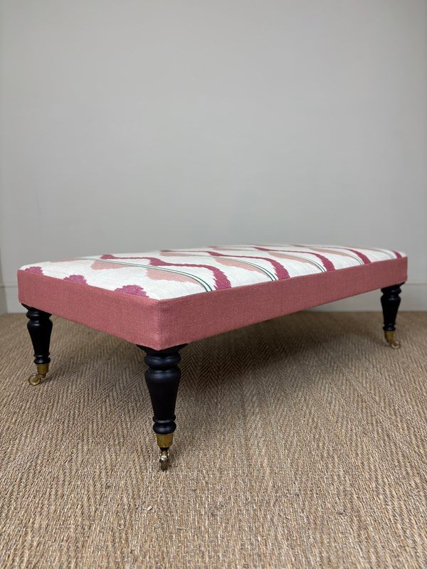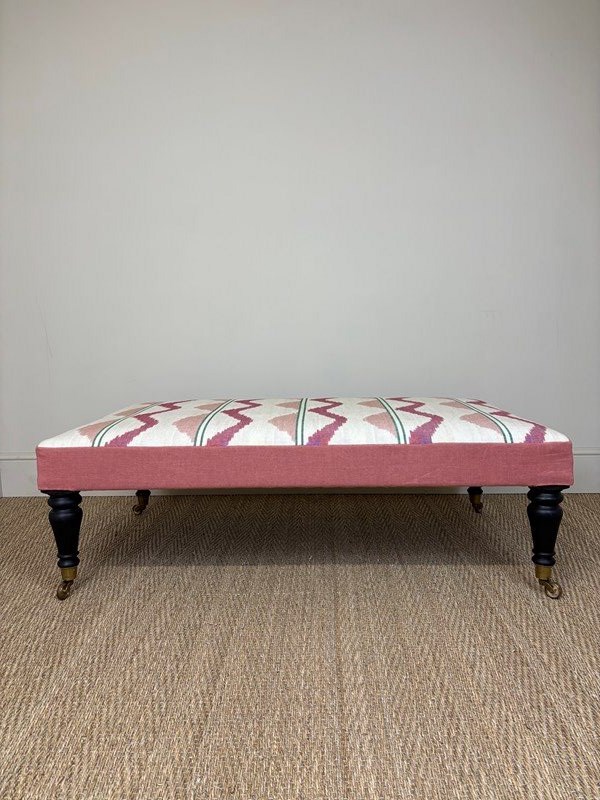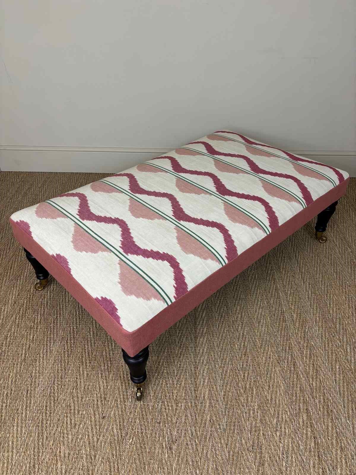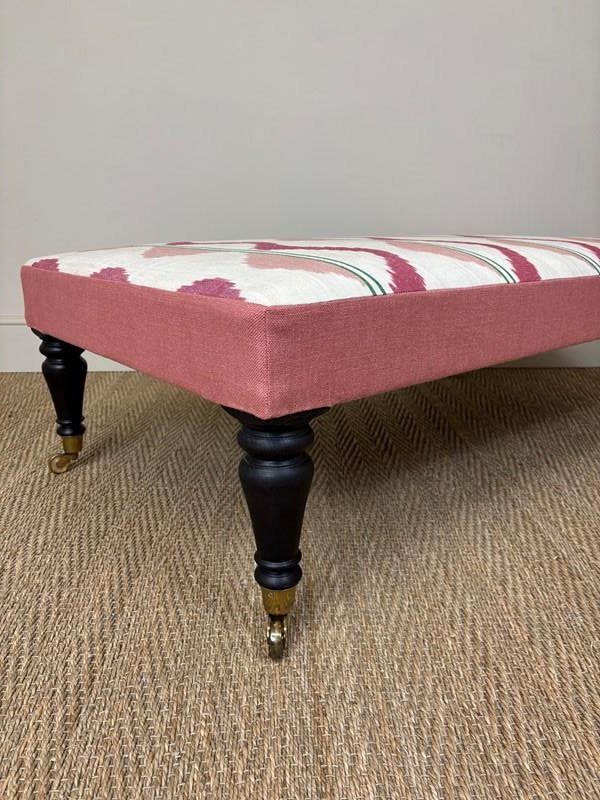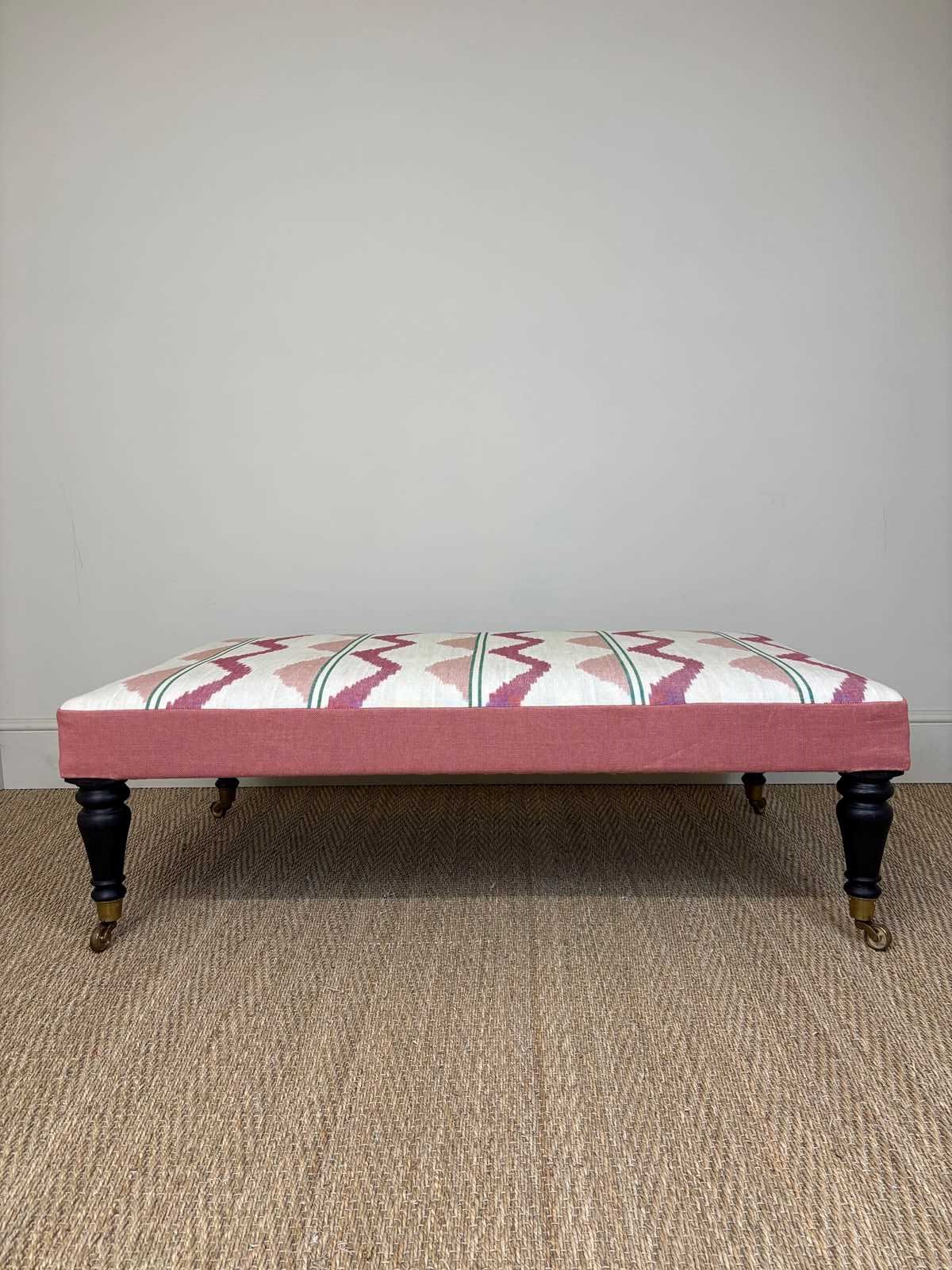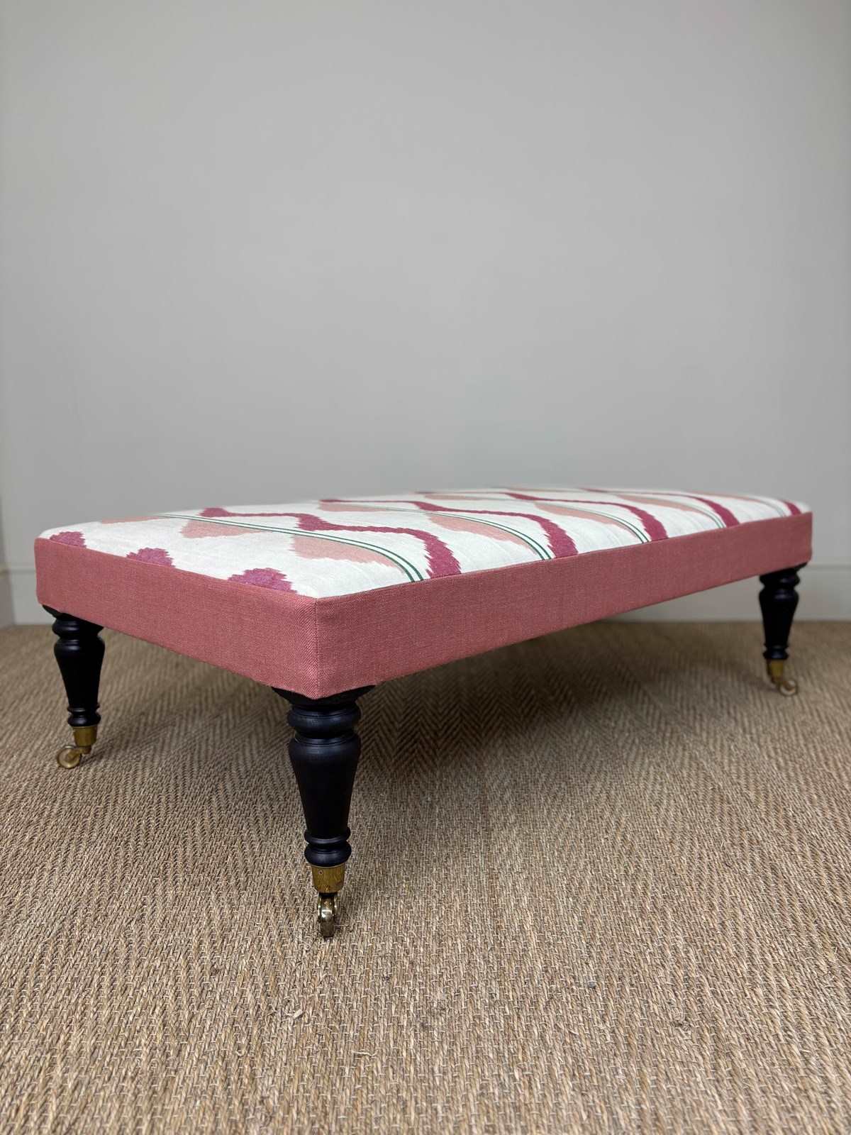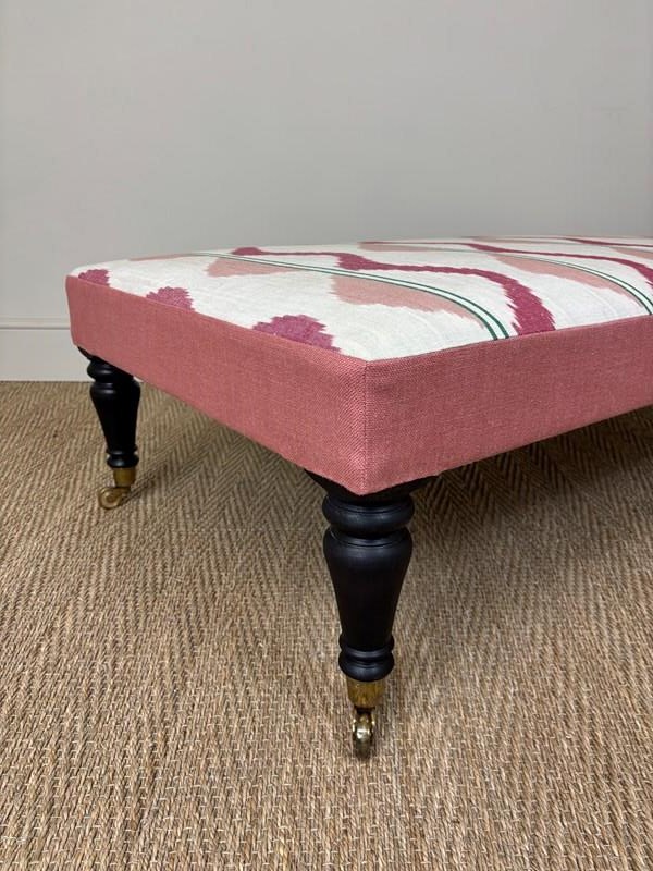 Traditionally Upholstered footstool in our St Eval design. A solid beech frame raised on beautiful turned legs which have been built into the frame and an antique brass castor. Layers of hand teased hair and coir, finished with hand sewn rolled edges offering optimum durability and comfort.